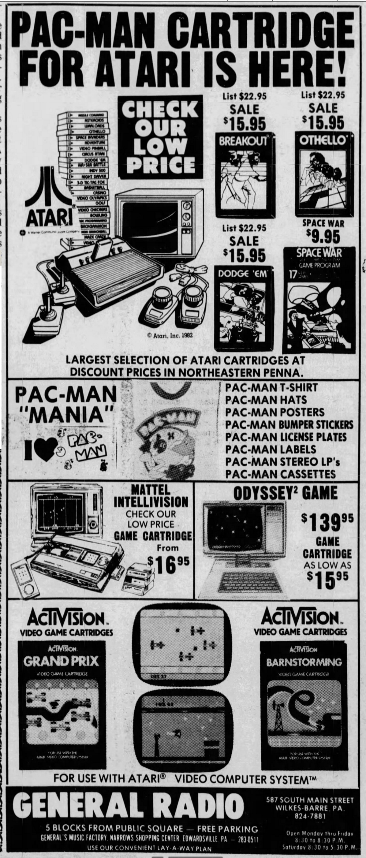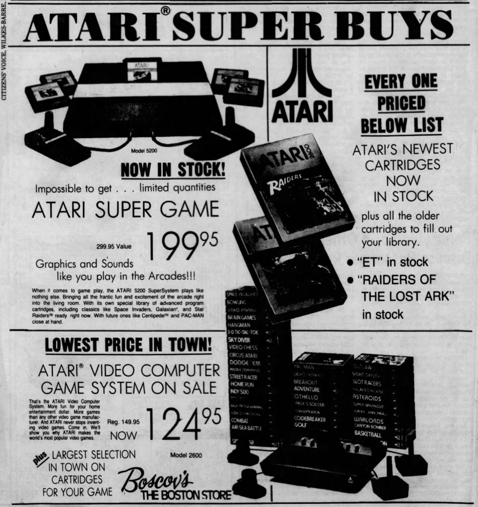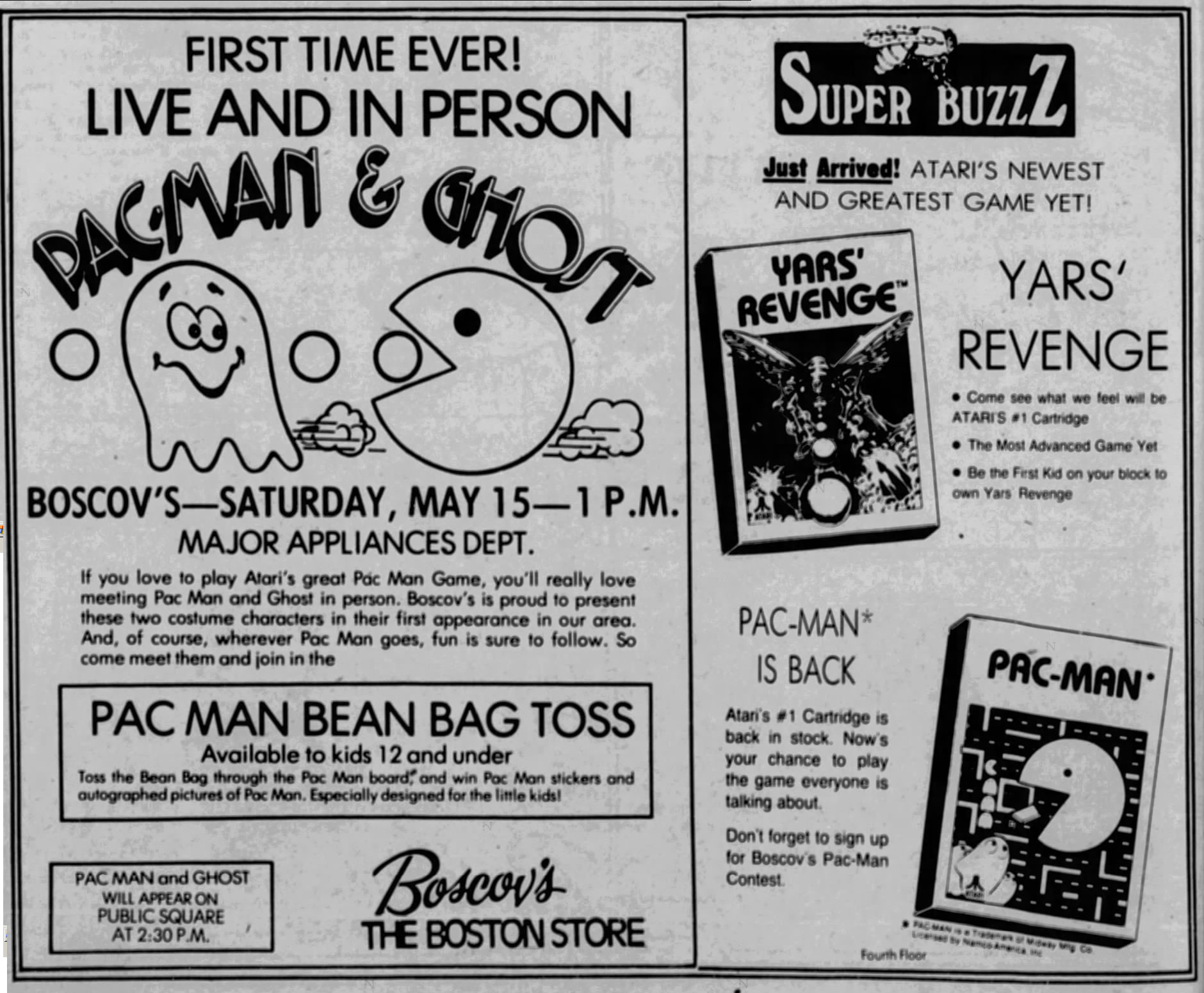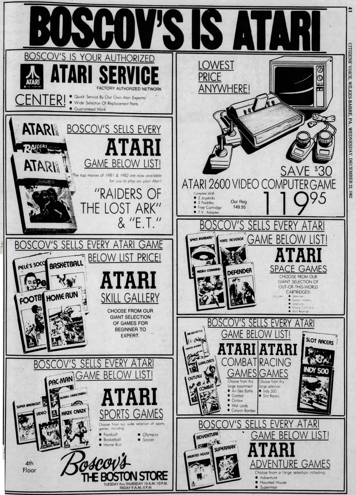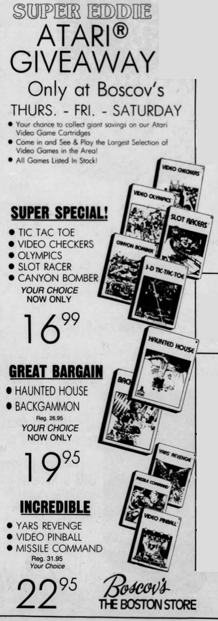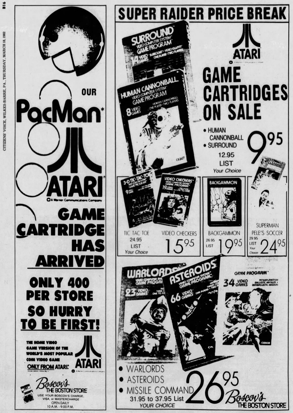 Thanks to the online archive Newspapers.com, an increasing number of newspaper archives that were previously only available on microfilm in select libraries are being scanned and digitized and made available online. The site recently added 1 of 2 local newspapers in my area, The Citizens' Voice, and I recently completed collecting every ad featuring Atari's systems and games from it. I've chosen all the Atari ads that ran between 1980 and 1984 from the 2 stores in my area that were *the* places to find the latest games, and who offered the largest selection of games - Boscov's and General Radio. Boscov's is a chain department store, and the location near me, in Wilkes-Barre, PA, was originally known as The Boston Store until it was purchased by Al Boscov. General Radio was an appliance store for large items like refrigerators, washers/dryers, and TVs, and was located a few blocks away on the same street as Boscov's. Both were quite aggressive in their advertising, and Boscov's in particular promoted Atari high score competitions in their stores and even sponsored a parade celebrating the release of Atari's VCS Pac-Man, and a visit from Pac-Man himself! These ads also serve to help determine more accurate release dates for games, as well as reveal the immediate effects of the market's crash as is unfolded over the last 18 months of Atari, Inc.'s existence.