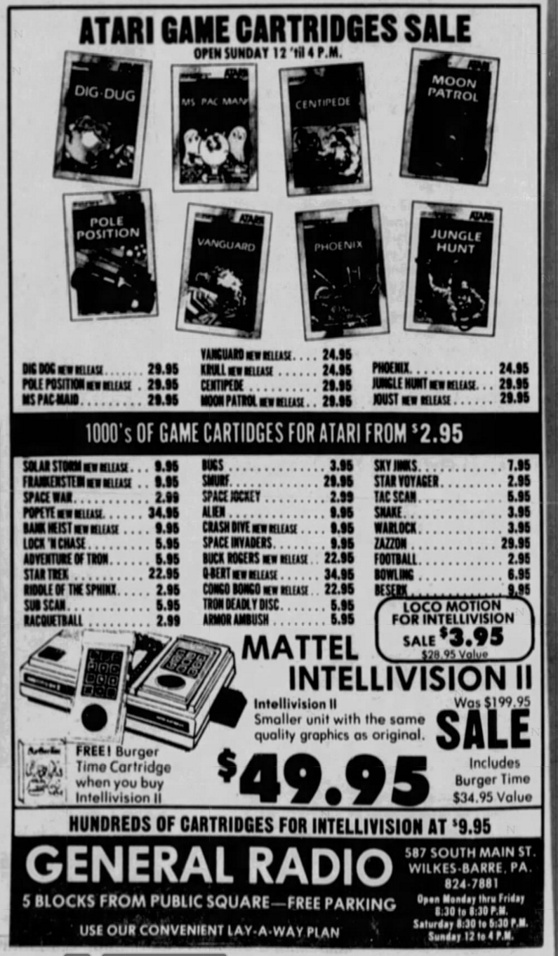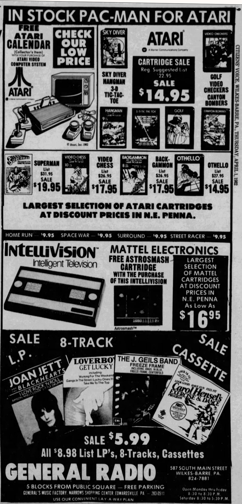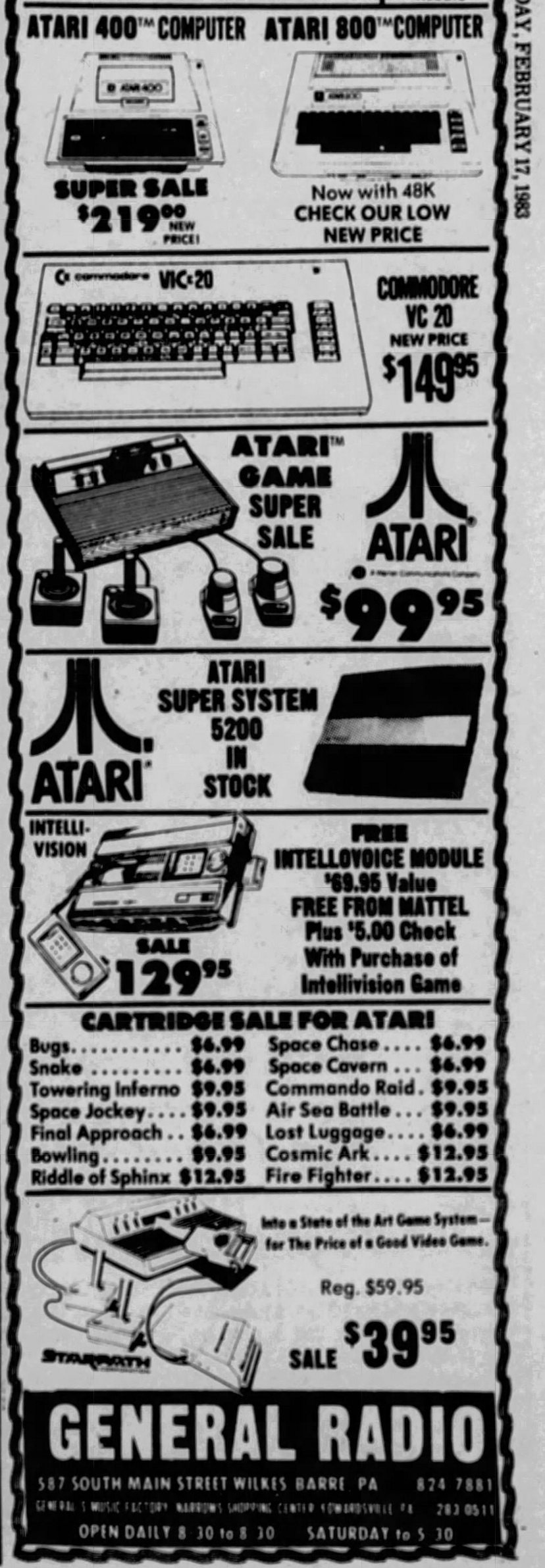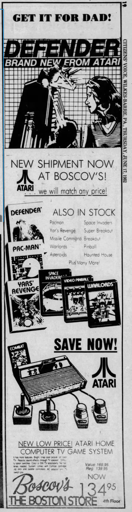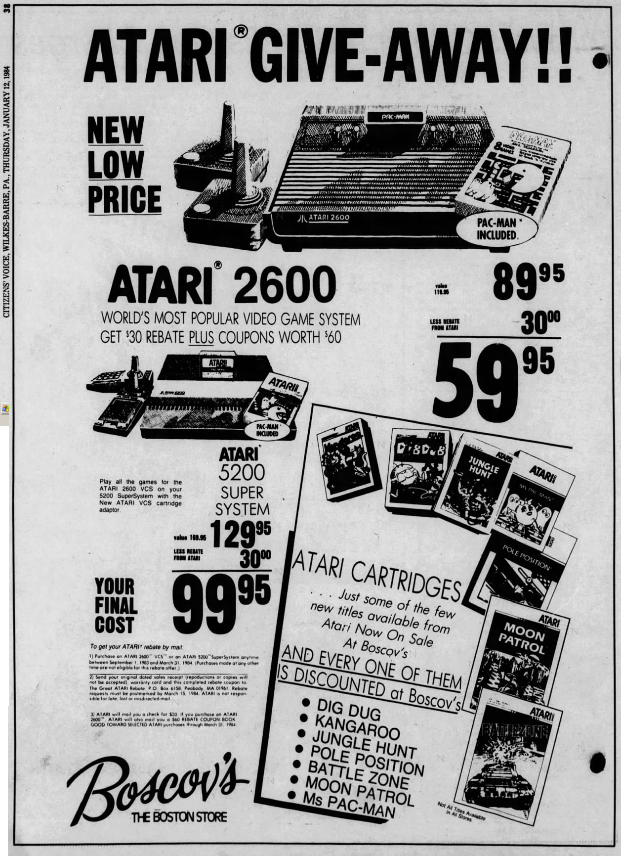 Thanks to the online archive Newspapers.com, an increasing number of newspaper archives that were previously only available on microfilm in select libraries are being scanned and digitized and made available online. The site recently added 1 of 2 local newspapers in my area, The Citizens' Voice, and I recently completed collecting every ad featuring Atari's systems and games from it. I've chosen all the Atari ads that ran between 1980 and 1984 from the 2 stores in my area that were *the* places to find the latest games, and who offered the largest selection of games - Boscov's and General Radio. Boscov's is a chain department store, and the location near me, in Wilkes-Barre, PA, was originally known as The Boston Store until it was purchased by Al Boscov. General Radio was an appliance store for large items like refrigerators, washers/dryers, and TVs, and was located a few blocks away on the same street as Boscov's. Both were quite aggressive in their advertising, and Boscov's in particular promoted Atari high score competitions in their stores and even sponsored a parade celebrating the release of Atari's VCS Pac-Man, and a visit from Pac-Man himself! These ads also serve to help determine more accurate release dates for games, as well as reveal the immediate effects of the market's crash as is unfolded over the last 18 months of Atari, Inc.'s existence.