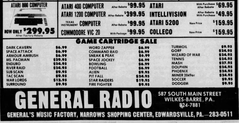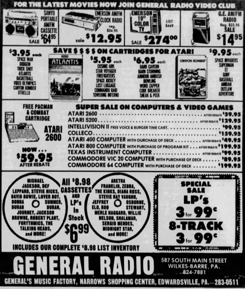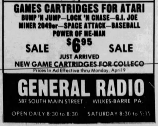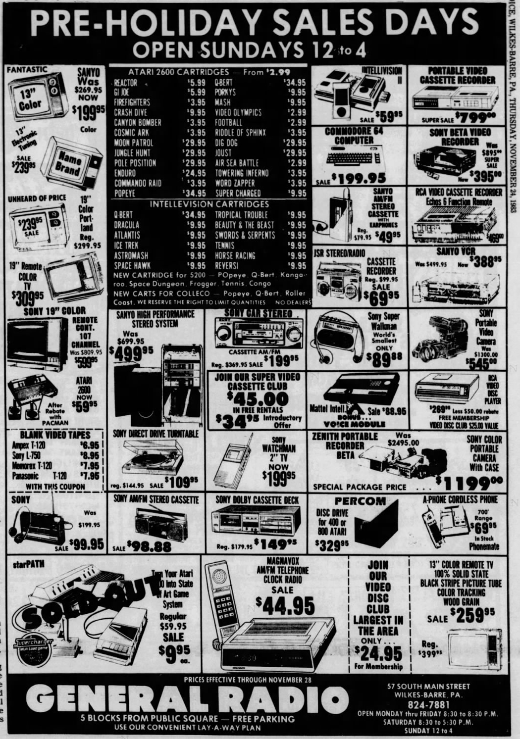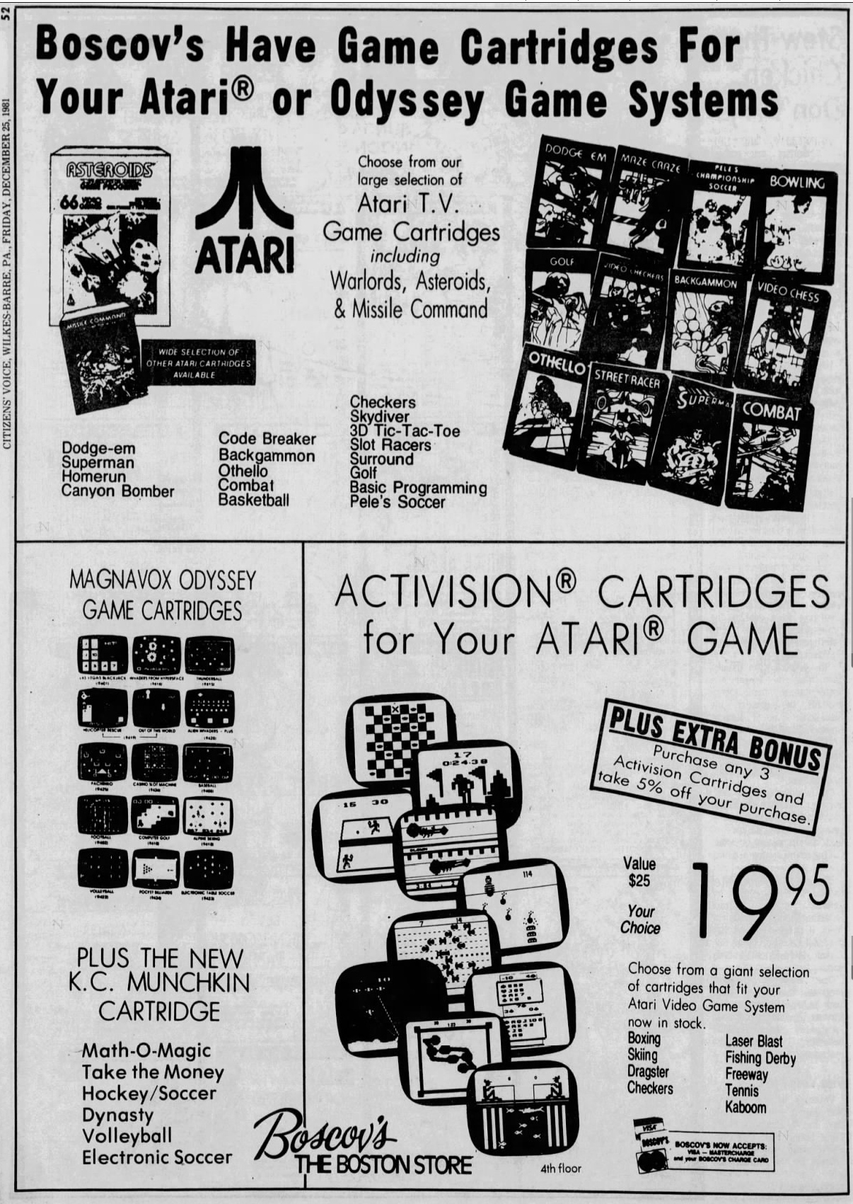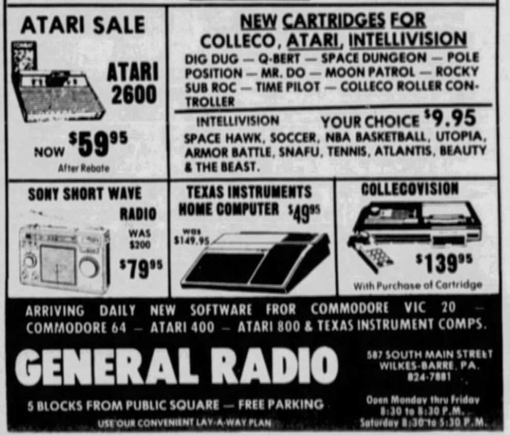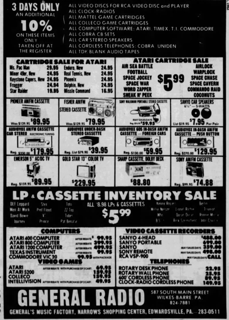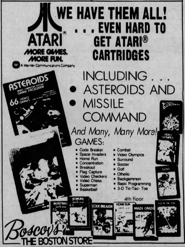 Thanks to the online archive Newspapers.com, an increasing number of newspaper archives that were previously only available on microfilm in select libraries are being scanned and digitized and made available online. The site recently added 1 of 2 local newspapers in my area, The Citizens' Voice, and I recently completed collecting every ad featuring Atari's systems and games from it. I've chosen all the Atari ads that ran between 1980 and 1984 from the 2 stores in my area that were *the* places to find the latest games, and who offered the largest selection of games - Boscov's and General Radio. Boscov's is a chain department store, and the location near me, in Wilkes-Barre, PA, was originally known as The Boston Store until it was purchased by Al Boscov. General Radio was an appliance store for large items like refrigerators, washers/dryers, and TVs, and was located a few blocks away on the same street as Boscov's. Both were quite aggressive in their advertising, and Boscov's in particular promoted Atari high score competitions in their stores and even sponsored a parade celebrating the release of Atari's VCS Pac-Man, and a visit from Pac-Man himself! These ads also serve to help determine more accurate release dates for games, as well as reveal the immediate effects of the market's crash as is unfolded over the last 18 months of Atari, Inc.'s existence.