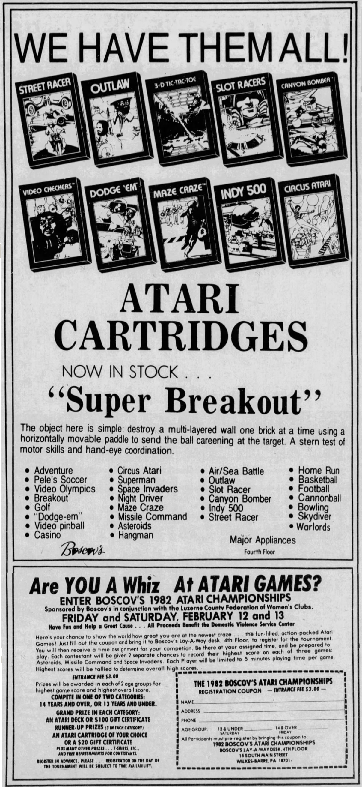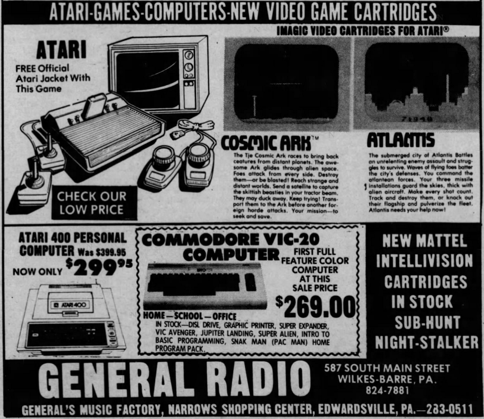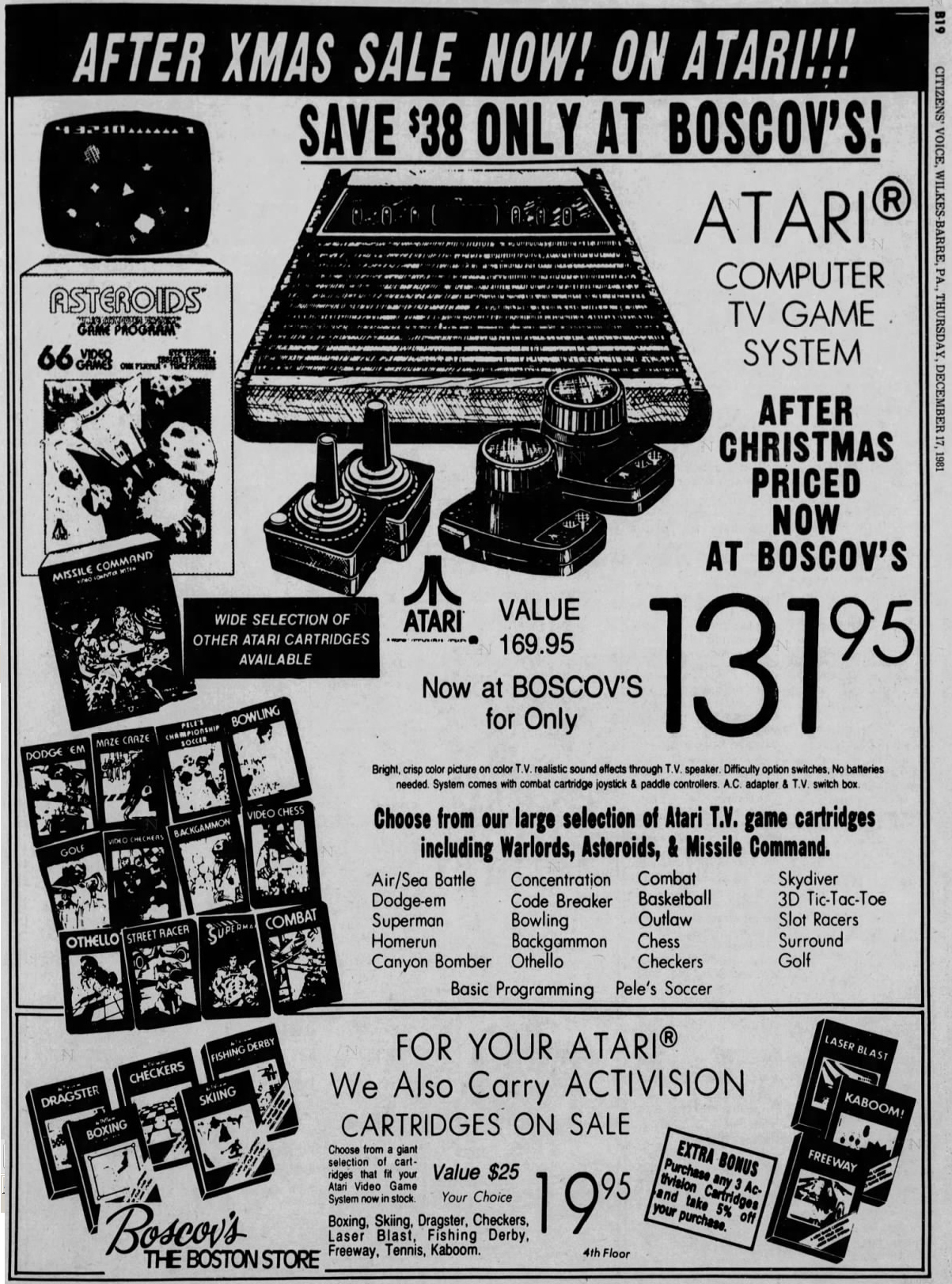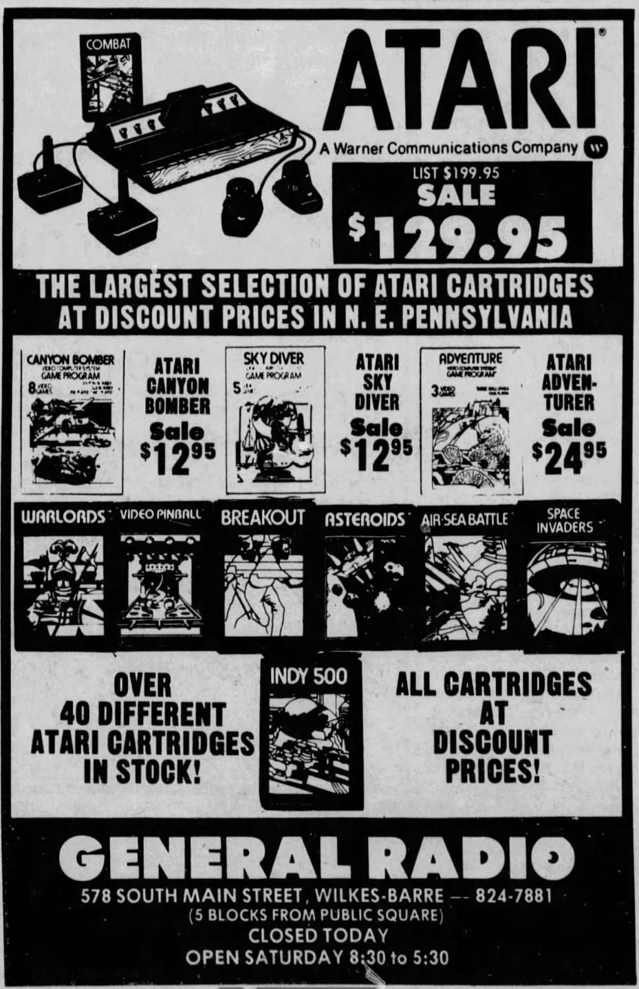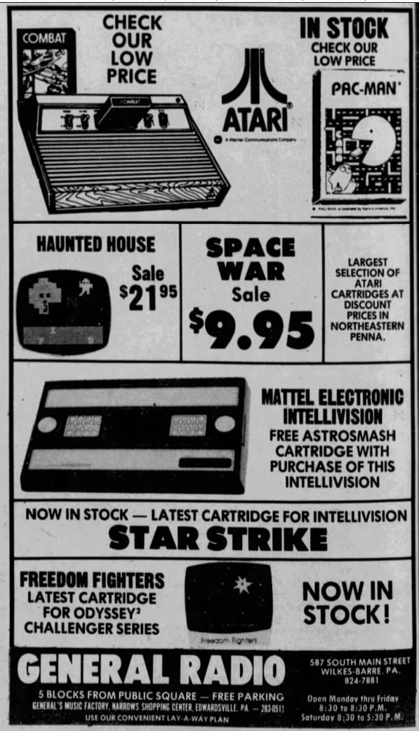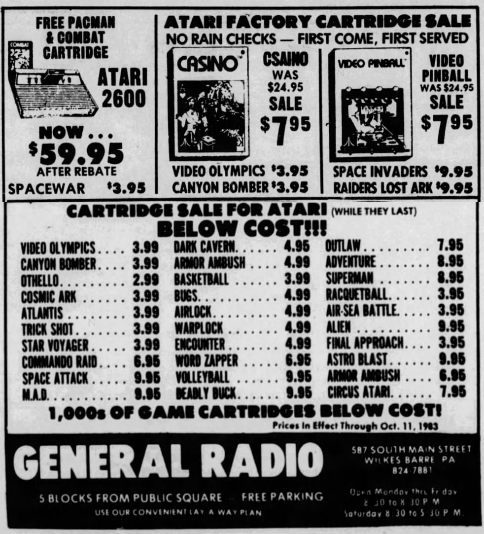 Thanks to the online archive Newspapers.com, an increasing number of newspaper archives that were previously only available on microfilm in select libraries are being scanned and digitized and made available online. The site recently added 1 of 2 local newspapers in my area, The Citizens' Voice, and I recently completed collecting every ad featuring Atari's systems and games from it. I've chosen all the Atari ads that ran between 1980 and 1984 from the 2 stores in my area that were *the* places to find the latest games, and who offered the largest selection of games - Boscov's and General Radio. Boscov's is a chain department store, and the location near me, in Wilkes-Barre, PA, was originally known as The Boston Store until it was purchased by Al Boscov. General Radio was an appliance store for large items like refrigerators, washers/dryers, and TVs, and was located a few blocks away on the same street as Boscov's. Both were quite aggressive in their advertising, and Boscov's in particular promoted Atari high score competitions in their stores and even sponsored a parade celebrating the release of Atari's VCS Pac-Man, and a visit from Pac-Man himself! These ads also serve to help determine more accurate release dates for games, as well as reveal the immediate effects of the market's crash as is unfolded over the last 18 months of Atari, Inc.'s existence.
