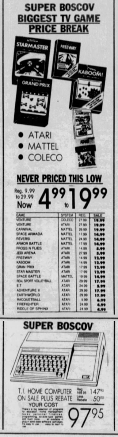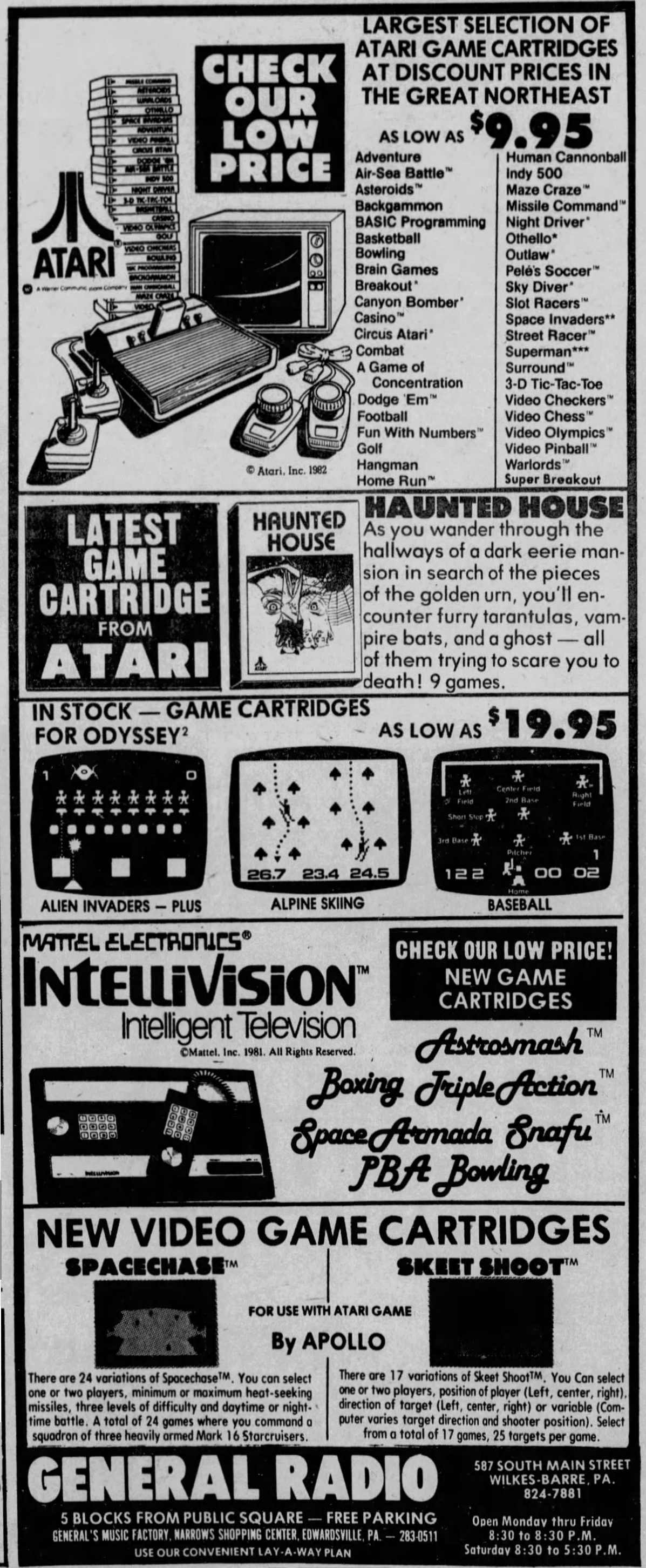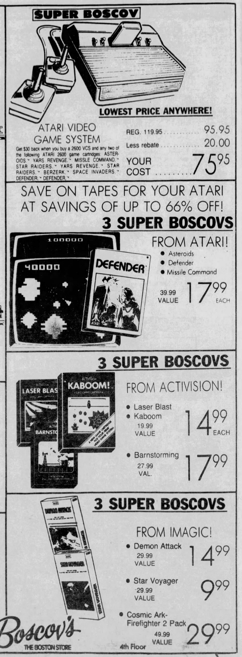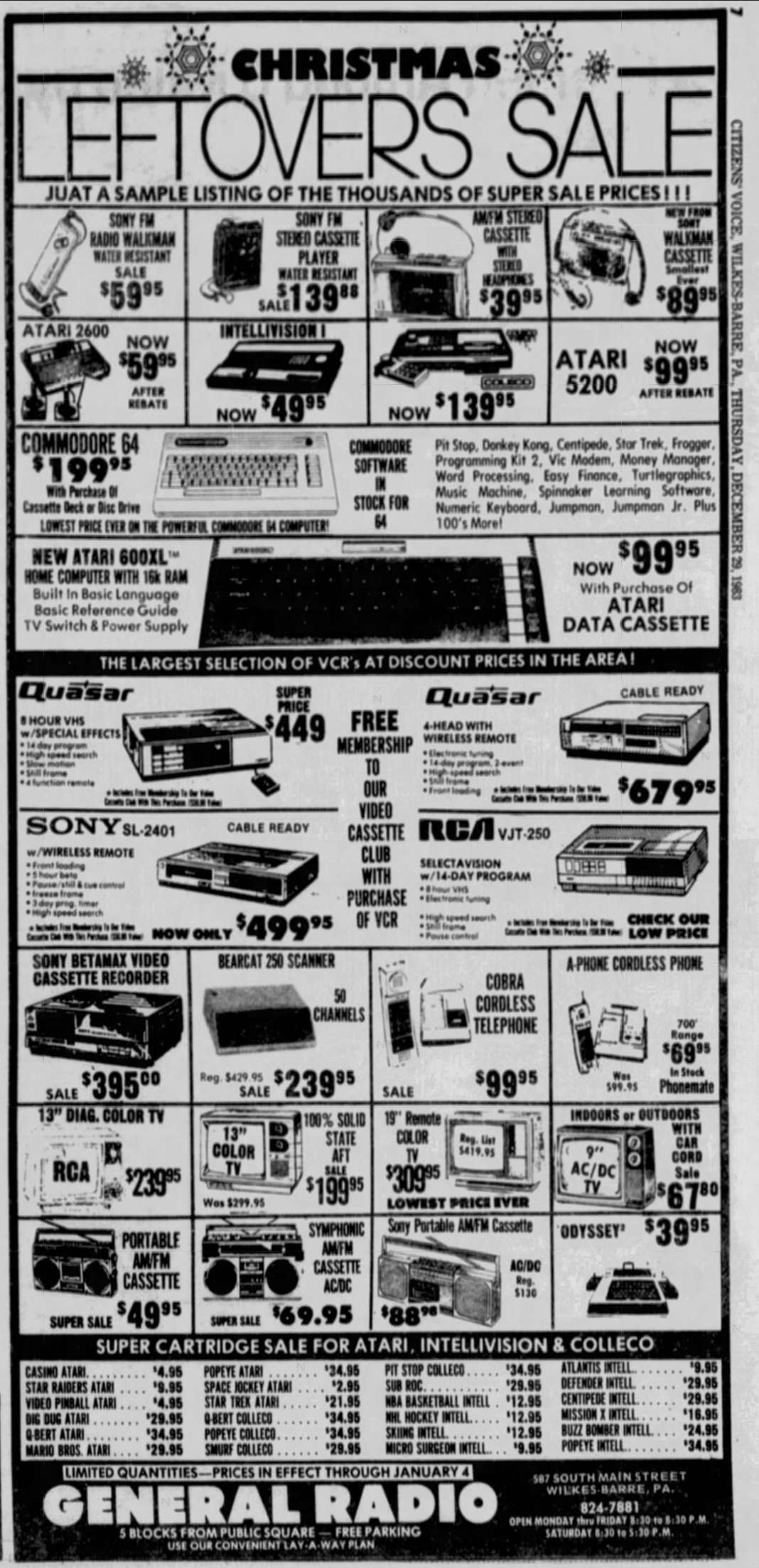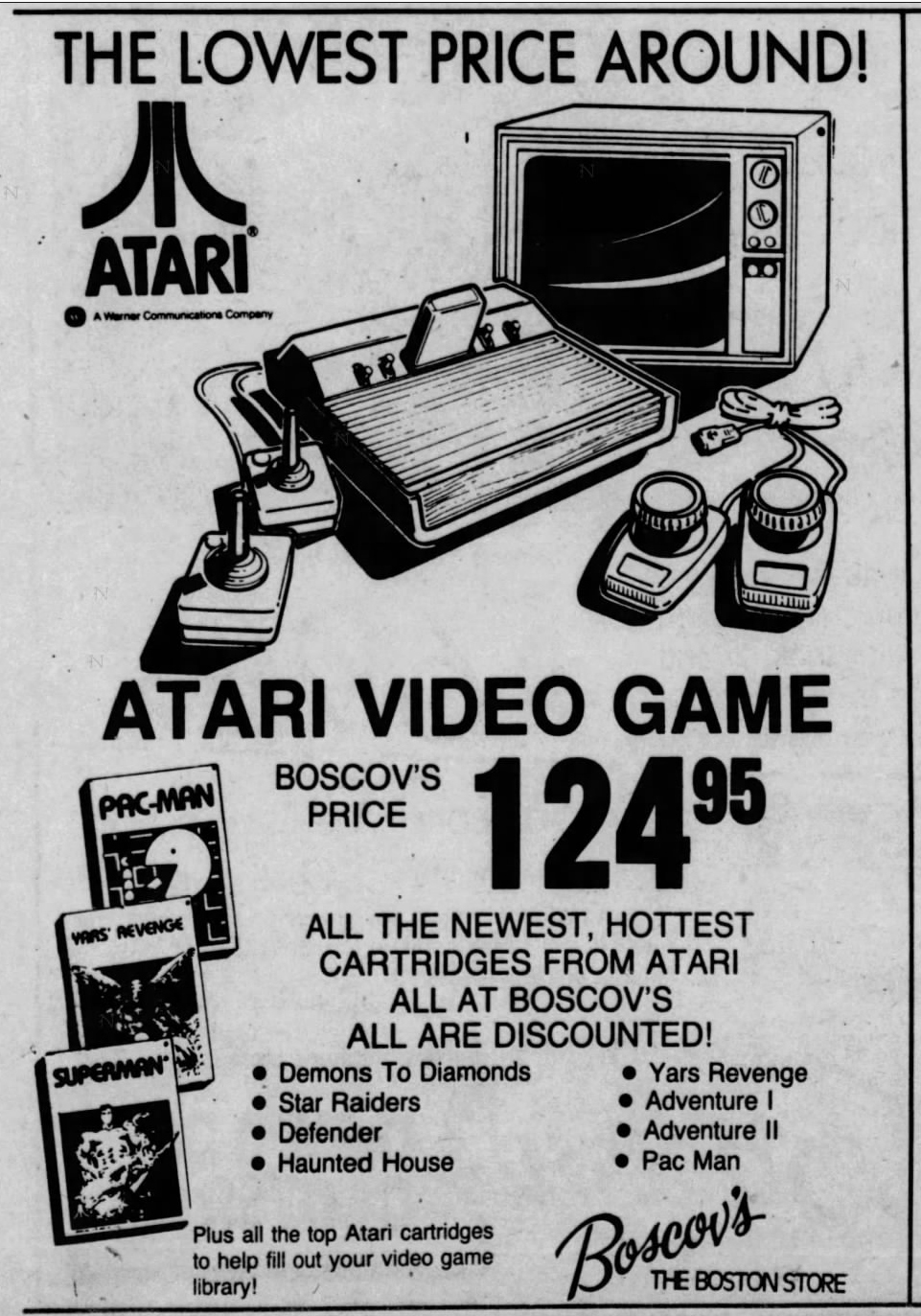 Thanks to the online archive Newspapers.com, an increasing number of newspaper archives that were previously only available on microfilm in select libraries are being scanned and digitized and made available online. The site recently added 1 of 2 local newspapers in my area, The Citizens' Voice, and I recently completed collecting every ad featuring Atari's systems and games from it. I've chosen all the Atari ads that ran between 1980 and 1984 from the 2 stores in my area that were *the* places to find the latest games, and who offered the largest selection of games - Boscov's and General Radio. Boscov's is a chain department store, and the location near me, in Wilkes-Barre, PA, was originally known as The Boston Store until it was purchased by Al Boscov. General Radio was an appliance store for large items like refrigerators, washers/dryers, and TVs, and was located a few blocks away on the same street as Boscov's. Both were quite aggressive in their advertising, and Boscov's in particular promoted Atari high score competitions in their stores and even sponsored a parade celebrating the release of Atari's VCS Pac-Man, and a visit from Pac-Man himself! These ads also serve to help determine more accurate release dates for games, as well as reveal the immediate effects of the market's crash as is unfolded over the last 18 months of Atari, Inc.'s existence.