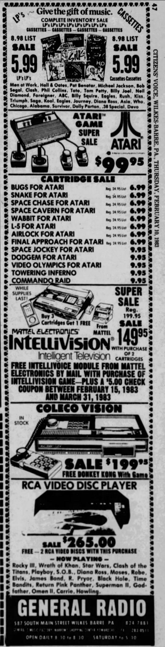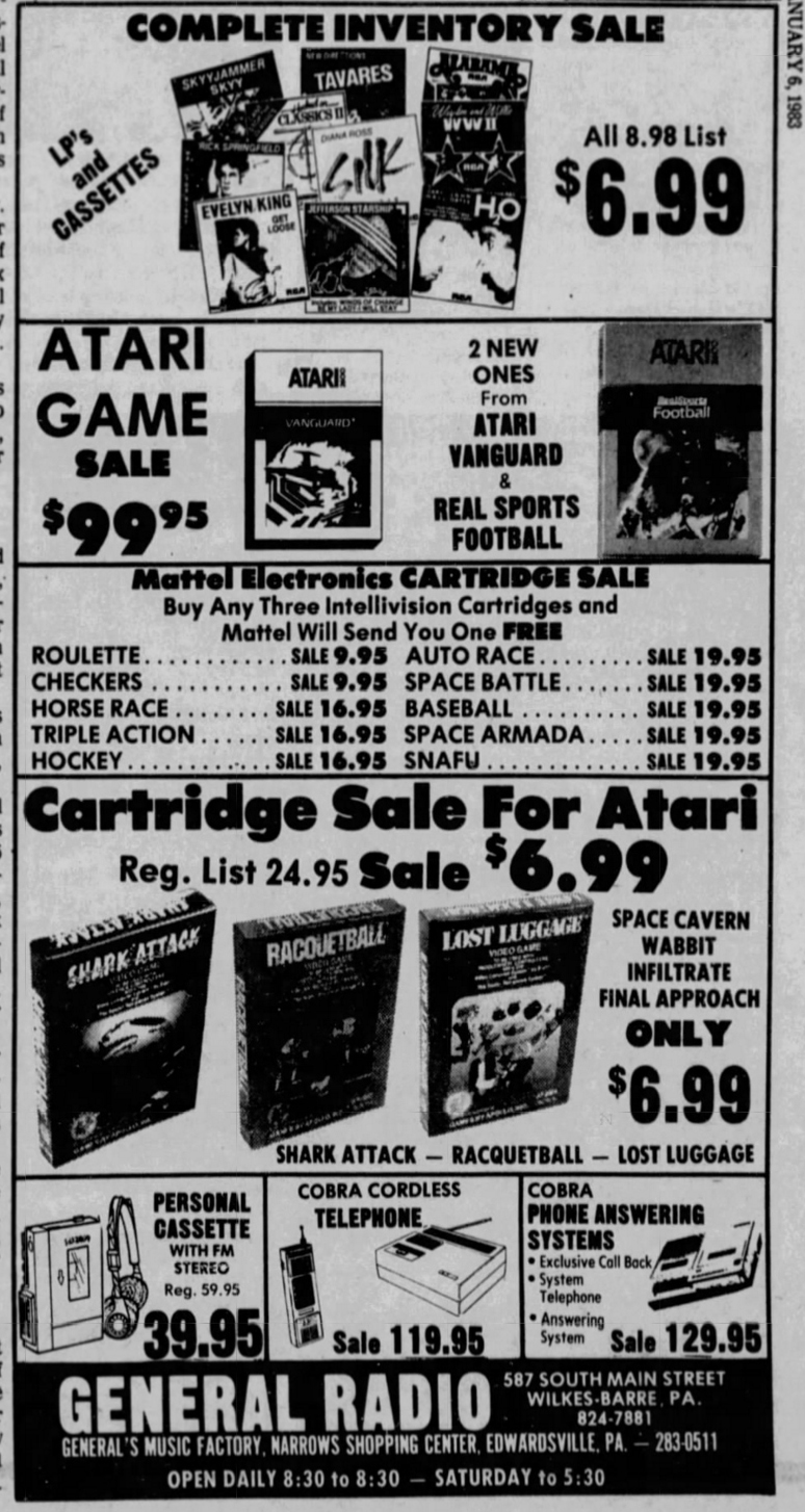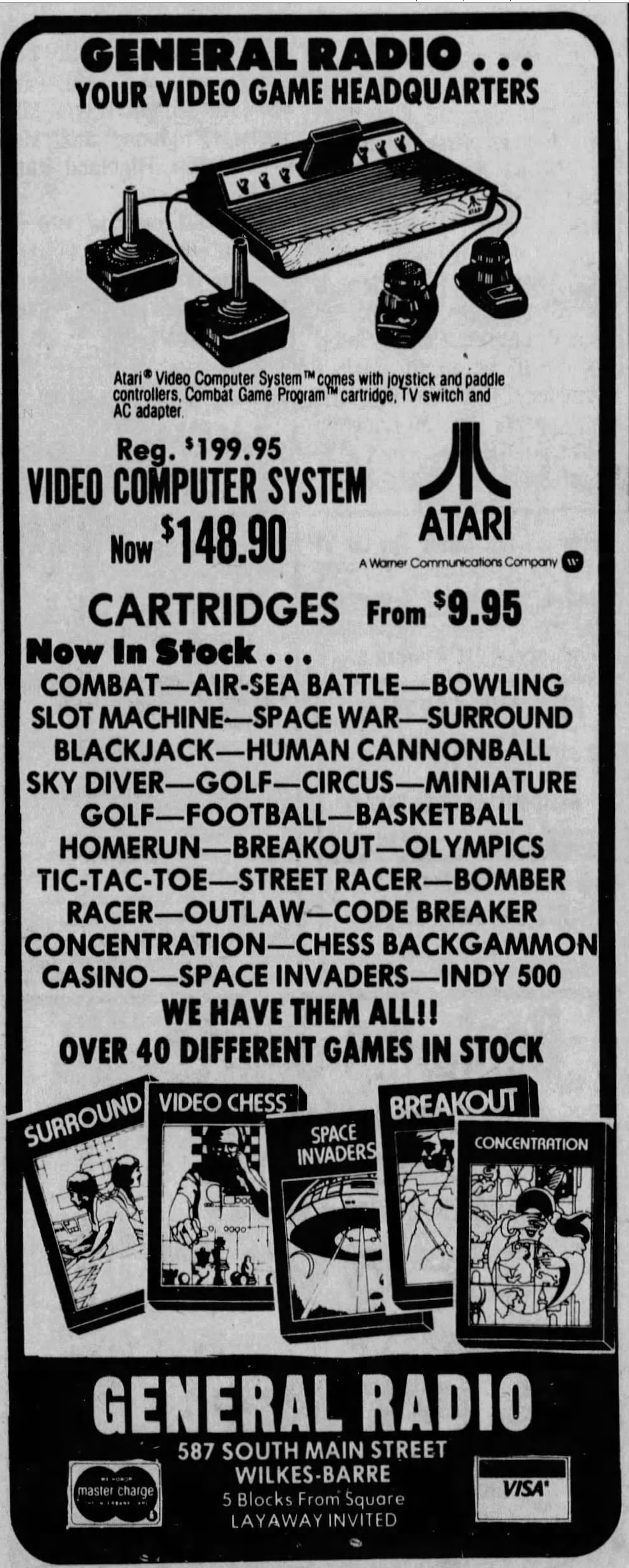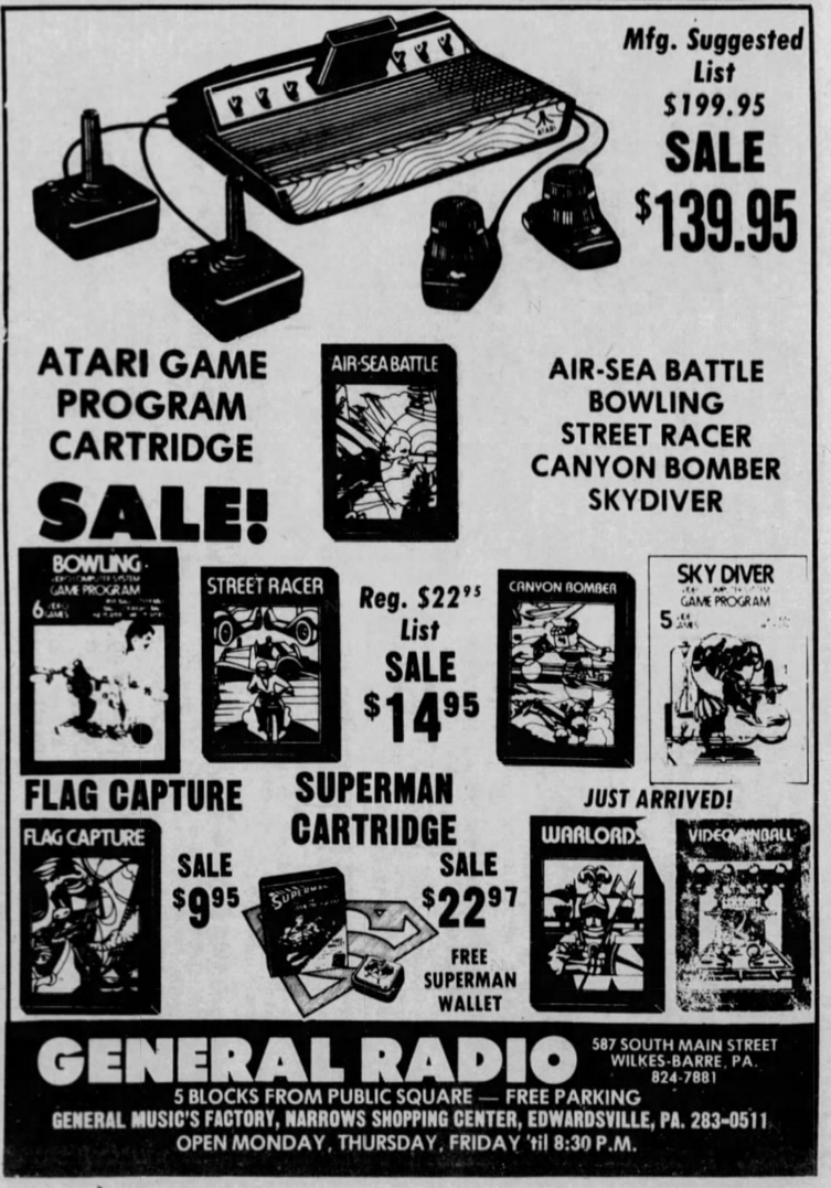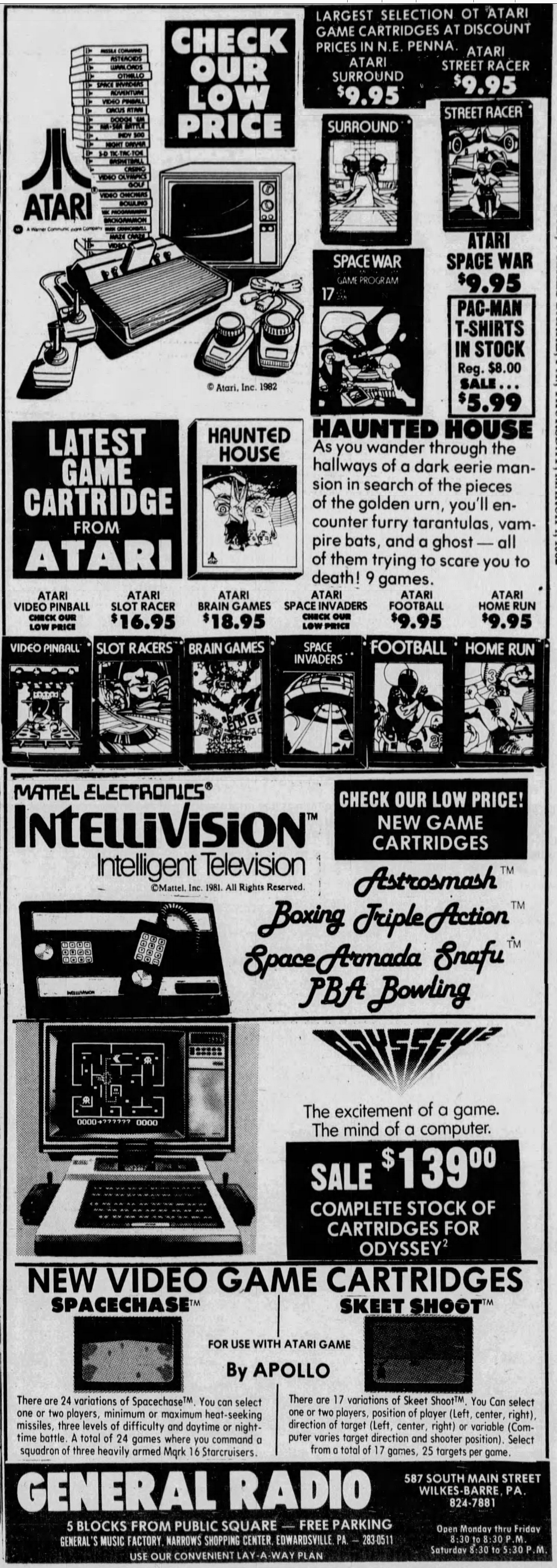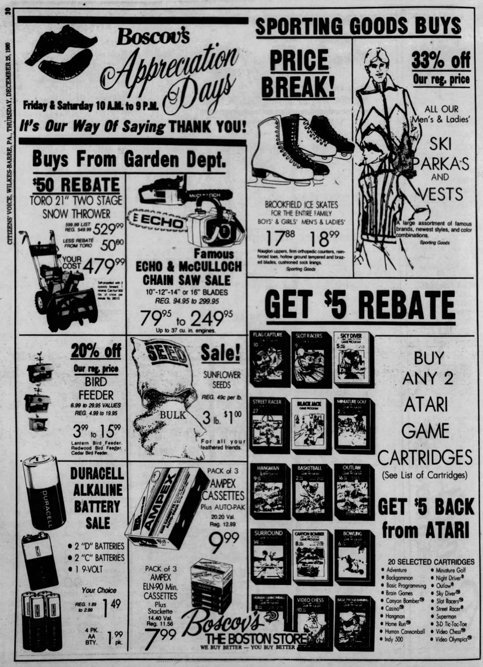 Thanks to the online archive Newspapers.com, an increasing number of newspaper archives that were previously only available on microfilm in select libraries are being scanned and digitized and made available online. The site recently added 1 of 2 local newspapers in my area, The Citizens' Voice, and I recently completed collecting every ad featuring Atari's systems and games from it. I've chosen all the Atari ads that ran between 1980 and 1984 from the 2 stores in my area that were *the* places to find the latest games, and who offered the largest selection of games - Boscov's and General Radio. Boscov's is a chain department store, and the location near me, in Wilkes-Barre, PA, was originally known as The Boston Store until it was purchased by Al Boscov. General Radio was an appliance store for large items like refrigerators, washers/dryers, and TVs, and was located a few blocks away on the same street as Boscov's. Both were quite aggressive in their advertising, and Boscov's in particular promoted Atari high score competitions in their stores and even sponsored a parade celebrating the release of Atari's VCS Pac-Man, and a visit from Pac-Man himself! These ads also serve to help determine more accurate release dates for games, as well as reveal the immediate effects of the market's crash as is unfolded over the last 18 months of Atari, Inc.'s existence.