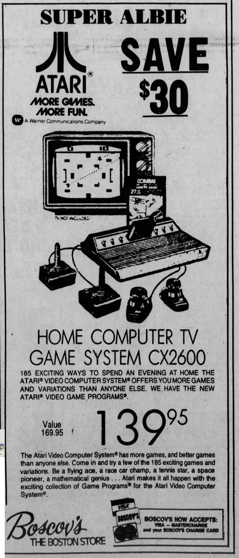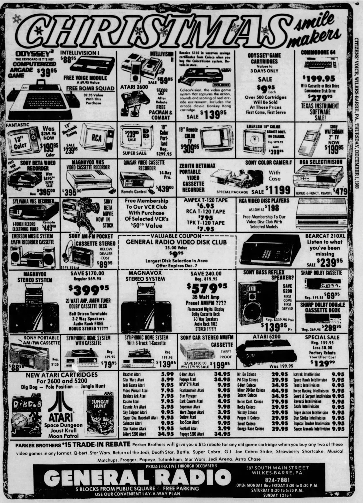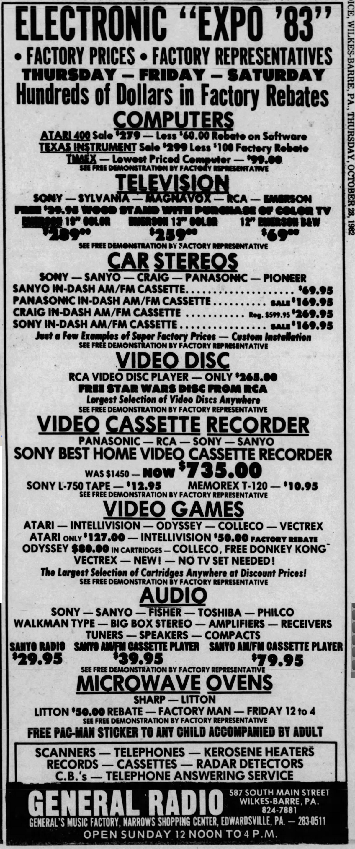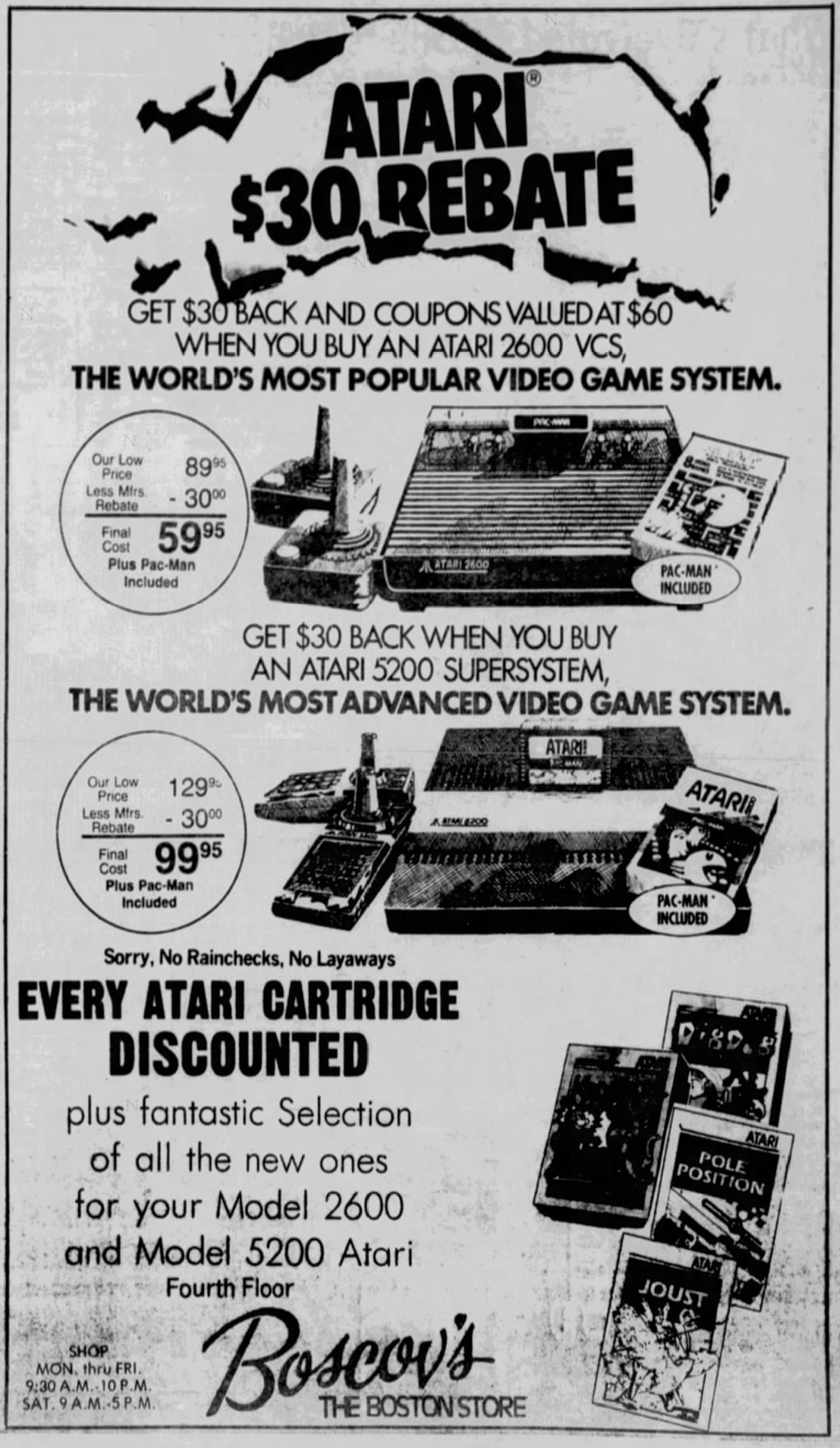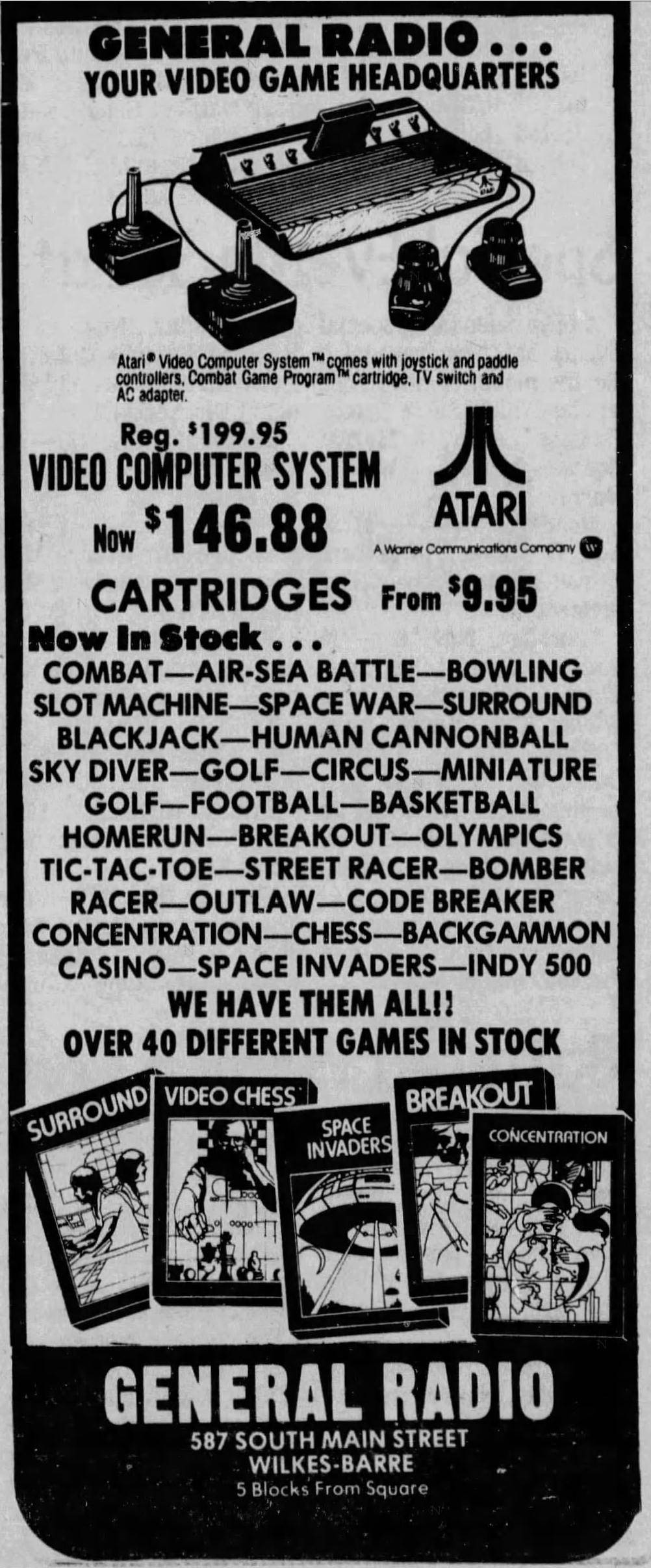 Thanks to the online archive Newspapers.com, an increasing number of newspaper archives that were previously only available on microfilm in select libraries are being scanned and digitized and made available online. The site recently added 1 of 2 local newspapers in my area, The Citizens' Voice, and I recently completed collecting every ad featuring Atari's systems and games from it. I've chosen all the Atari ads that ran between 1980 and 1984 from the 2 stores in my area that were *the* places to find the latest games, and who offered the largest selection of games - Boscov's and General Radio. Boscov's is a chain department store, and the location near me, in Wilkes-Barre, PA, was originally known as The Boston Store until it was purchased by Al Boscov. General Radio was an appliance store for large items like refrigerators, washers/dryers, and TVs, and was located a few blocks away on the same street as Boscov's. Both were quite aggressive in their advertising, and Boscov's in particular promoted Atari high score competitions in their stores and even sponsored a parade celebrating the release of Atari's VCS Pac-Man, and a visit from Pac-Man himself! These ads also serve to help determine more accurate release dates for games, as well as reveal the immediate effects of the market's crash as is unfolded over the last 18 months of Atari, Inc.'s existence.
