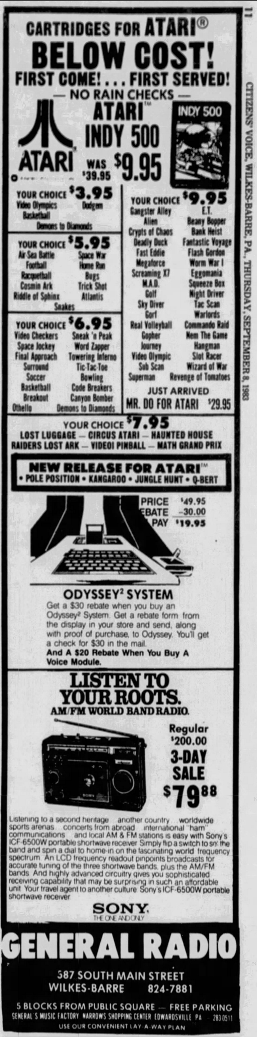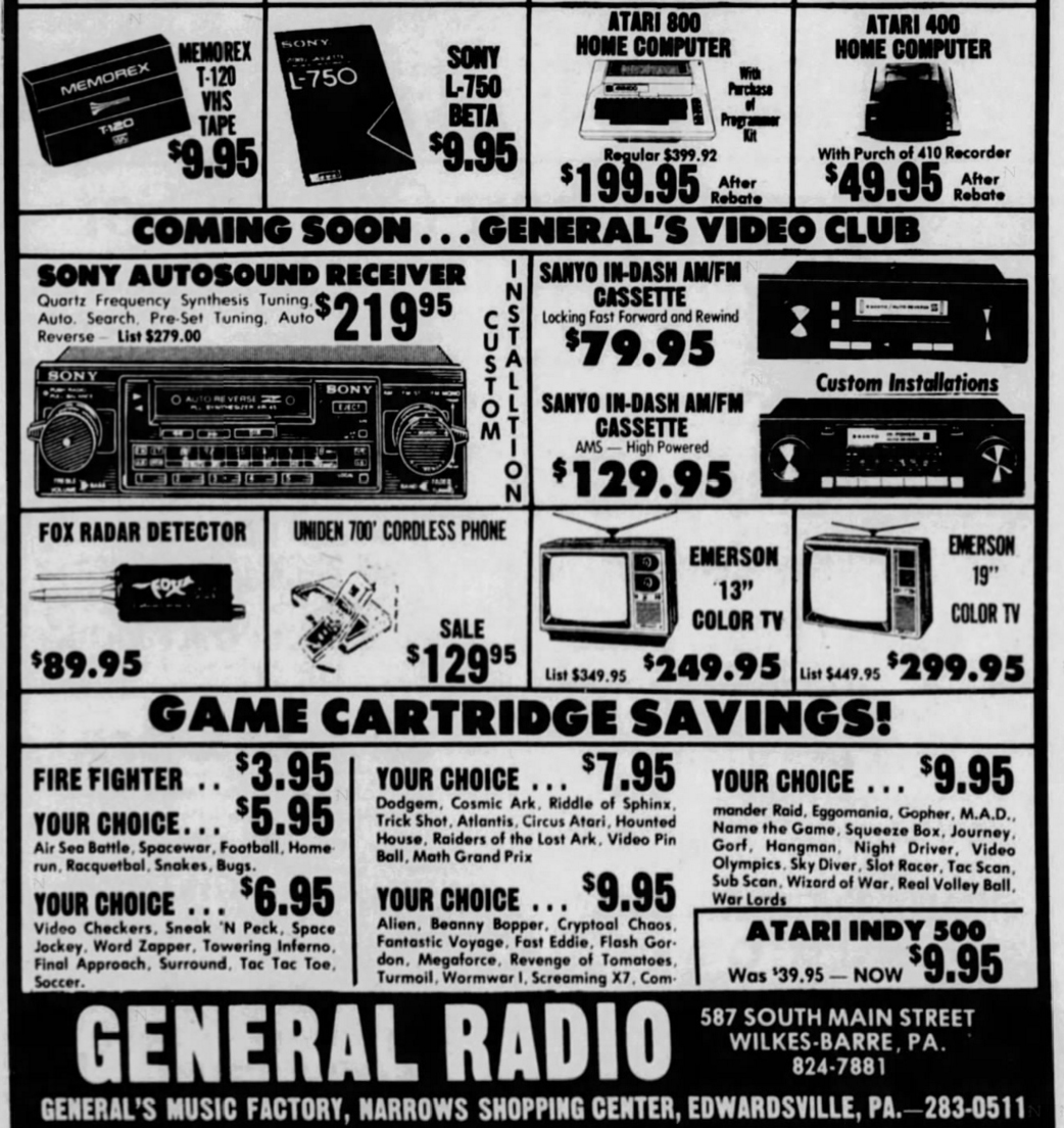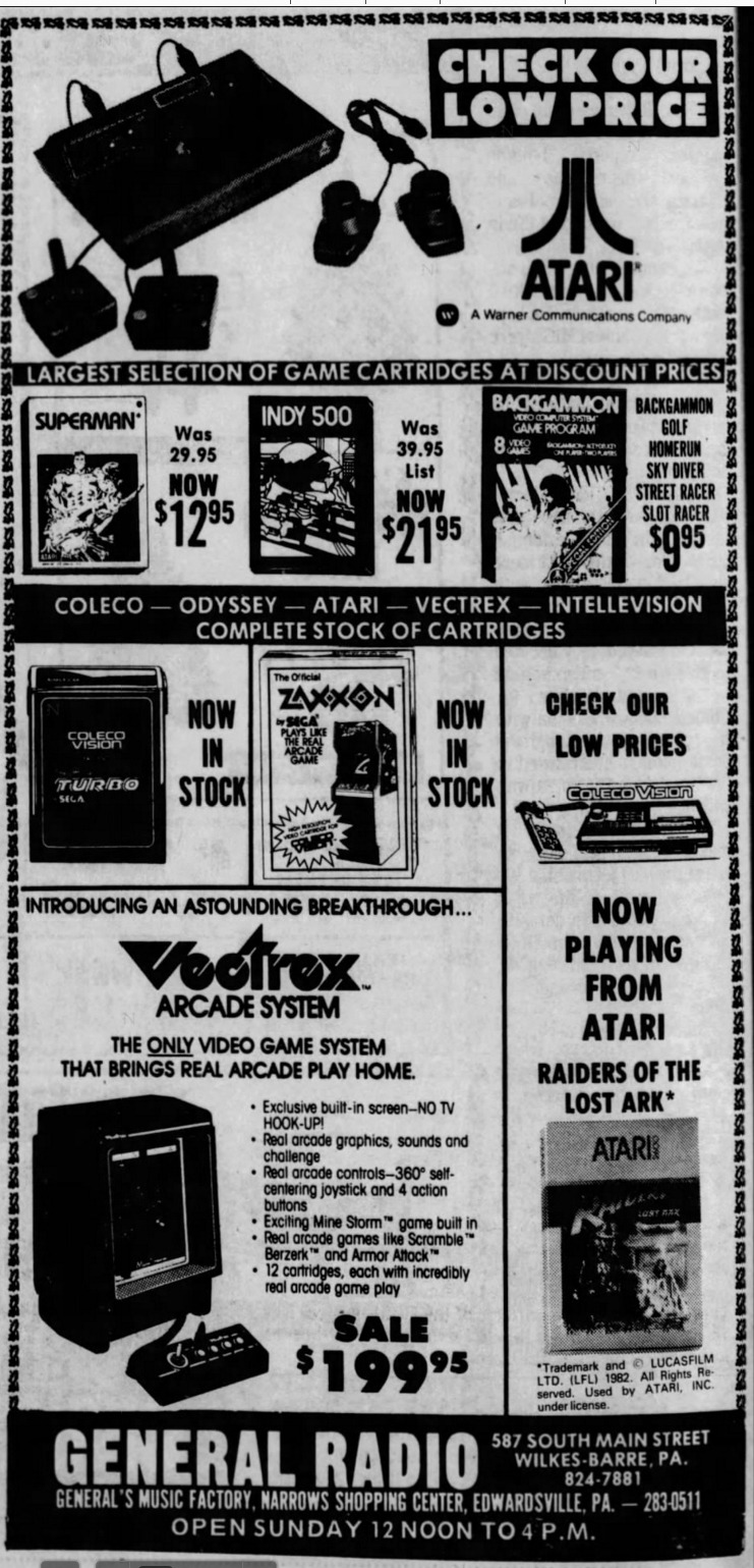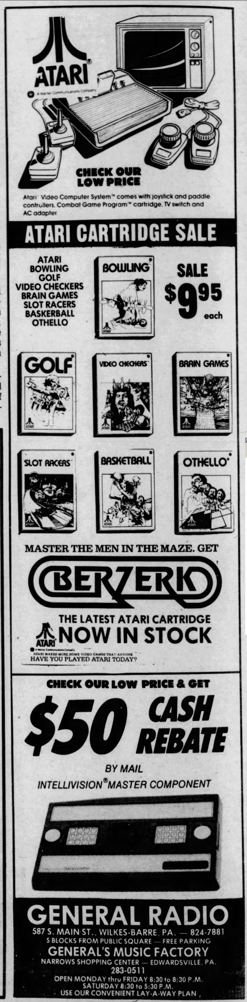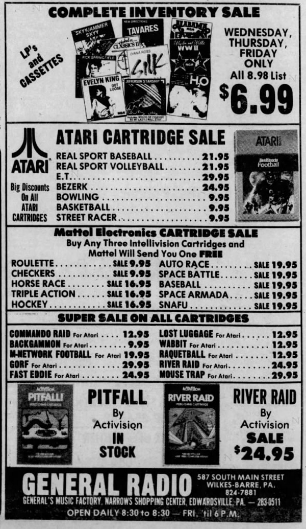 Thanks to the online archive Newspapers.com, an increasing number of newspaper archives that were previously only available on microfilm in select libraries are being scanned and digitized and made available online. The site recently added 1 of 2 local newspapers in my area, The Citizens' Voice, and I recently completed collecting every ad featuring Atari's systems and games from it. I've chosen all the Atari ads that ran between 1980 and 1984 from the 2 stores in my area that were *the* places to find the latest games, and who offered the largest selection of games - Boscov's and General Radio. Boscov's is a chain department store, and the location near me, in Wilkes-Barre, PA, was originally known as The Boston Store until it was purchased by Al Boscov. General Radio was an appliance store for large items like refrigerators, washers/dryers, and TVs, and was located a few blocks away on the same street as Boscov's. Both were quite aggressive in their advertising, and Boscov's in particular promoted Atari high score competitions in their stores and even sponsored a parade celebrating the release of Atari's VCS Pac-Man, and a visit from Pac-Man himself! These ads also serve to help determine more accurate release dates for games, as well as reveal the immediate effects of the market's crash as is unfolded over the last 18 months of Atari, Inc.'s existence.