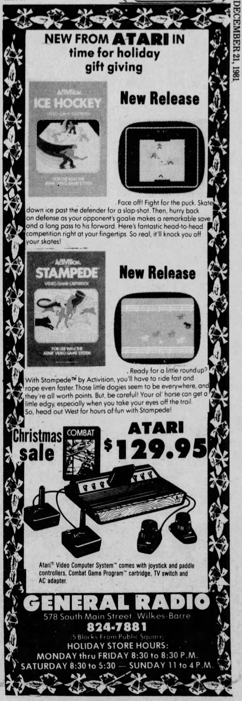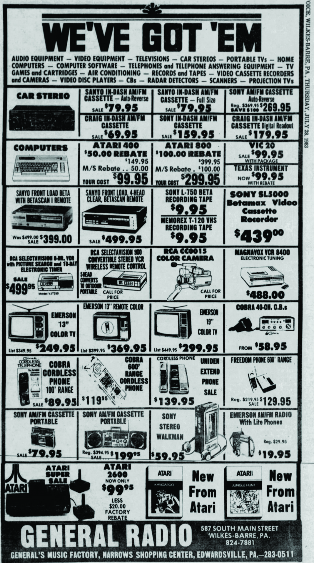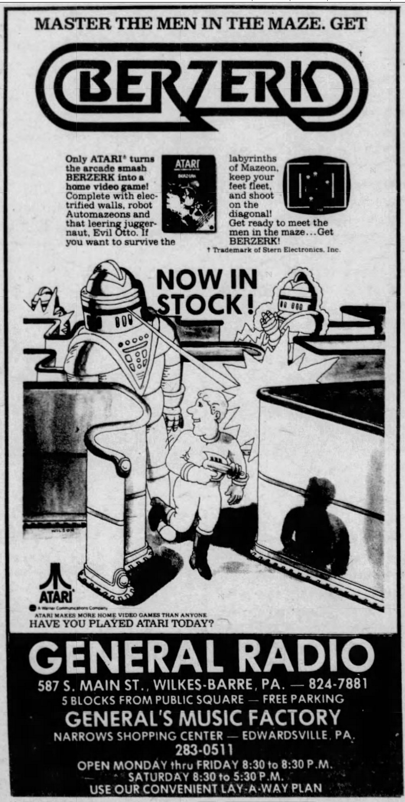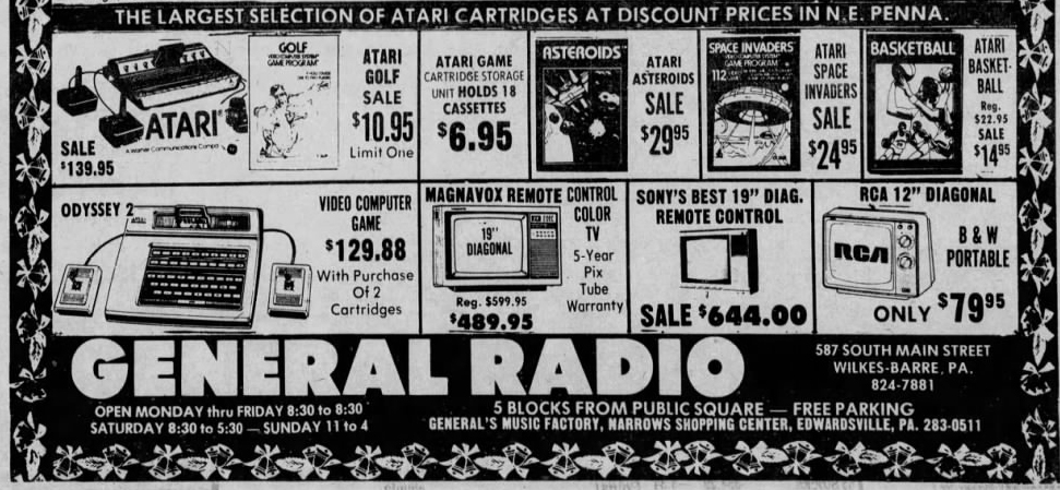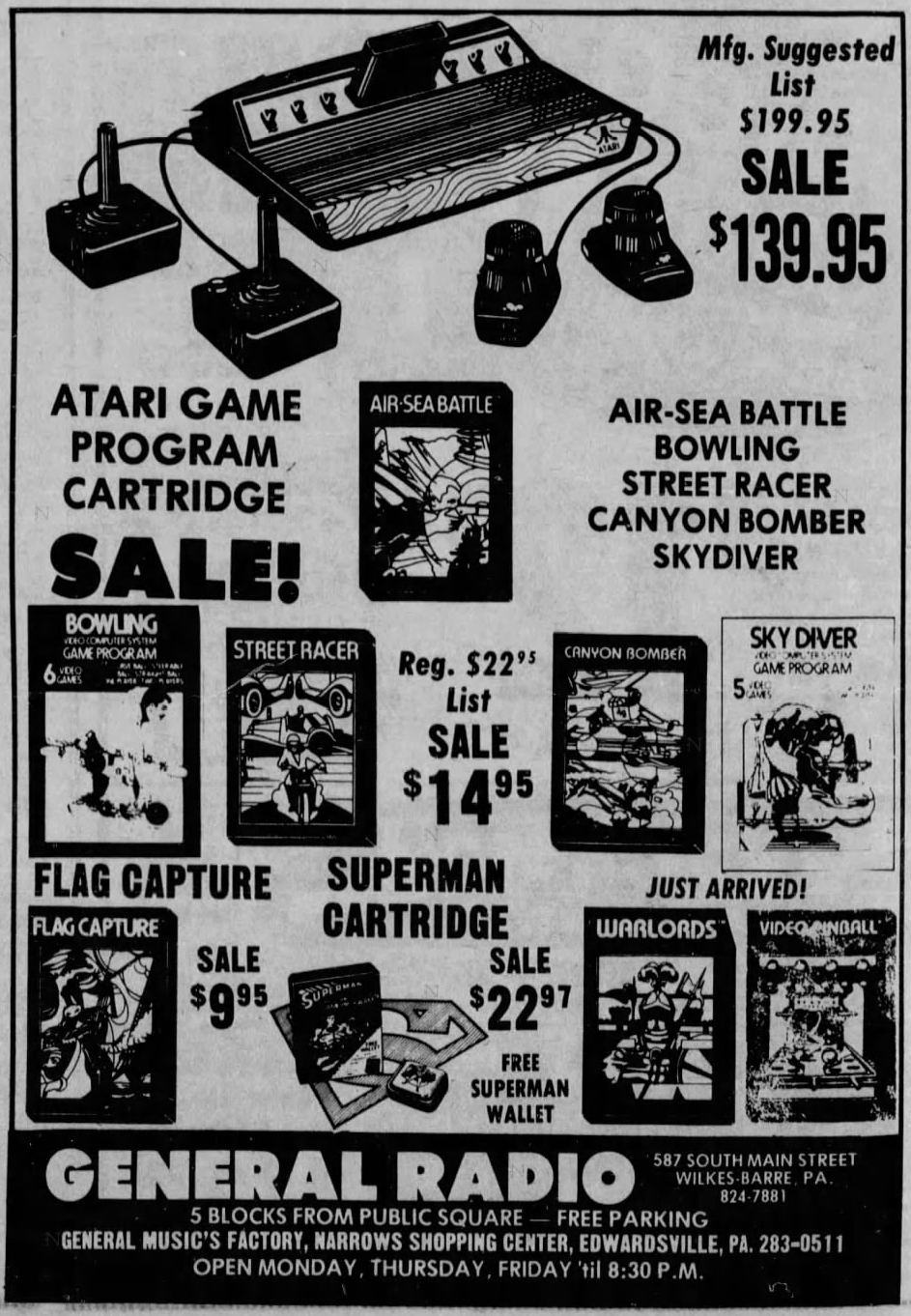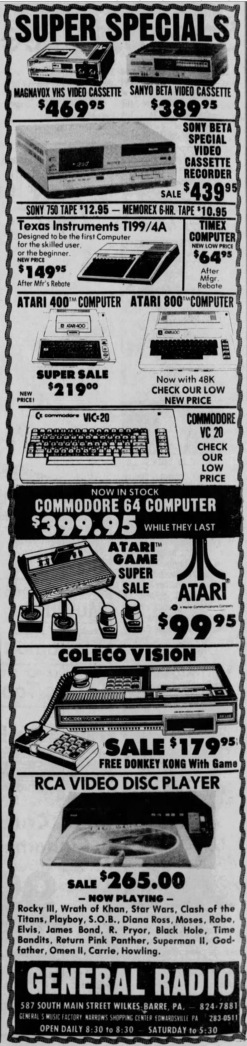 Thanks to the online archive Newspapers.com, an increasing number of newspaper archives that were previously only available on microfilm in select libraries are being scanned and digitized and made available online. The site recently added 1 of 2 local newspapers in my area, The Citizens' Voice, and I recently completed collecting every ad featuring Atari's systems and games from it. I've chosen all the Atari ads that ran between 1980 and 1984 from the 2 stores in my area that were *the* places to find the latest games, and who offered the largest selection of games - Boscov's and General Radio. Boscov's is a chain department store, and the location near me, in Wilkes-Barre, PA, was originally known as The Boston Store until it was purchased by Al Boscov. General Radio was an appliance store for large items like refrigerators, washers/dryers, and TVs, and was located a few blocks away on the same street as Boscov's. Both were quite aggressive in their advertising, and Boscov's in particular promoted Atari high score competitions in their stores and even sponsored a parade celebrating the release of Atari's VCS Pac-Man, and a visit from Pac-Man himself! These ads also serve to help determine more accurate release dates for games, as well as reveal the immediate effects of the market's crash as is unfolded over the last 18 months of Atari, Inc.'s existence.