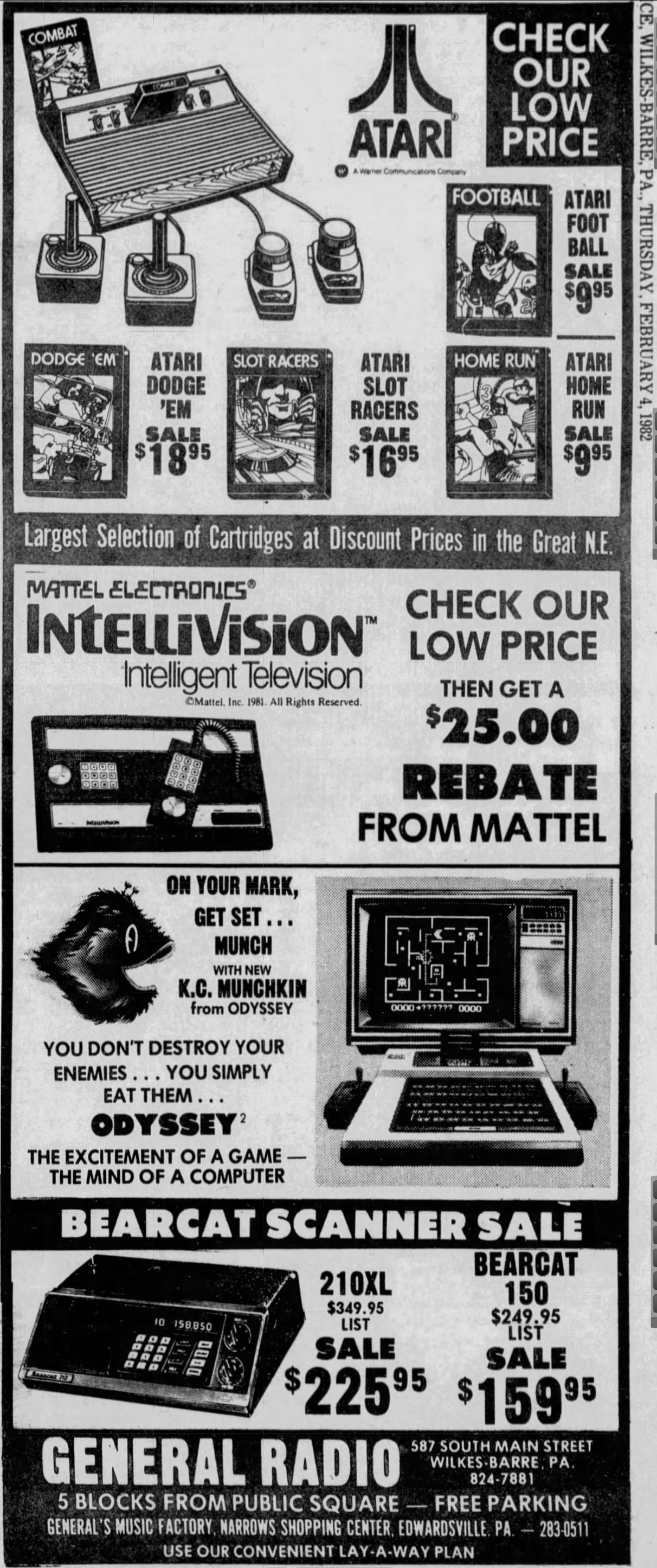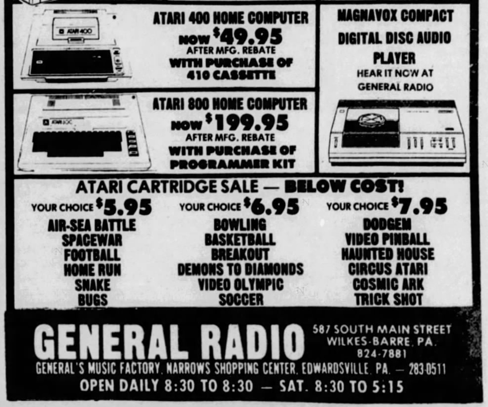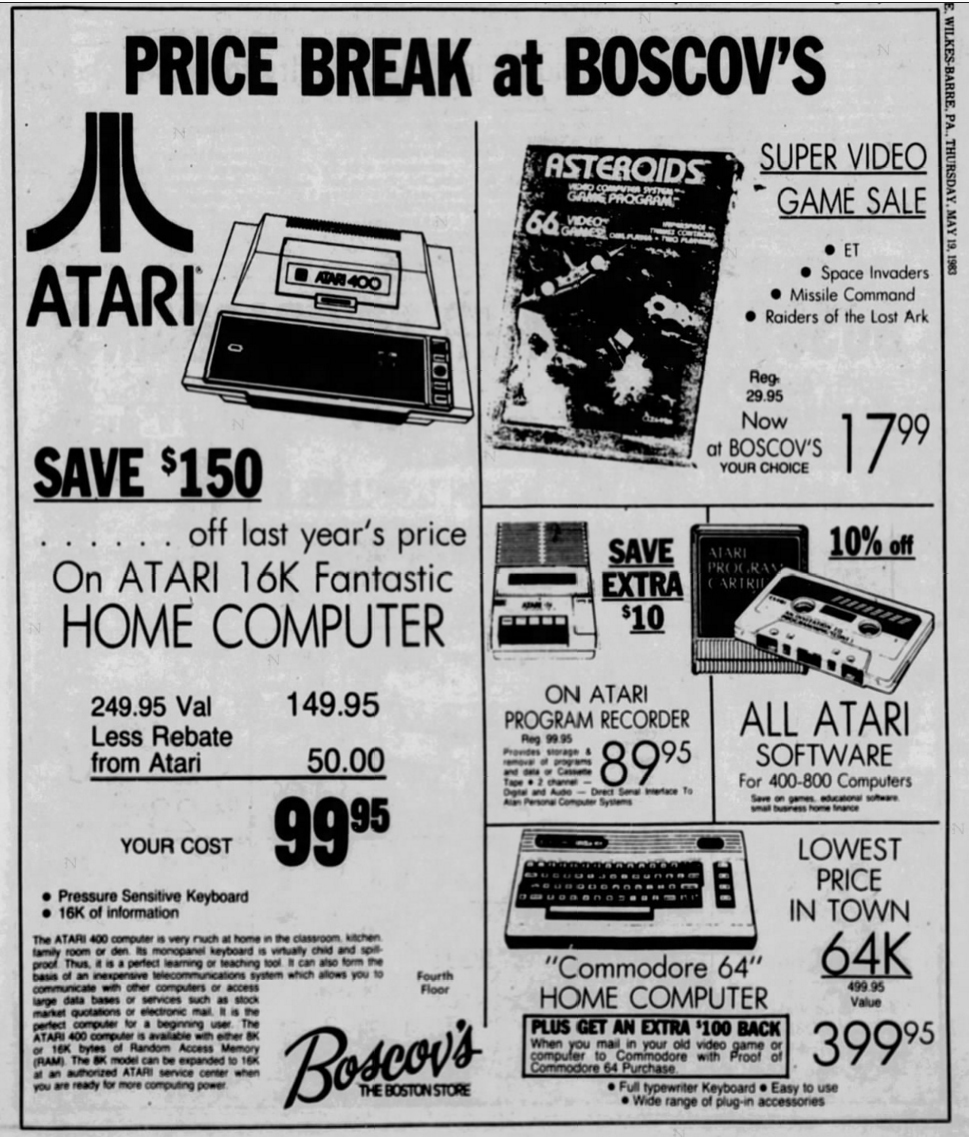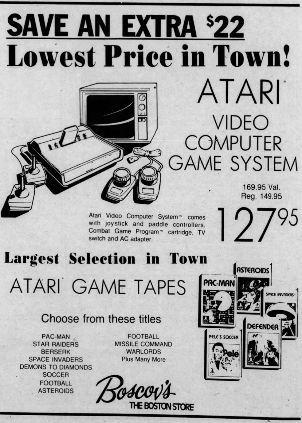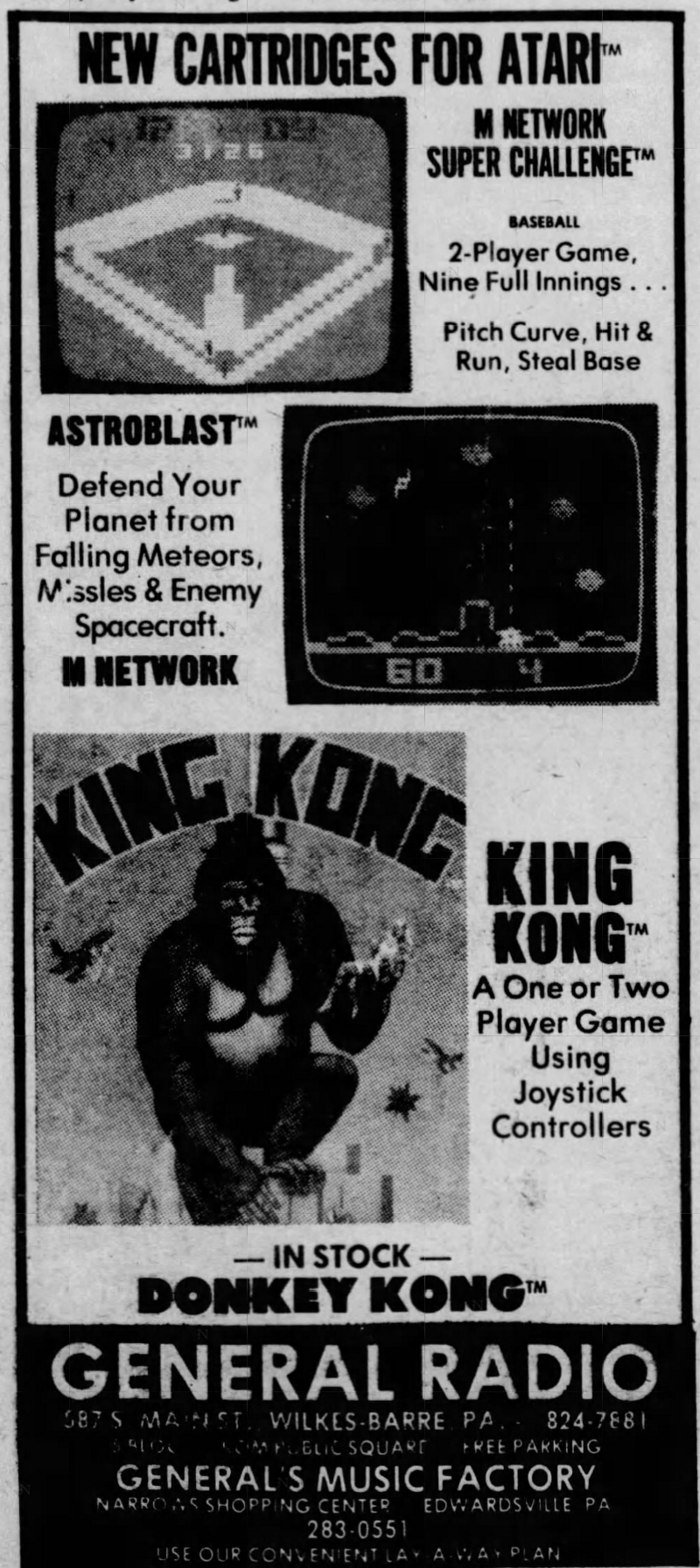 Thanks to the online archive Newspapers.com, an increasing number of newspaper archives that were previously only available on microfilm in select libraries are being scanned and digitized and made available online. The site recently added 1 of 2 local newspapers in my area, The Citizens' Voice, and I recently completed collecting every ad featuring Atari's systems and games from it. I've chosen all the Atari ads that ran between 1980 and 1984 from the 2 stores in my area that were *the* places to find the latest games, and who offered the largest selection of games - Boscov's and General Radio. Boscov's is a chain department store, and the location near me, in Wilkes-Barre, PA, was originally known as The Boston Store until it was purchased by Al Boscov. General Radio was an appliance store for large items like refrigerators, washers/dryers, and TVs, and was located a few blocks away on the same street as Boscov's. Both were quite aggressive in their advertising, and Boscov's in particular promoted Atari high score competitions in their stores and even sponsored a parade celebrating the release of Atari's VCS Pac-Man, and a visit from Pac-Man himself! These ads also serve to help determine more accurate release dates for games, as well as reveal the immediate effects of the market's crash as is unfolded over the last 18 months of Atari, Inc.'s existence.