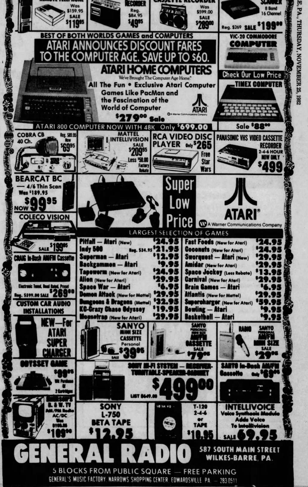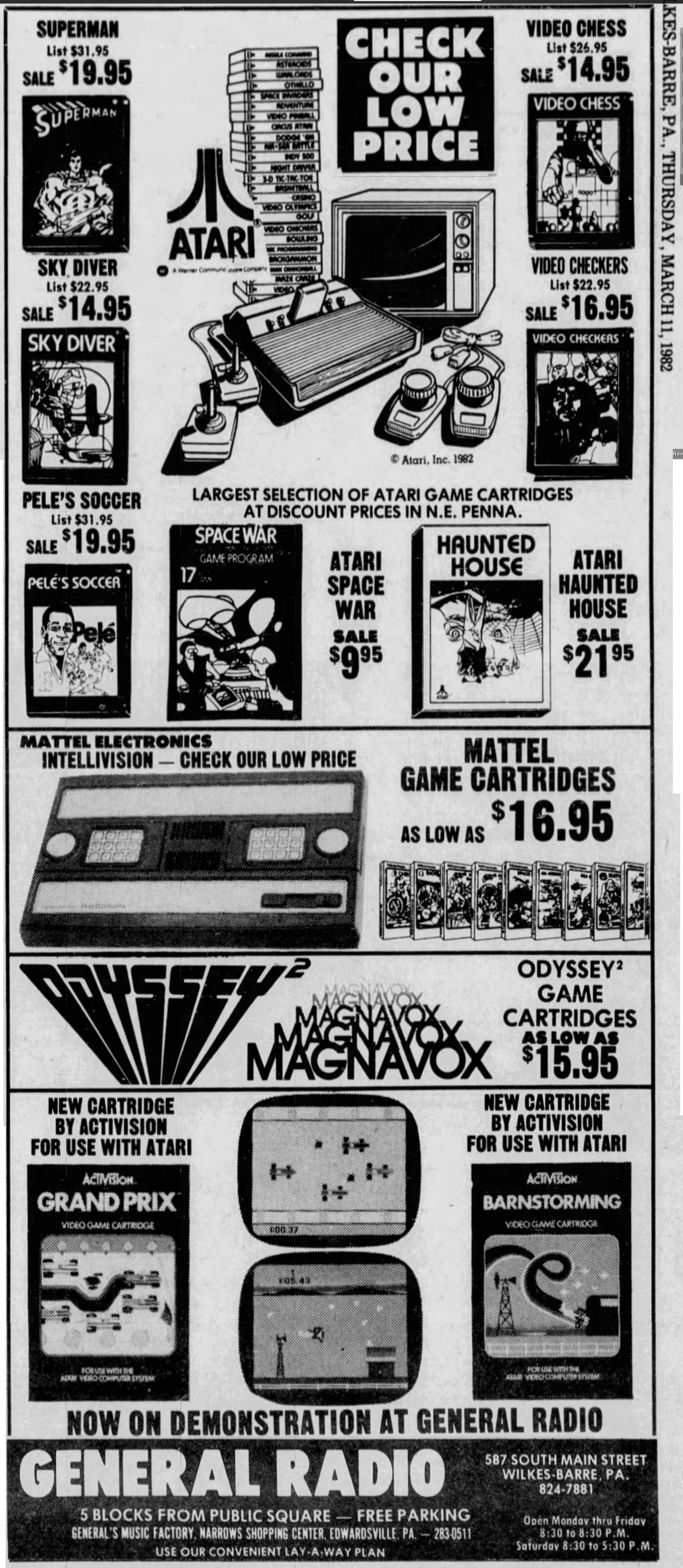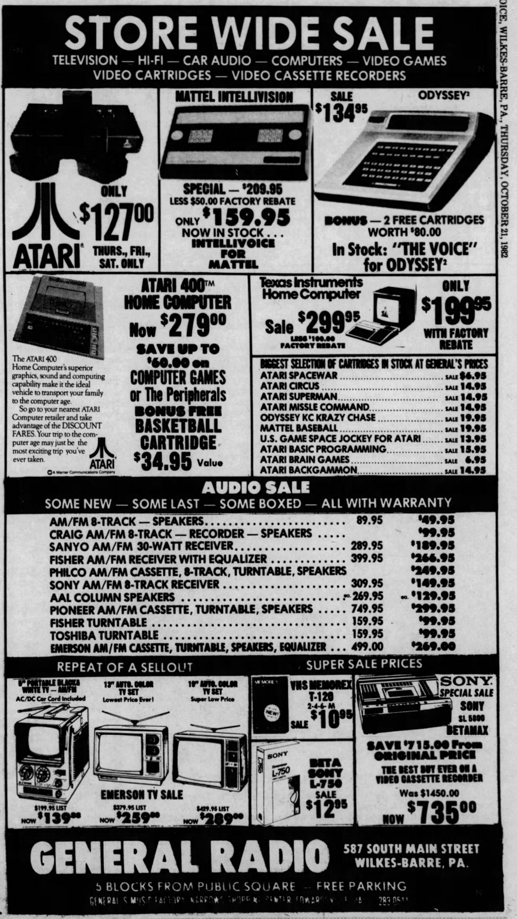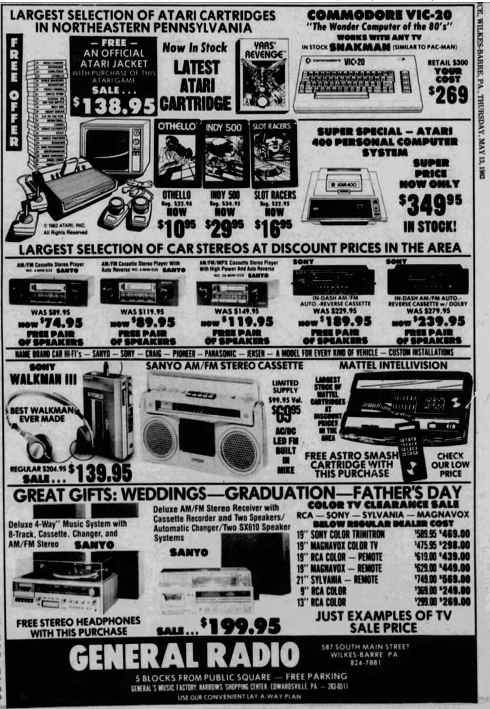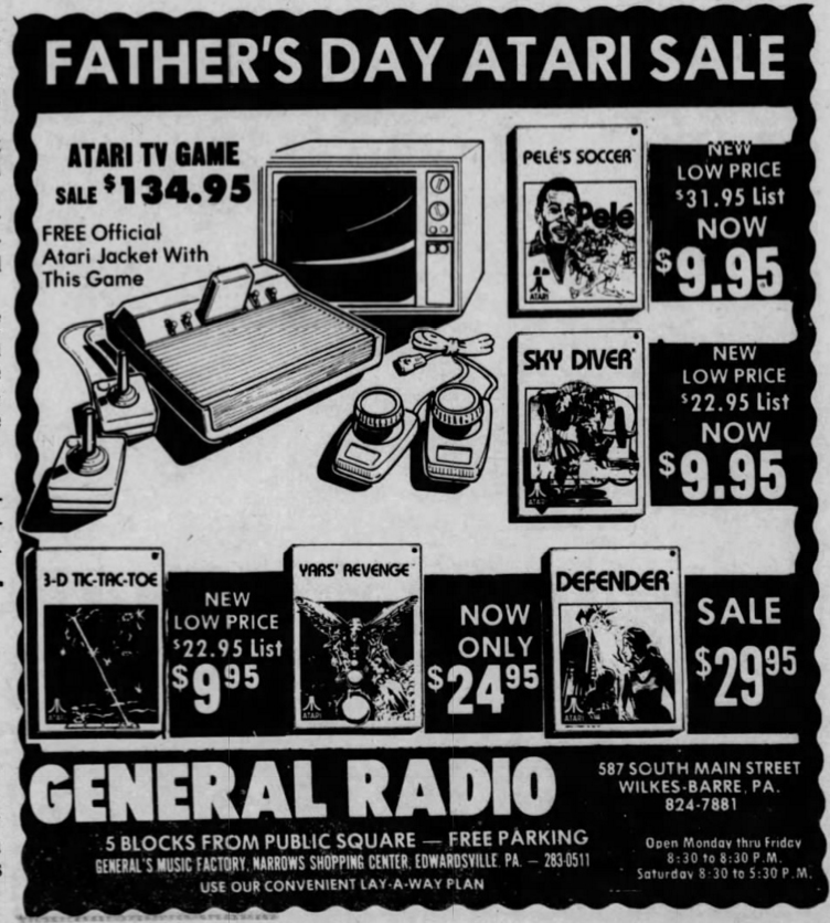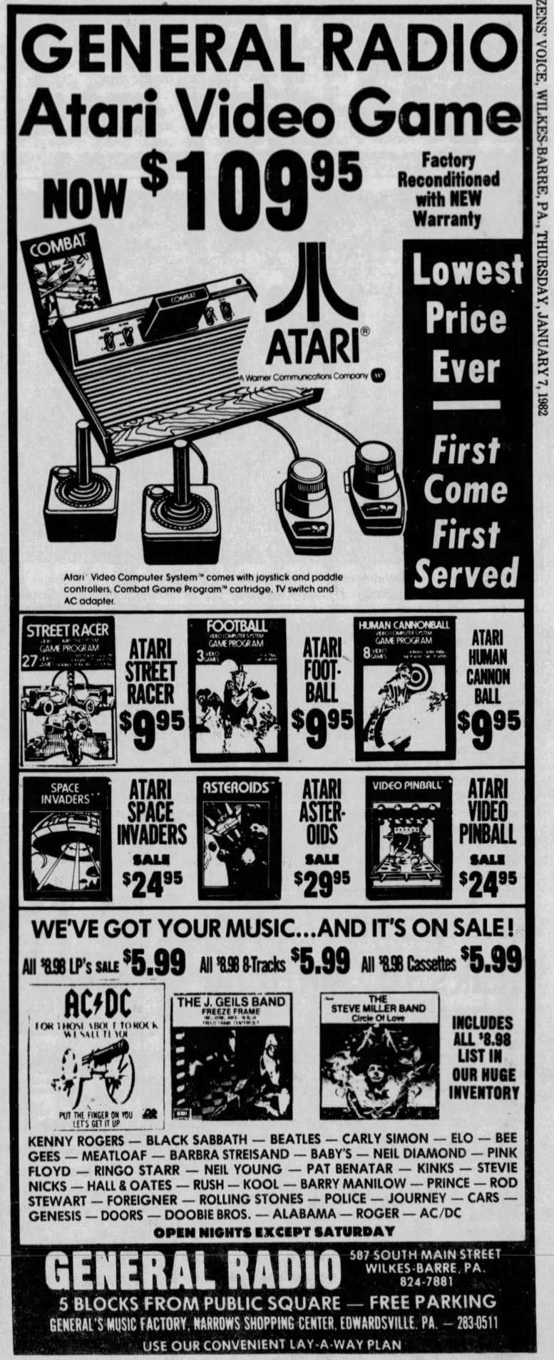 Thanks to the online archive Newspapers.com, an increasing number of newspaper archives that were previously only available on microfilm in select libraries are being scanned and digitized and made available online. The site recently added 1 of 2 local newspapers in my area, The Citizens' Voice, and I recently completed collecting every ad featuring Atari's systems and games from it. I've chosen all the Atari ads that ran between 1980 and 1984 from the 2 stores in my area that were *the* places to find the latest games, and who offered the largest selection of games - Boscov's and General Radio. Boscov's is a chain department store, and the location near me, in Wilkes-Barre, PA, was originally known as The Boston Store until it was purchased by Al Boscov. General Radio was an appliance store for large items like refrigerators, washers/dryers, and TVs, and was located a few blocks away on the same street as Boscov's. Both were quite aggressive in their advertising, and Boscov's in particular promoted Atari high score competitions in their stores and even sponsored a parade celebrating the release of Atari's VCS Pac-Man, and a visit from Pac-Man himself! These ads also serve to help determine more accurate release dates for games, as well as reveal the immediate effects of the market's crash as is unfolded over the last 18 months of Atari, Inc.'s existence.