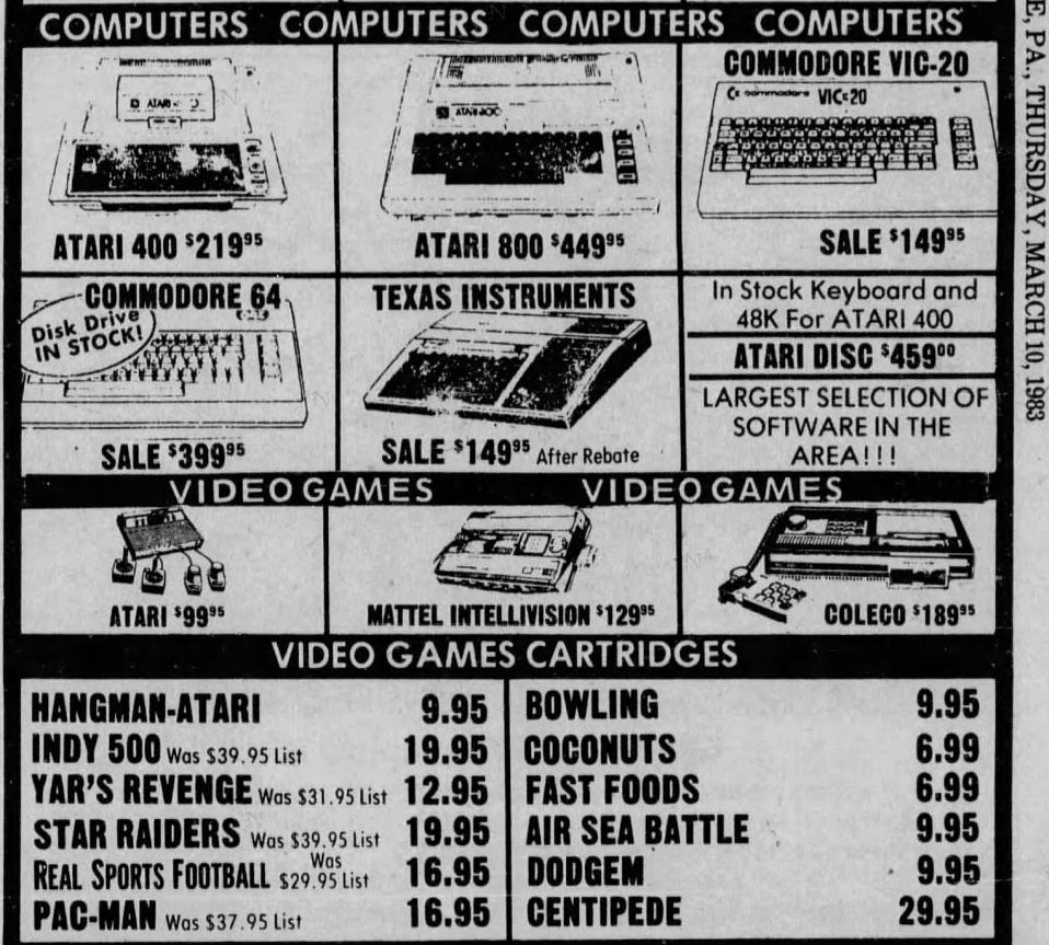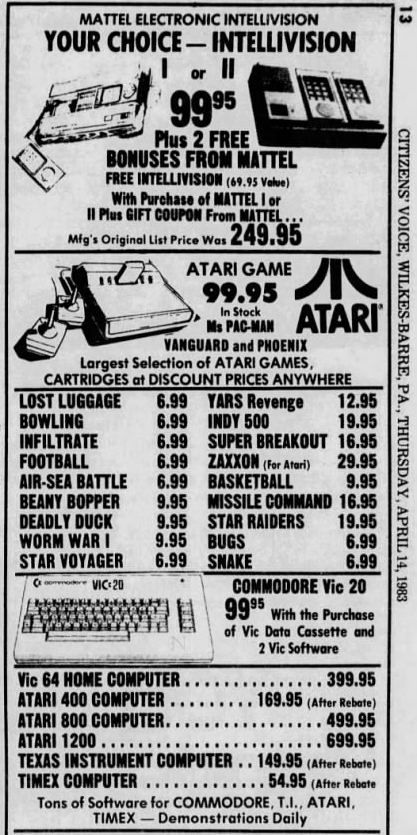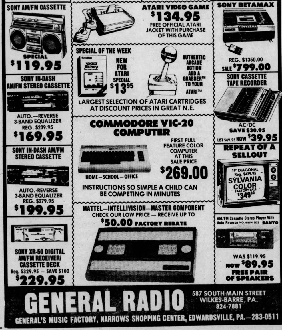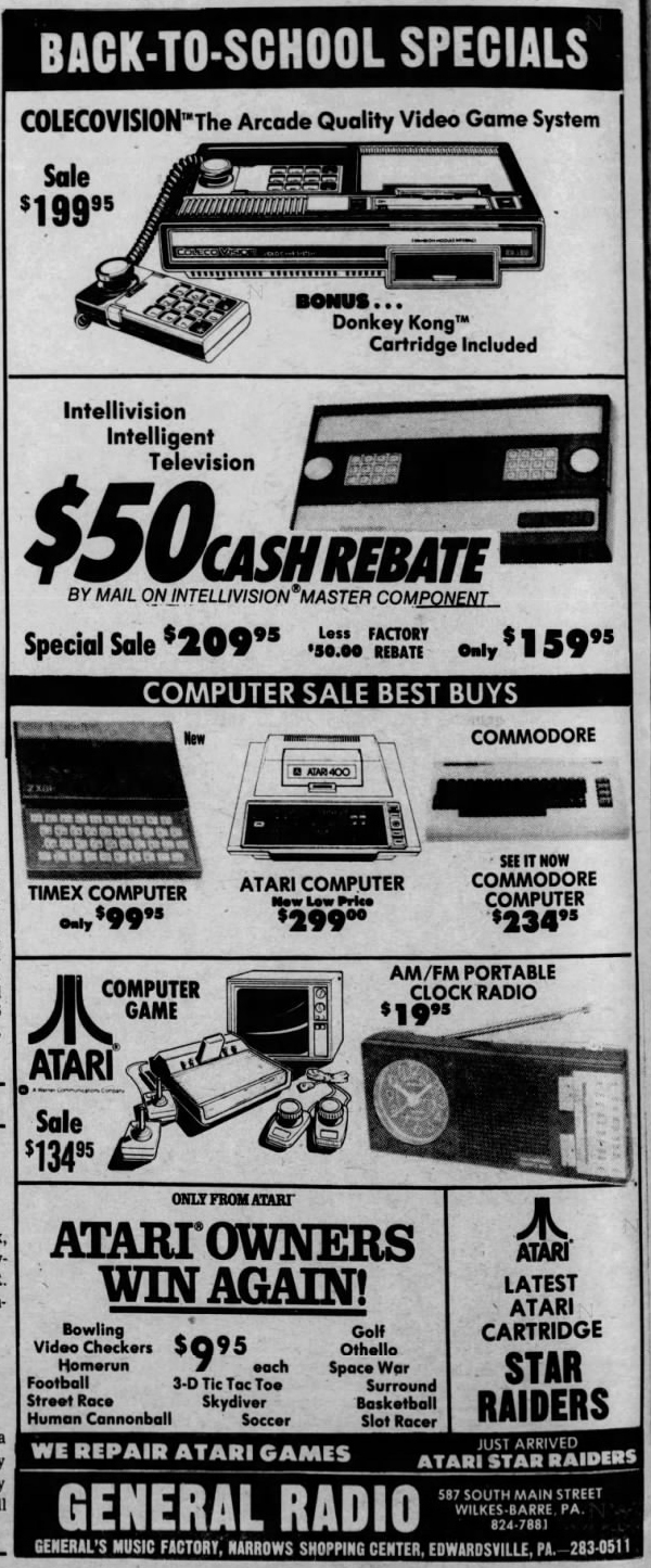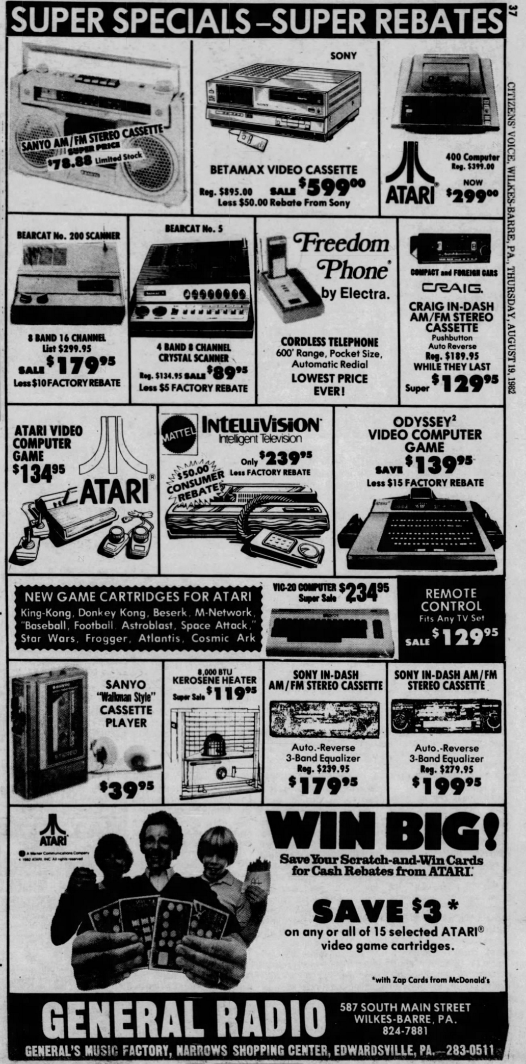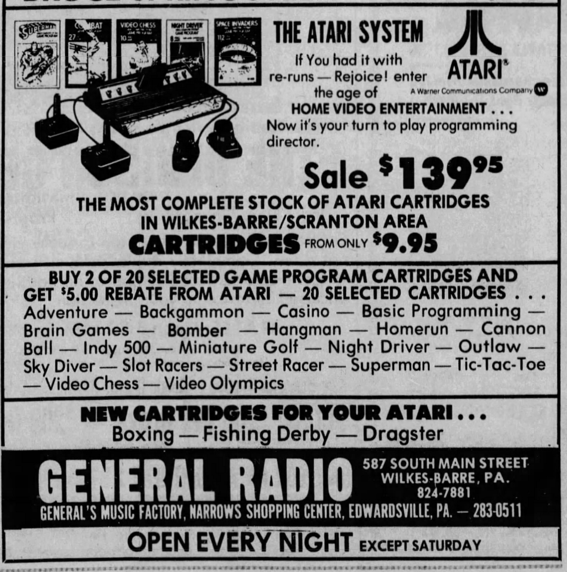 Thanks to the online archive Newspapers.com, an increasing number of newspaper archives that were previously only available on microfilm in select libraries are being scanned and digitized and made available online. The site recently added 1 of 2 local newspapers in my area, The Citizens' Voice, and I recently completed collecting every ad featuring Atari's systems and games from it. I've chosen all the Atari ads that ran between 1980 and 1984 from the 2 stores in my area that were *the* places to find the latest games, and who offered the largest selection of games - Boscov's and General Radio. Boscov's is a chain department store, and the location near me, in Wilkes-Barre, PA, was originally known as The Boston Store until it was purchased by Al Boscov. General Radio was an appliance store for large items like refrigerators, washers/dryers, and TVs, and was located a few blocks away on the same street as Boscov's. Both were quite aggressive in their advertising, and Boscov's in particular promoted Atari high score competitions in their stores and even sponsored a parade celebrating the release of Atari's VCS Pac-Man, and a visit from Pac-Man himself! These ads also serve to help determine more accurate release dates for games, as well as reveal the immediate effects of the market's crash as is unfolded over the last 18 months of Atari, Inc.'s existence.