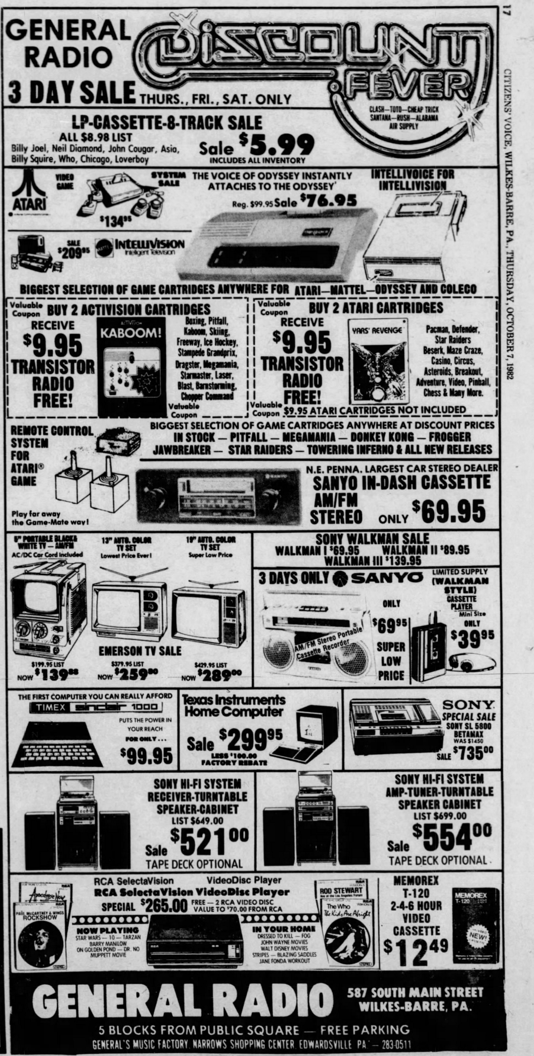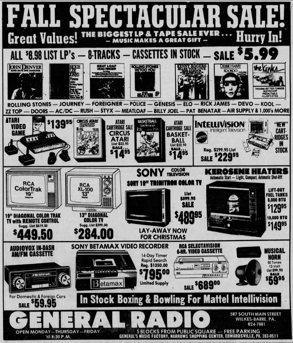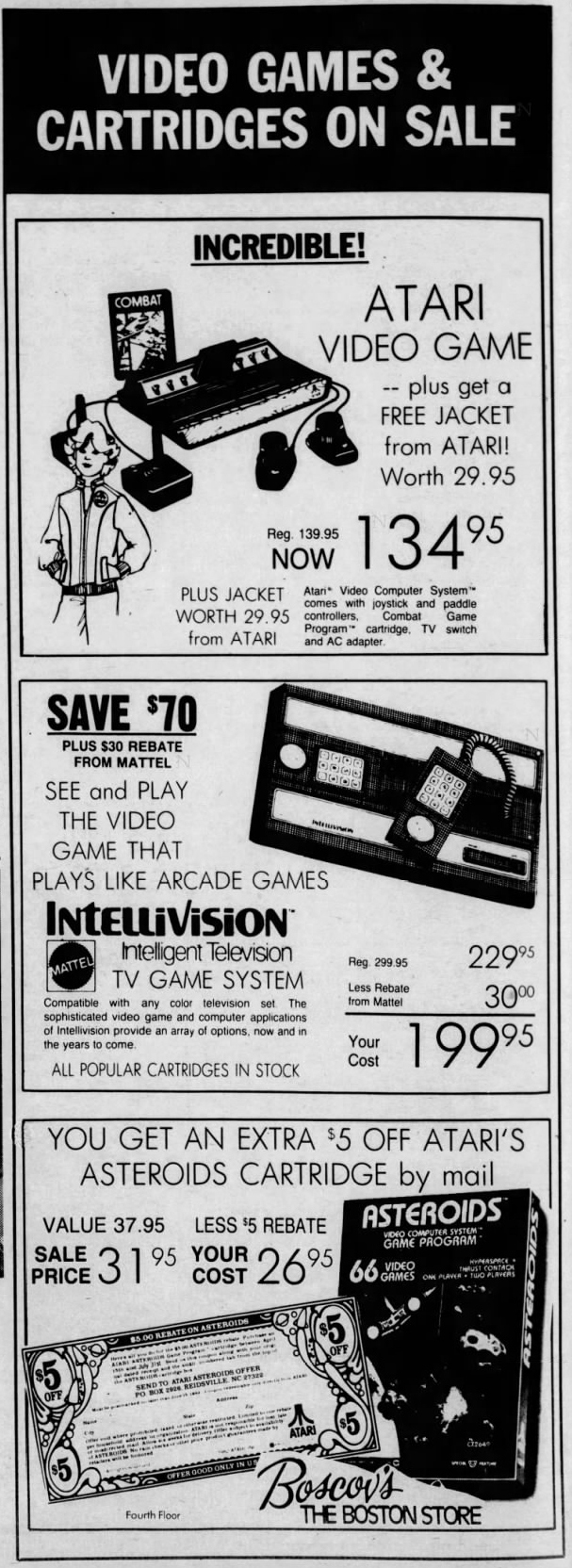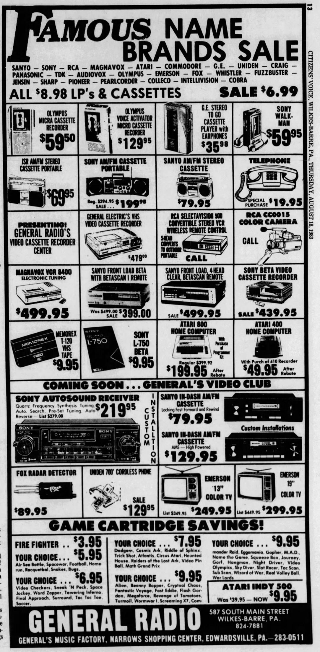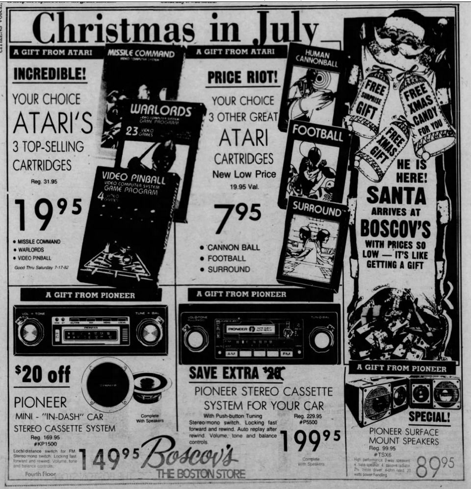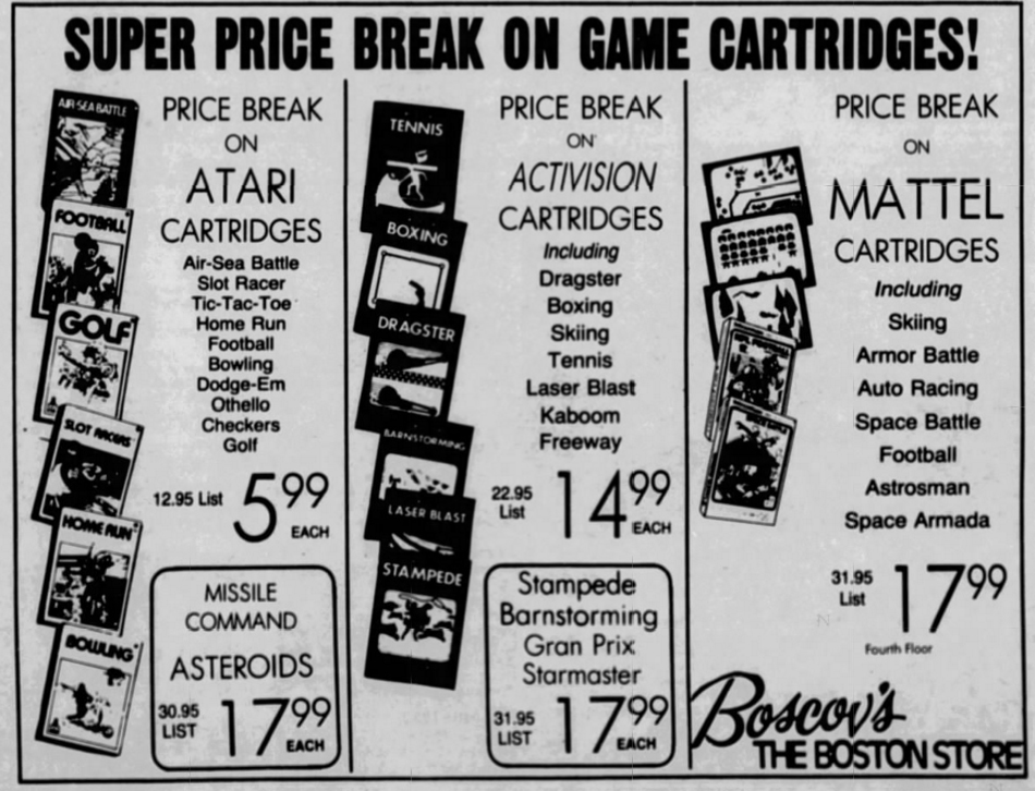 Thanks to the online archive Newspapers.com, an increasing number of newspaper archives that were previously only available on microfilm in select libraries are being scanned and digitized and made available online. The site recently added 1 of 2 local newspapers in my area, The Citizens' Voice, and I recently completed collecting every ad featuring Atari's systems and games from it. I've chosen all the Atari ads that ran between 1980 and 1984 from the 2 stores in my area that were *the* places to find the latest games, and who offered the largest selection of games - Boscov's and General Radio. Boscov's is a chain department store, and the location near me, in Wilkes-Barre, PA, was originally known as The Boston Store until it was purchased by Al Boscov. General Radio was an appliance store for large items like refrigerators, washers/dryers, and TVs, and was located a few blocks away on the same street as Boscov's. Both were quite aggressive in their advertising, and Boscov's in particular promoted Atari high score competitions in their stores and even sponsored a parade celebrating the release of Atari's VCS Pac-Man, and a visit from Pac-Man himself! These ads also serve to help determine more accurate release dates for games, as well as reveal the immediate effects of the market's crash as is unfolded over the last 18 months of Atari, Inc.'s existence.