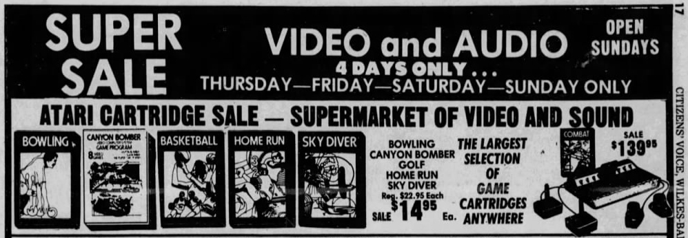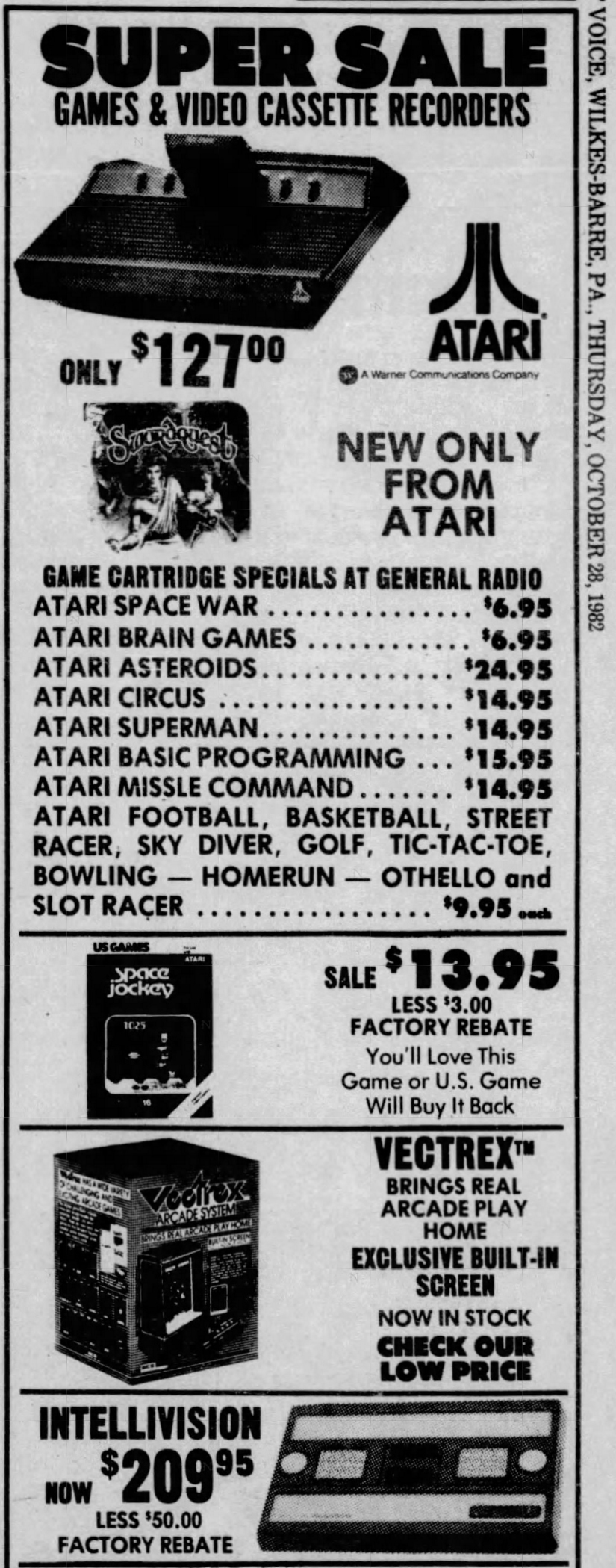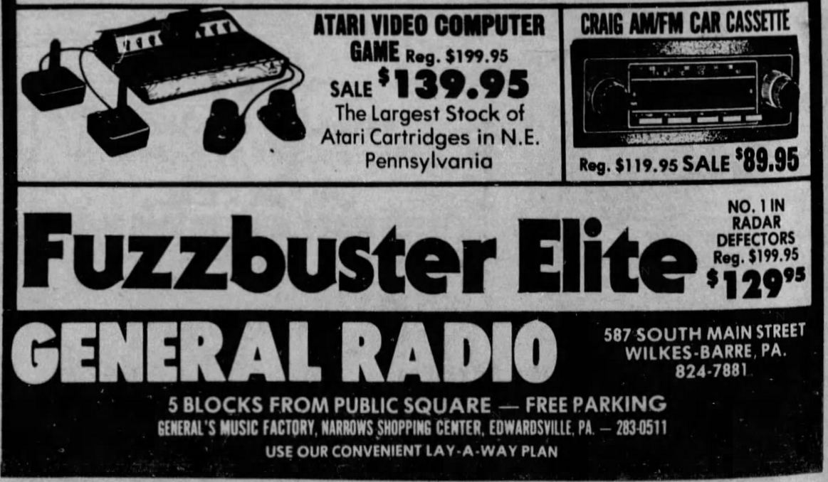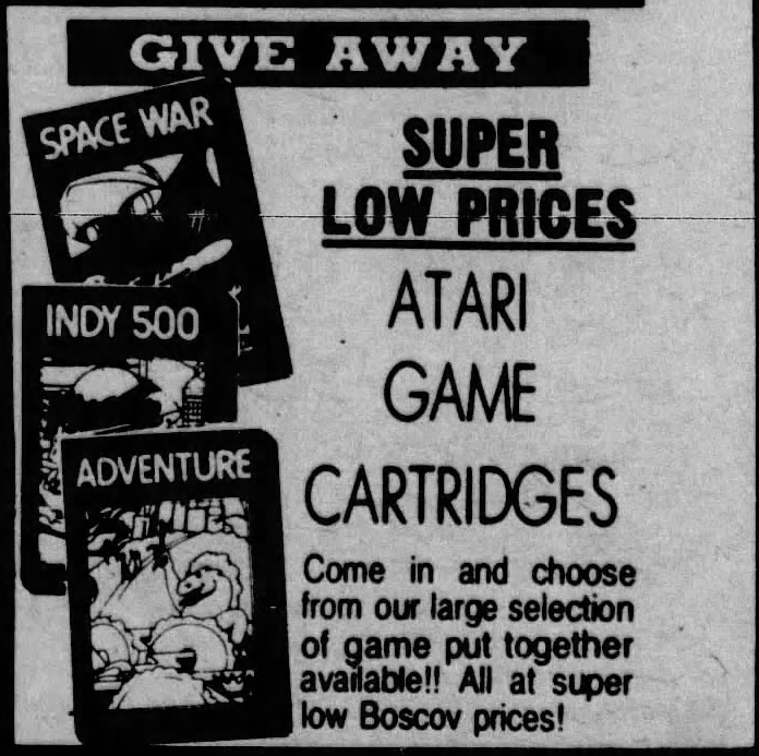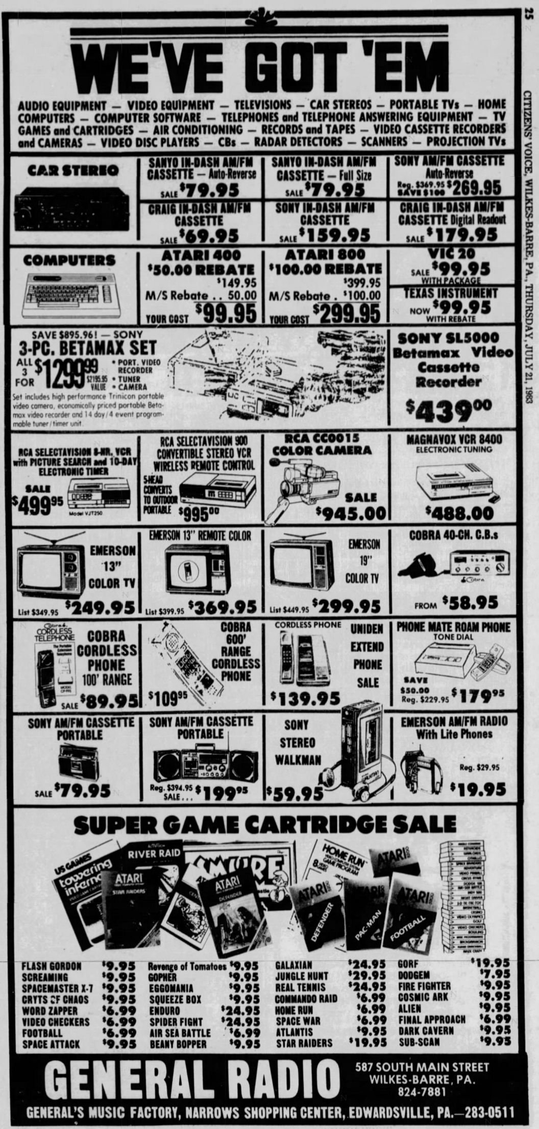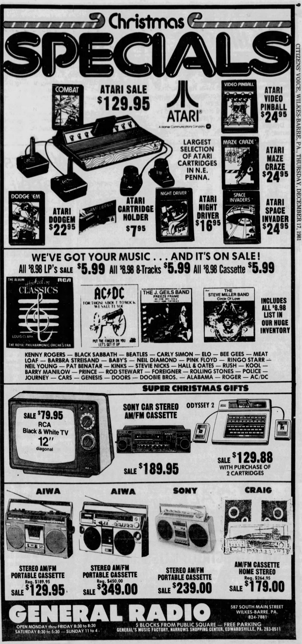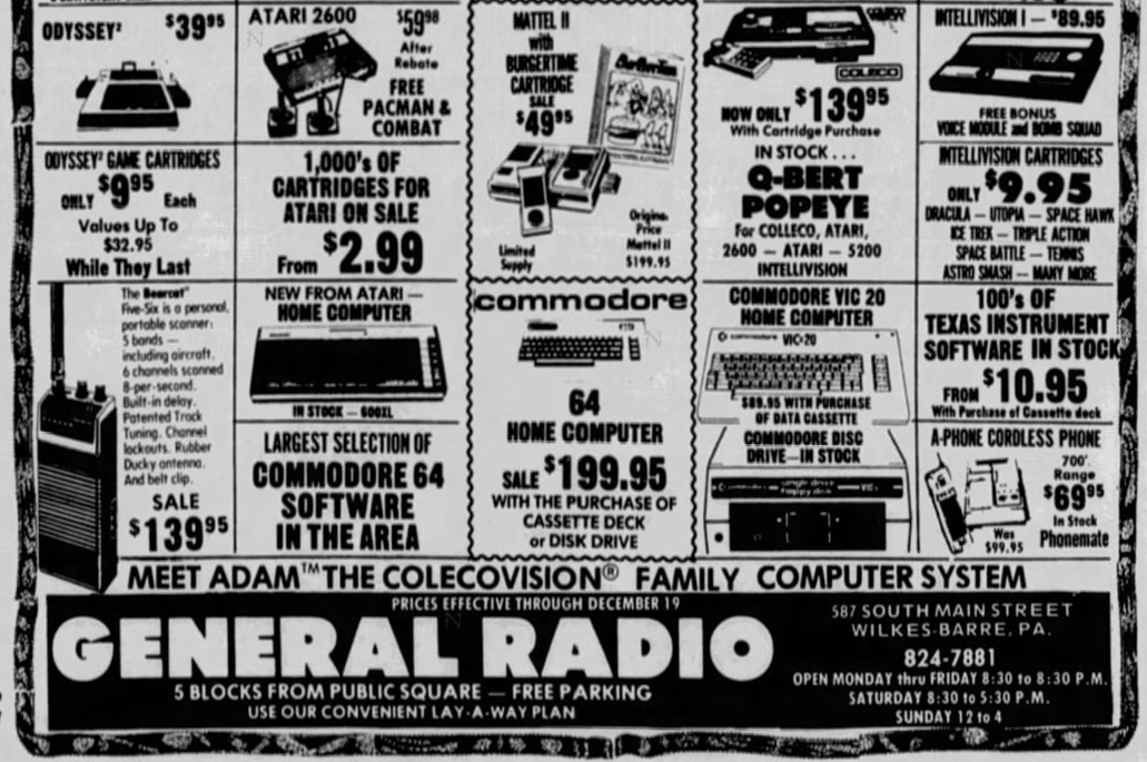 Thanks to the online archive Newspapers.com, an increasing number of newspaper archives that were previously only available on microfilm in select libraries are being scanned and digitized and made available online. The site recently added 1 of 2 local newspapers in my area, The Citizens' Voice, and I recently completed collecting every ad featuring Atari's systems and games from it. I've chosen all the Atari ads that ran between 1980 and 1984 from the 2 stores in my area that were *the* places to find the latest games, and who offered the largest selection of games - Boscov's and General Radio. Boscov's is a chain department store, and the location near me, in Wilkes-Barre, PA, was originally known as The Boston Store until it was purchased by Al Boscov. General Radio was an appliance store for large items like refrigerators, washers/dryers, and TVs, and was located a few blocks away on the same street as Boscov's. Both were quite aggressive in their advertising, and Boscov's in particular promoted Atari high score competitions in their stores and even sponsored a parade celebrating the release of Atari's VCS Pac-Man, and a visit from Pac-Man himself! These ads also serve to help determine more accurate release dates for games, as well as reveal the immediate effects of the market's crash as is unfolded over the last 18 months of Atari, Inc.'s existence.