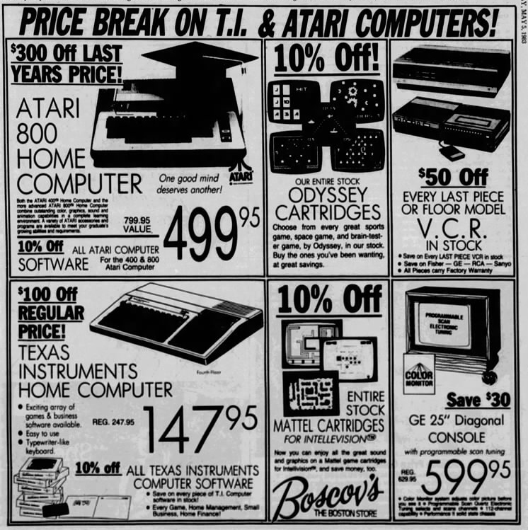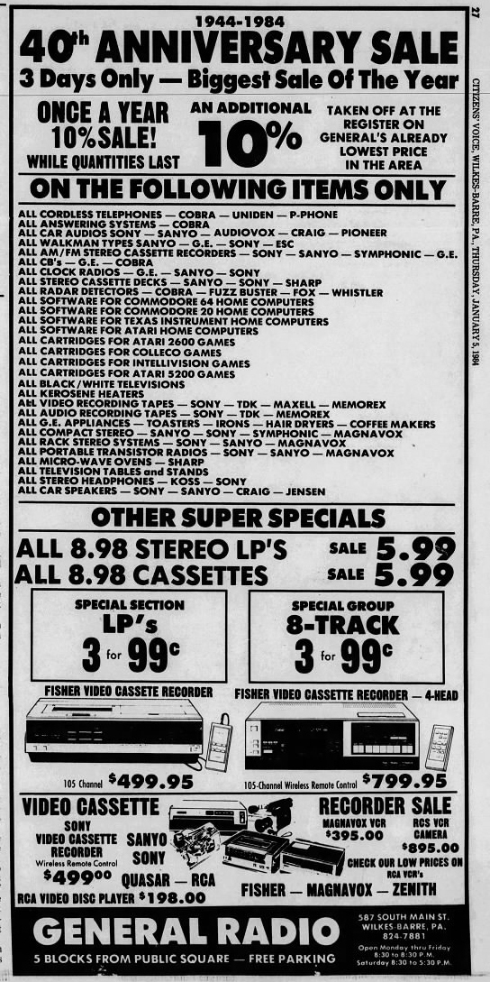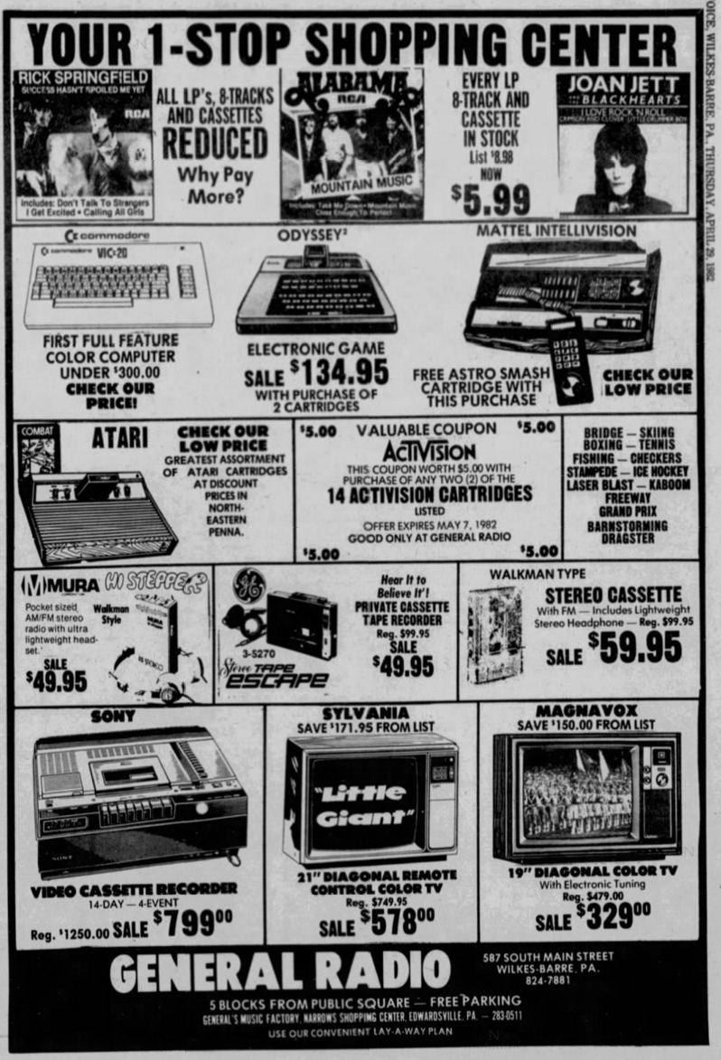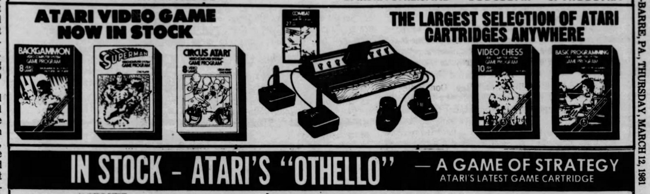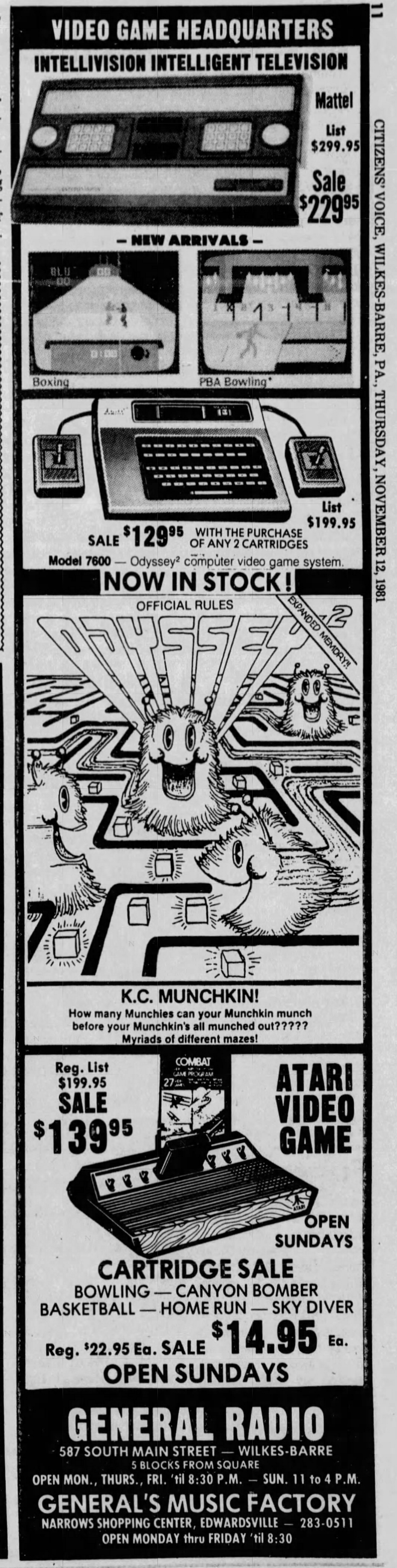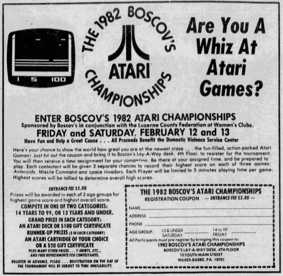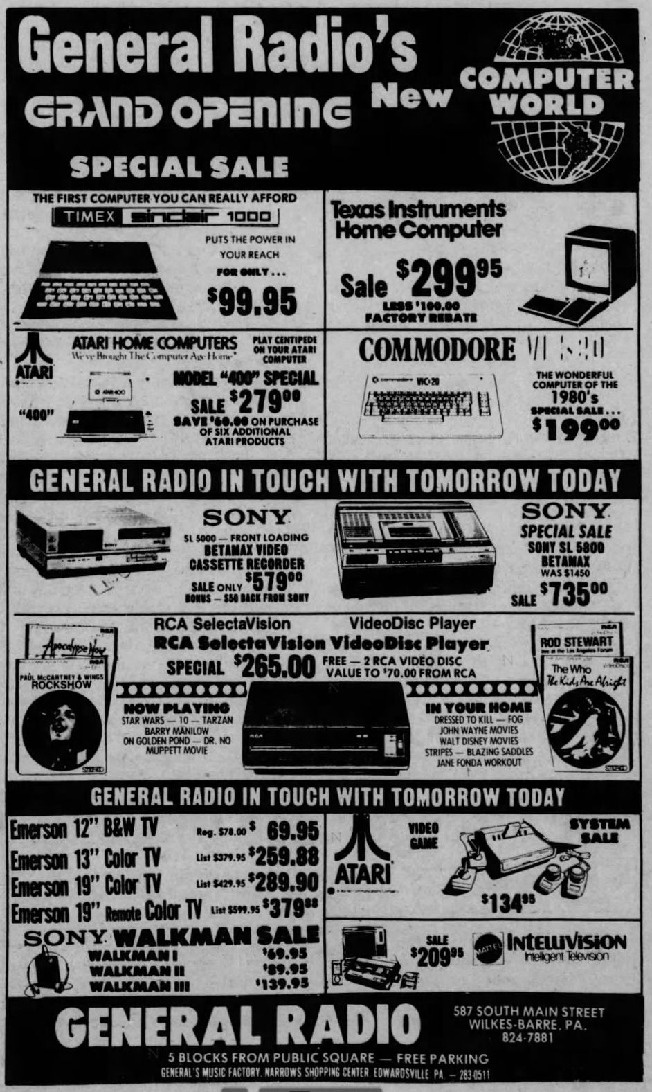 Thanks to the online archive Newspapers.com, an increasing number of newspaper archives that were previously only available on microfilm in select libraries are being scanned and digitized and made available online. The site recently added 1 of 2 local newspapers in my area, The Citizens' Voice, and I recently completed collecting every ad featuring Atari's systems and games from it. I've chosen all the Atari ads that ran between 1980 and 1984 from the 2 stores in my area that were *the* places to find the latest games, and who offered the largest selection of games - Boscov's and General Radio. Boscov's is a chain department store, and the location near me, in Wilkes-Barre, PA, was originally known as The Boston Store until it was purchased by Al Boscov. General Radio was an appliance store for large items like refrigerators, washers/dryers, and TVs, and was located a few blocks away on the same street as Boscov's. Both were quite aggressive in their advertising, and Boscov's in particular promoted Atari high score competitions in their stores and even sponsored a parade celebrating the release of Atari's VCS Pac-Man, and a visit from Pac-Man himself! These ads also serve to help determine more accurate release dates for games, as well as reveal the immediate effects of the market's crash as is unfolded over the last 18 months of Atari, Inc.'s existence.