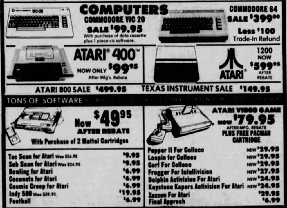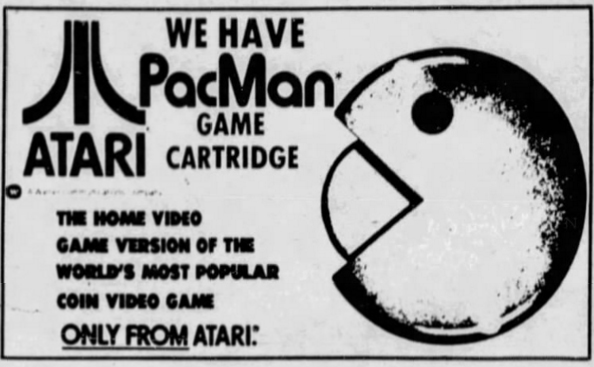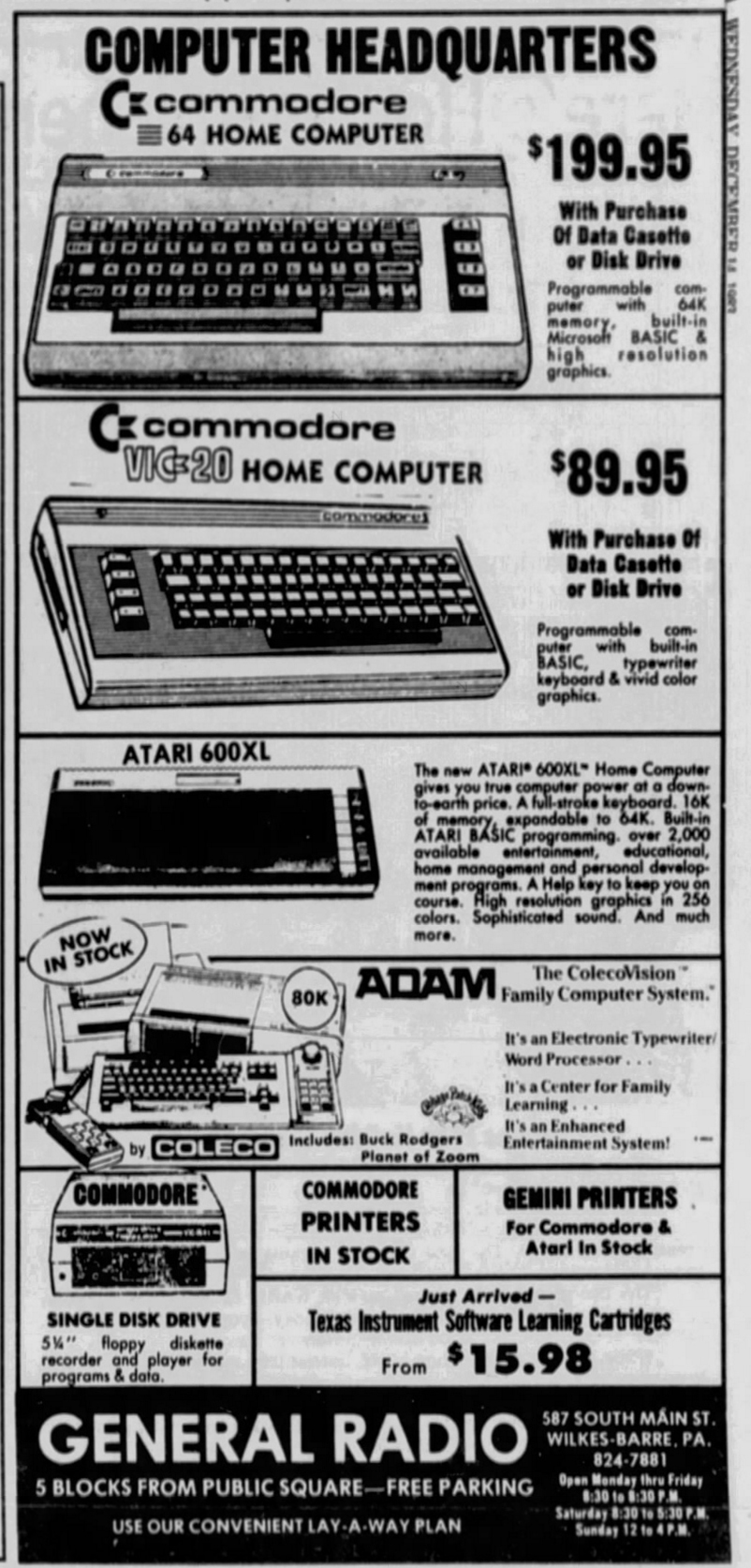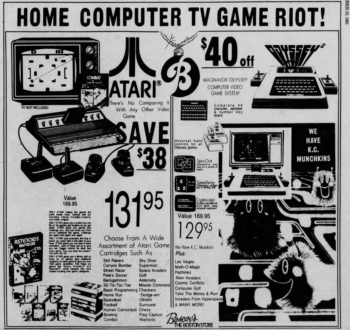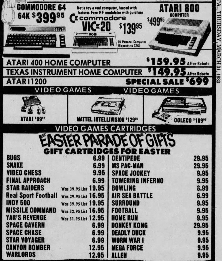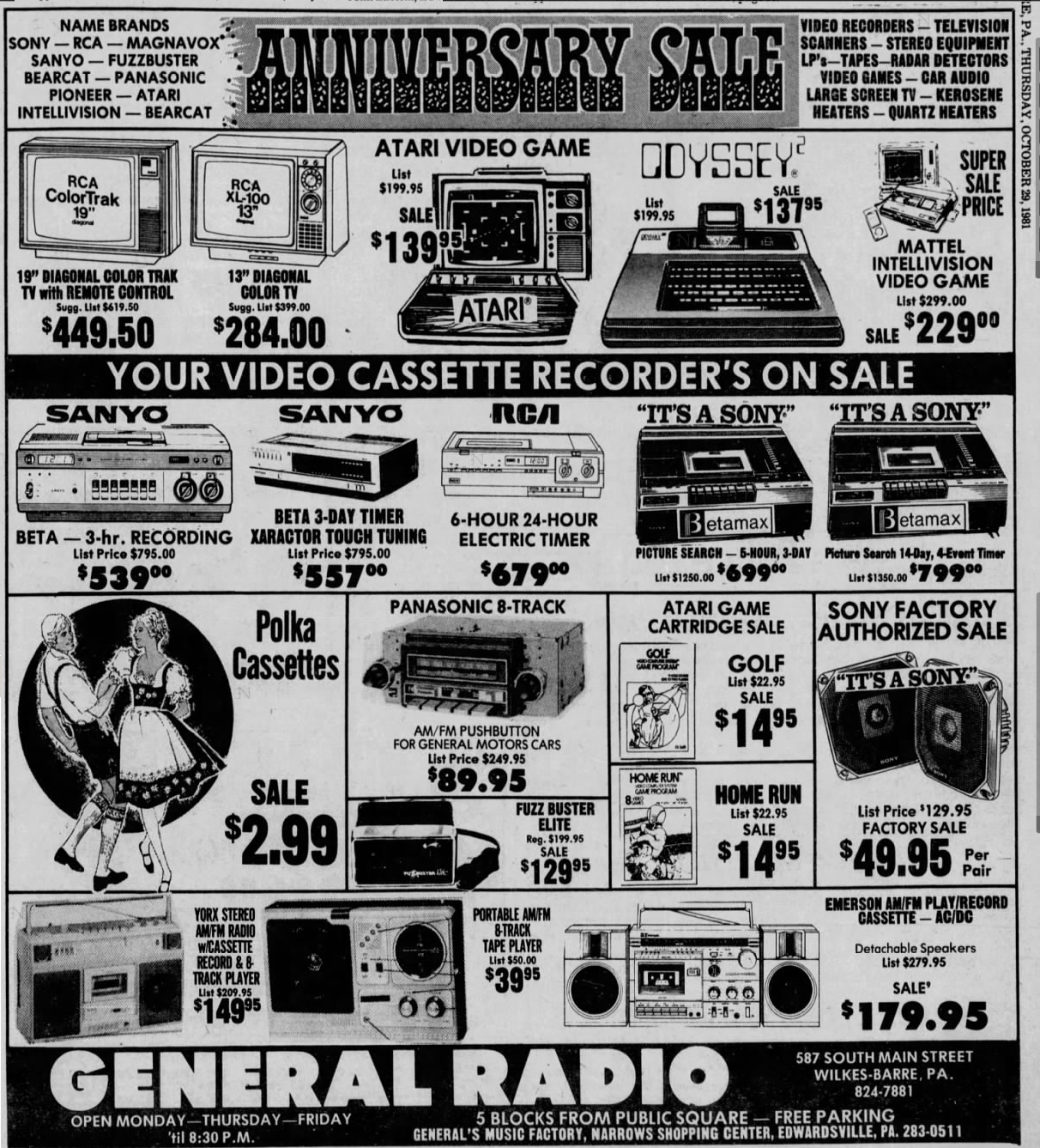 Thanks to the online archive Newspapers.com, an increasing number of newspaper archives that were previously only available on microfilm in select libraries are being scanned and digitized and made available online. The site recently added 1 of 2 local newspapers in my area, The Citizens' Voice, and I recently completed collecting every ad featuring Atari's systems and games from it. I've chosen all the Atari ads that ran between 1980 and 1984 from the 2 stores in my area that were *the* places to find the latest games, and who offered the largest selection of games - Boscov's and General Radio. Boscov's is a chain department store, and the location near me, in Wilkes-Barre, PA, was originally known as The Boston Store until it was purchased by Al Boscov. General Radio was an appliance store for large items like refrigerators, washers/dryers, and TVs, and was located a few blocks away on the same street as Boscov's. Both were quite aggressive in their advertising, and Boscov's in particular promoted Atari high score competitions in their stores and even sponsored a parade celebrating the release of Atari's VCS Pac-Man, and a visit from Pac-Man himself! These ads also serve to help determine more accurate release dates for games, as well as reveal the immediate effects of the market's crash as is unfolded over the last 18 months of Atari, Inc.'s existence.