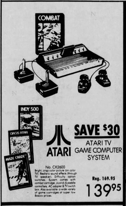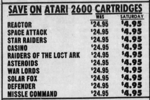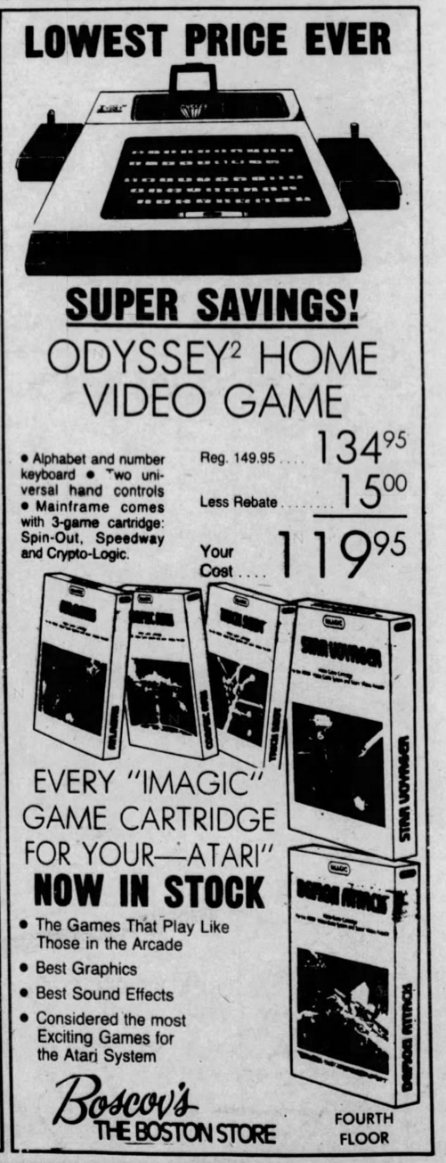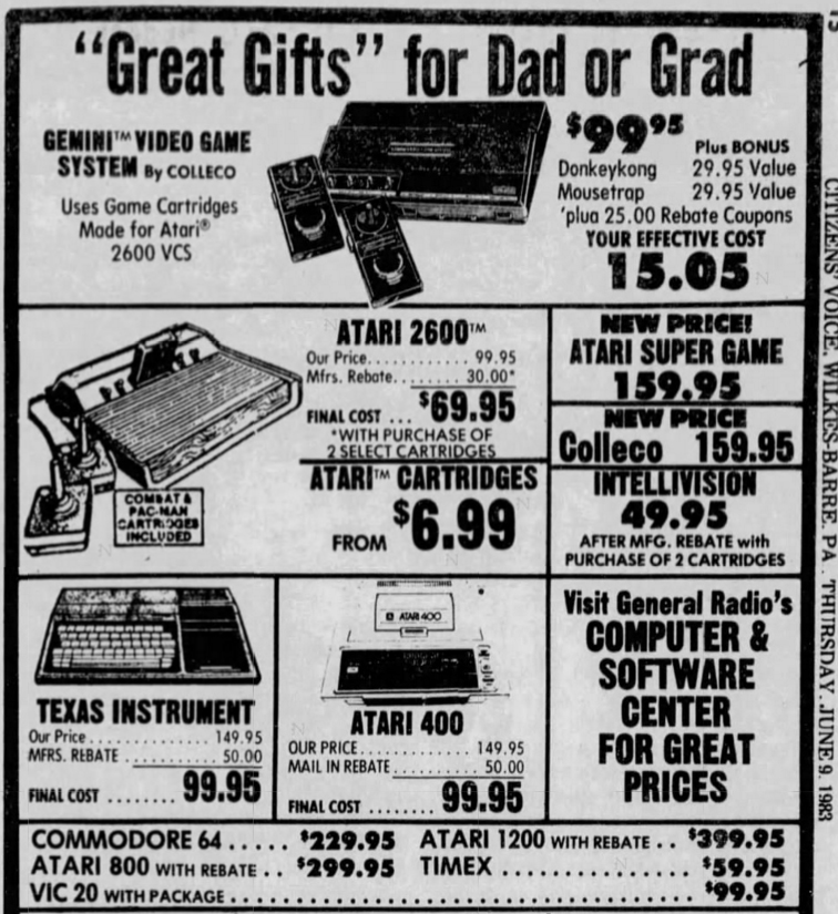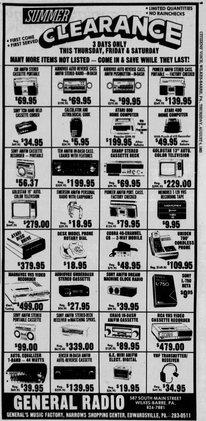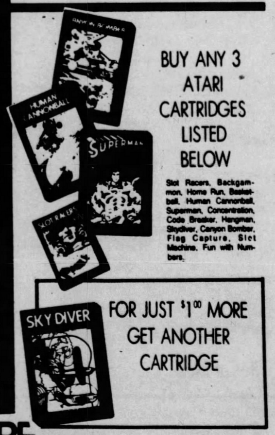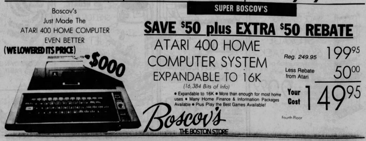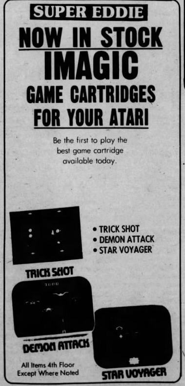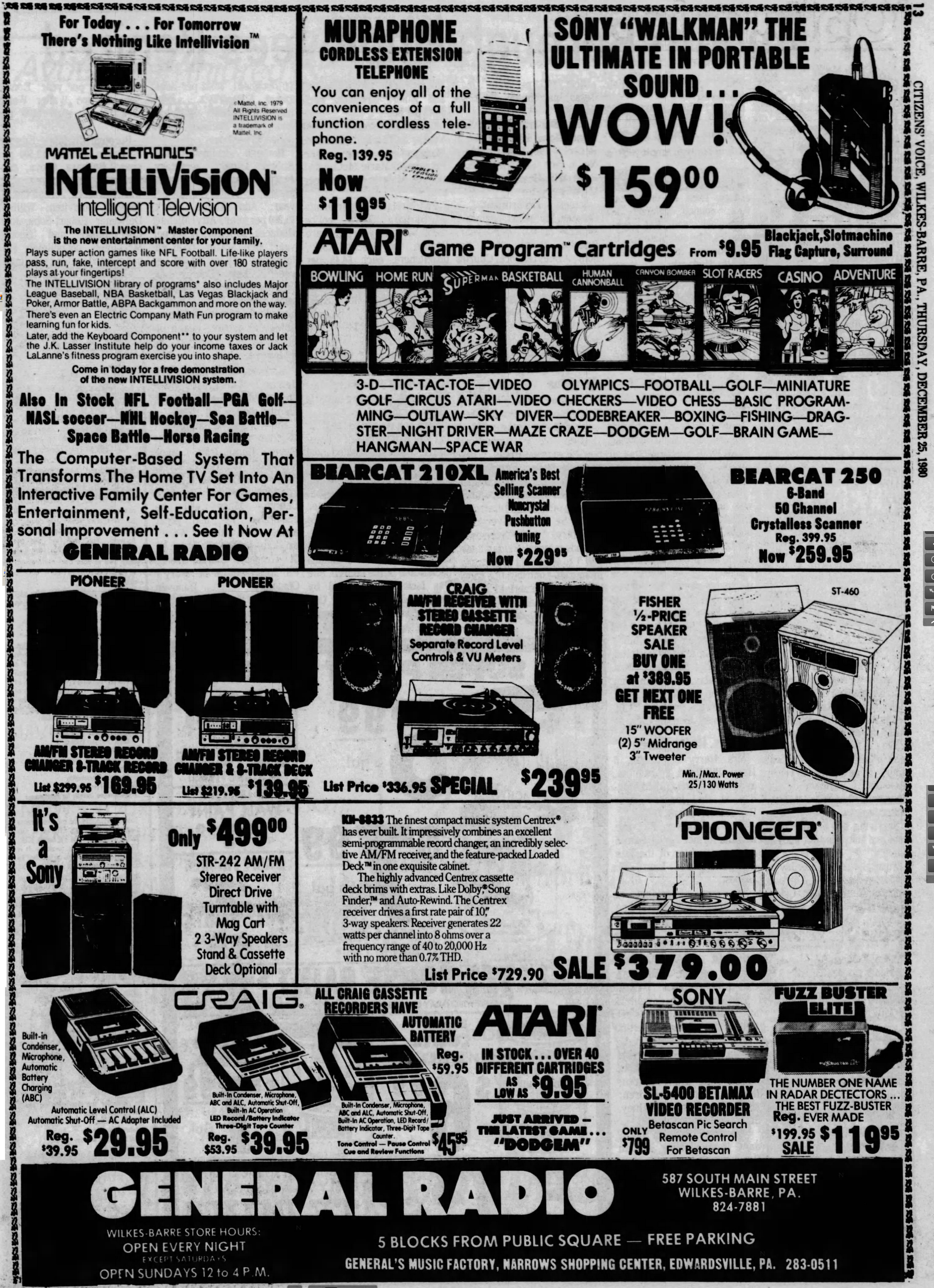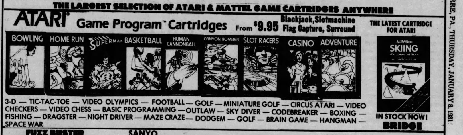 Thanks to the online archive Newspapers.com, an increasing number of newspaper archives that were previously only available on microfilm in select libraries are being scanned and digitized and made available online. The site recently added 1 of 2 local newspapers in my area, The Citizens' Voice, and I recently completed collecting every ad featuring Atari's systems and games from it. I've chosen all the Atari ads that ran between 1980 and 1984 from the 2 stores in my area that were *the* places to find the latest games, and who offered the largest selection of games - Boscov's and General Radio. Boscov's is a chain department store, and the location near me, in Wilkes-Barre, PA, was originally known as The Boston Store until it was purchased by Al Boscov. General Radio was an appliance store for large items like refrigerators, washers/dryers, and TVs, and was located a few blocks away on the same street as Boscov's. Both were quite aggressive in their advertising, and Boscov's in particular promoted Atari high score competitions in their stores and even sponsored a parade celebrating the release of Atari's VCS Pac-Man, and a visit from Pac-Man himself! These ads also serve to help determine more accurate release dates for games, as well as reveal the immediate effects of the market's crash as is unfolded over the last 18 months of Atari, Inc.'s existence.