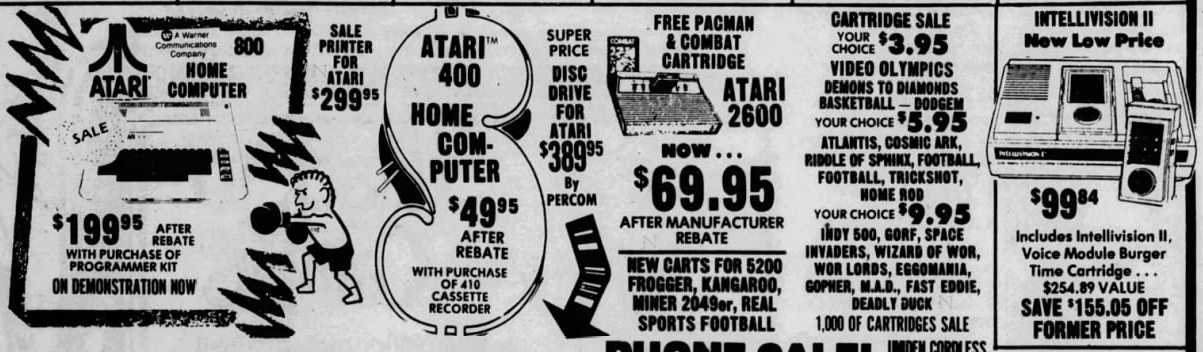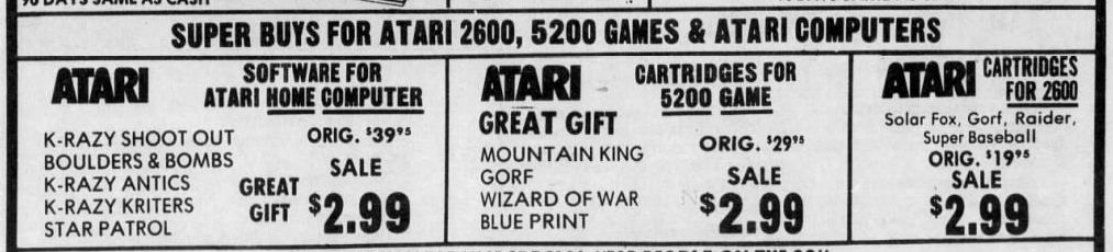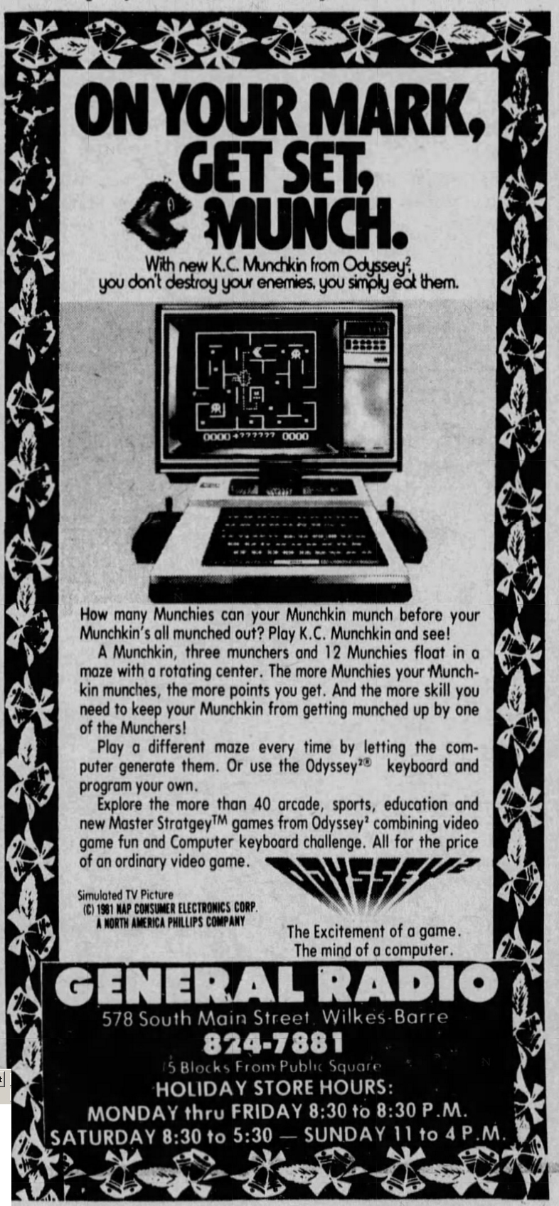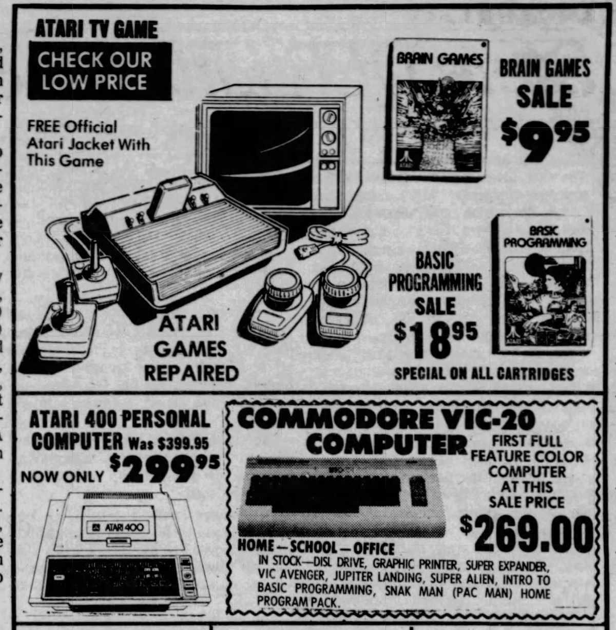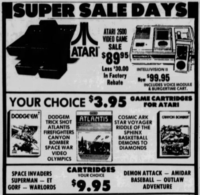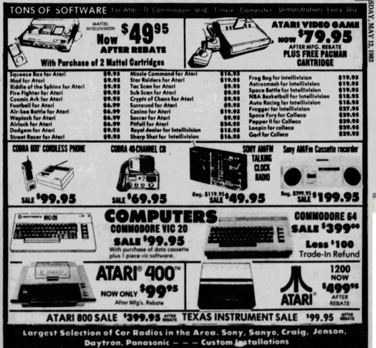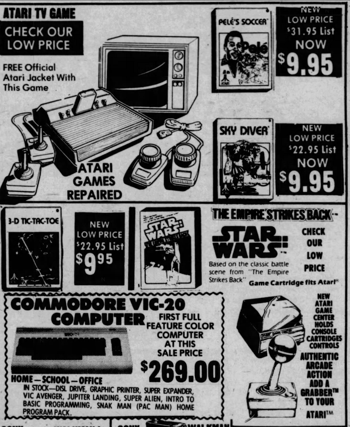 Thanks to the online archive Newspapers.com, an increasing number of newspaper archives that were previously only available on microfilm in select libraries are being scanned and digitized and made available online. The site recently added 1 of 2 local newspapers in my area, The Citizens' Voice, and I recently completed collecting every ad featuring Atari's systems and games from it. I've chosen all the Atari ads that ran between 1980 and 1984 from the 2 stores in my area that were *the* places to find the latest games, and who offered the largest selection of games - Boscov's and General Radio. Boscov's is a chain department store, and the location near me, in Wilkes-Barre, PA, was originally known as The Boston Store until it was purchased by Al Boscov. General Radio was an appliance store for large items like refrigerators, washers/dryers, and TVs, and was located a few blocks away on the same street as Boscov's. Both were quite aggressive in their advertising, and Boscov's in particular promoted Atari high score competitions in their stores and even sponsored a parade celebrating the release of Atari's VCS Pac-Man, and a visit from Pac-Man himself! These ads also serve to help determine more accurate release dates for games, as well as reveal the immediate effects of the market's crash as is unfolded over the last 18 months of Atari, Inc.'s existence.