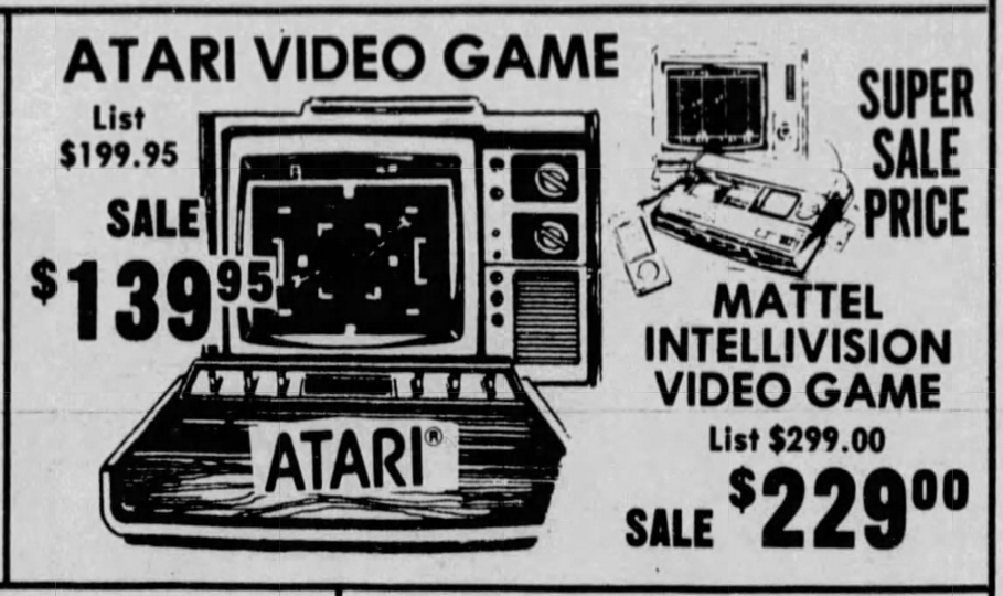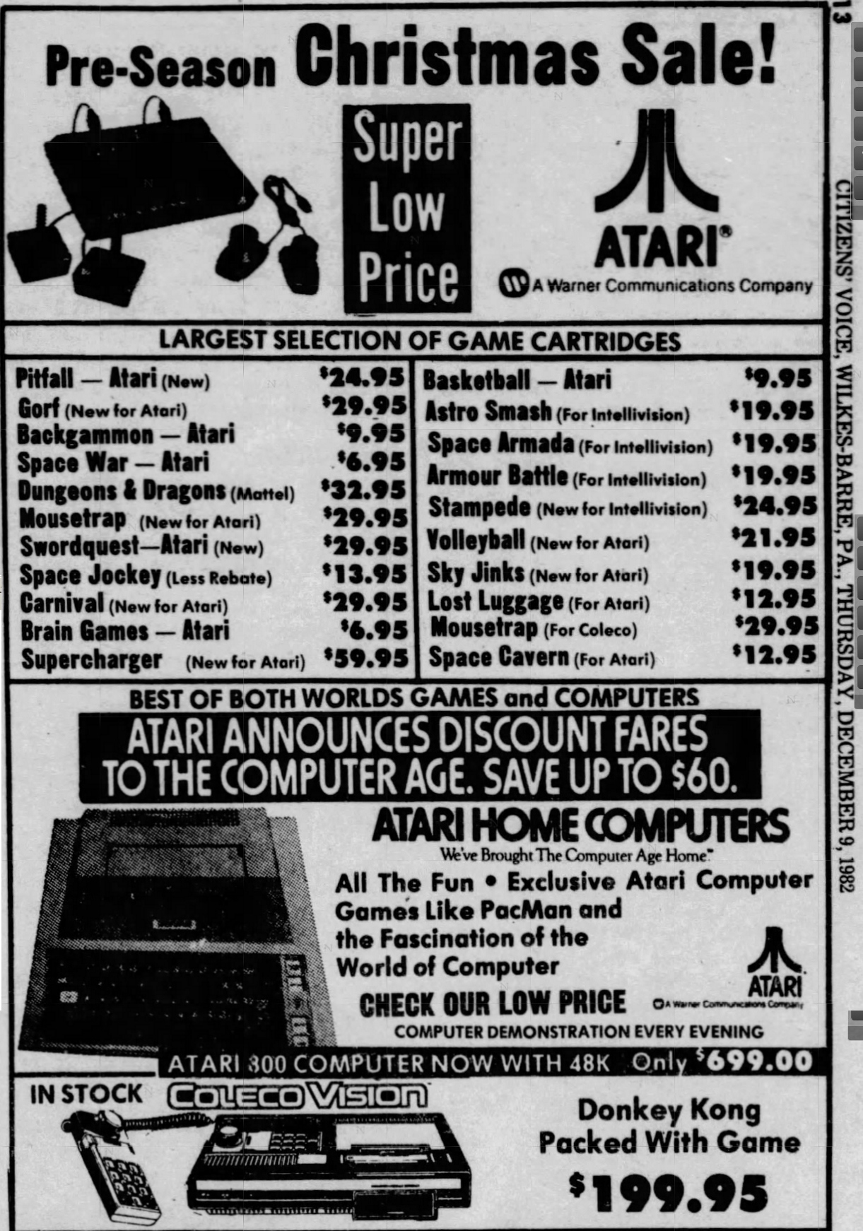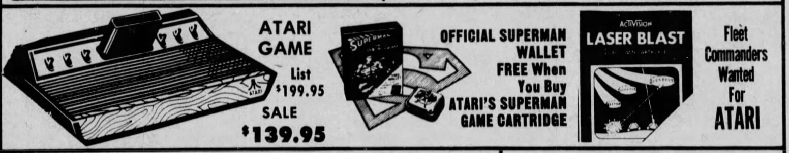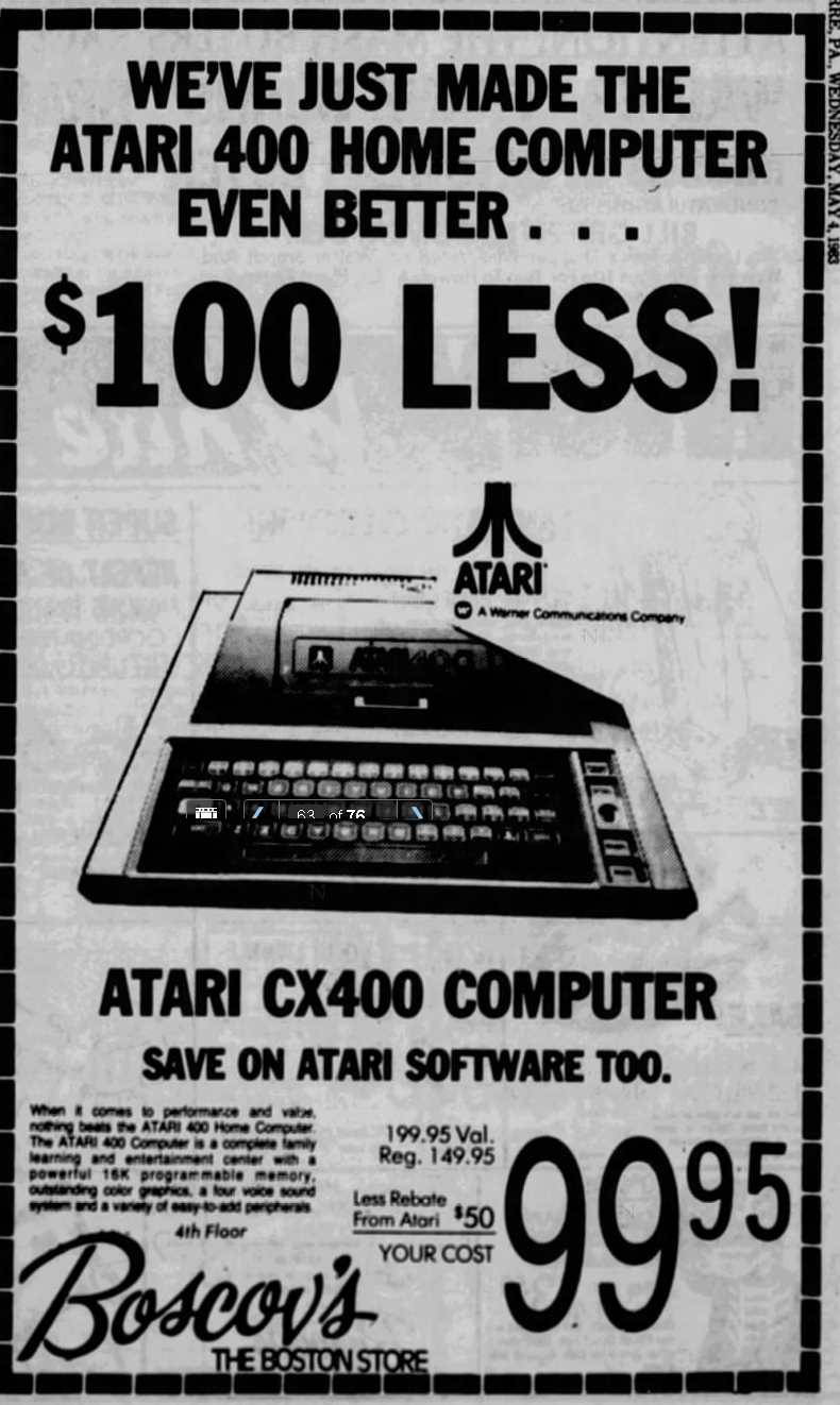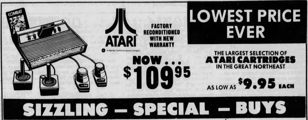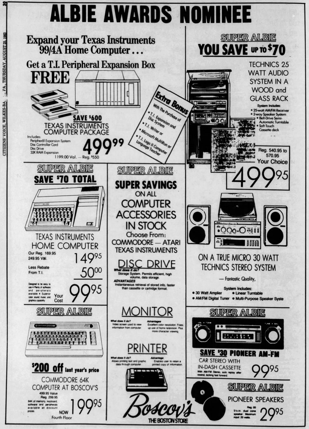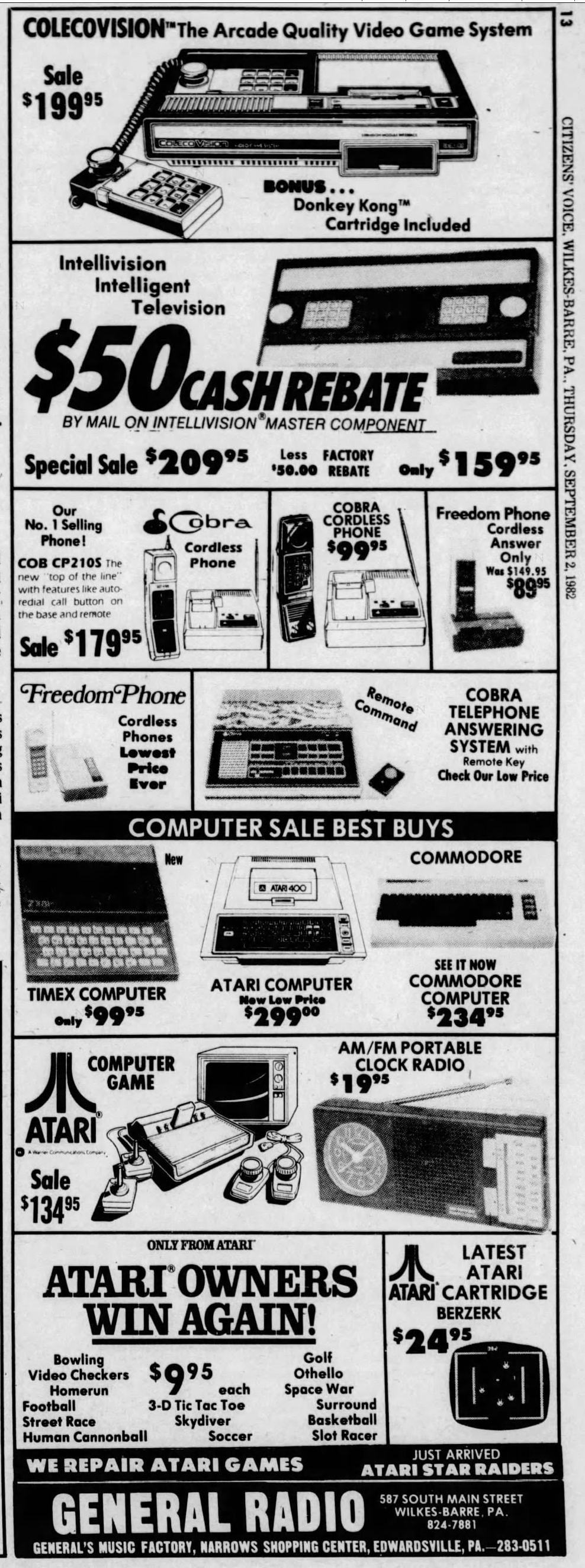Thanks to the online archive Newspapers.com, an increasing number of newspaper archives that were previously only available on microfilm in select libraries are being scanned and digitized and made available online. The site recently added 1 of 2 local newspapers in my area, The Citizens' Voice, and I recently completed collecting every ad featuring Atari's systems and games from it. I've chosen all the Atari ads that ran between 1980 and 1984 from the 2 stores in my area that were *the* places to find the latest games, and who offered the largest selection of games - Boscov's and General Radio. Boscov's is a chain department store, and the location near me, in Wilkes-Barre, PA, was originally known as The Boston Store until it was purchased by Al Boscov. General Radio was an appliance store for large items like refrigerators, washers/dryers, and TVs, and was located a few blocks away on the same street as Boscov's. Both were quite aggressive in their advertising, and Boscov's in particular promoted Atari high score competitions in their stores and even sponsored a parade celebrating the release of Atari's VCS Pac-Man, and a visit from Pac-Man himself! These ads also serve to help determine more accurate release dates for games, as well as reveal the immediate effects of the market's crash as is unfolded over the last 18 months of Atari, Inc.'s existence.