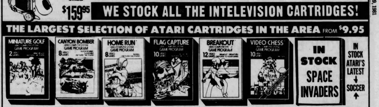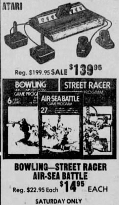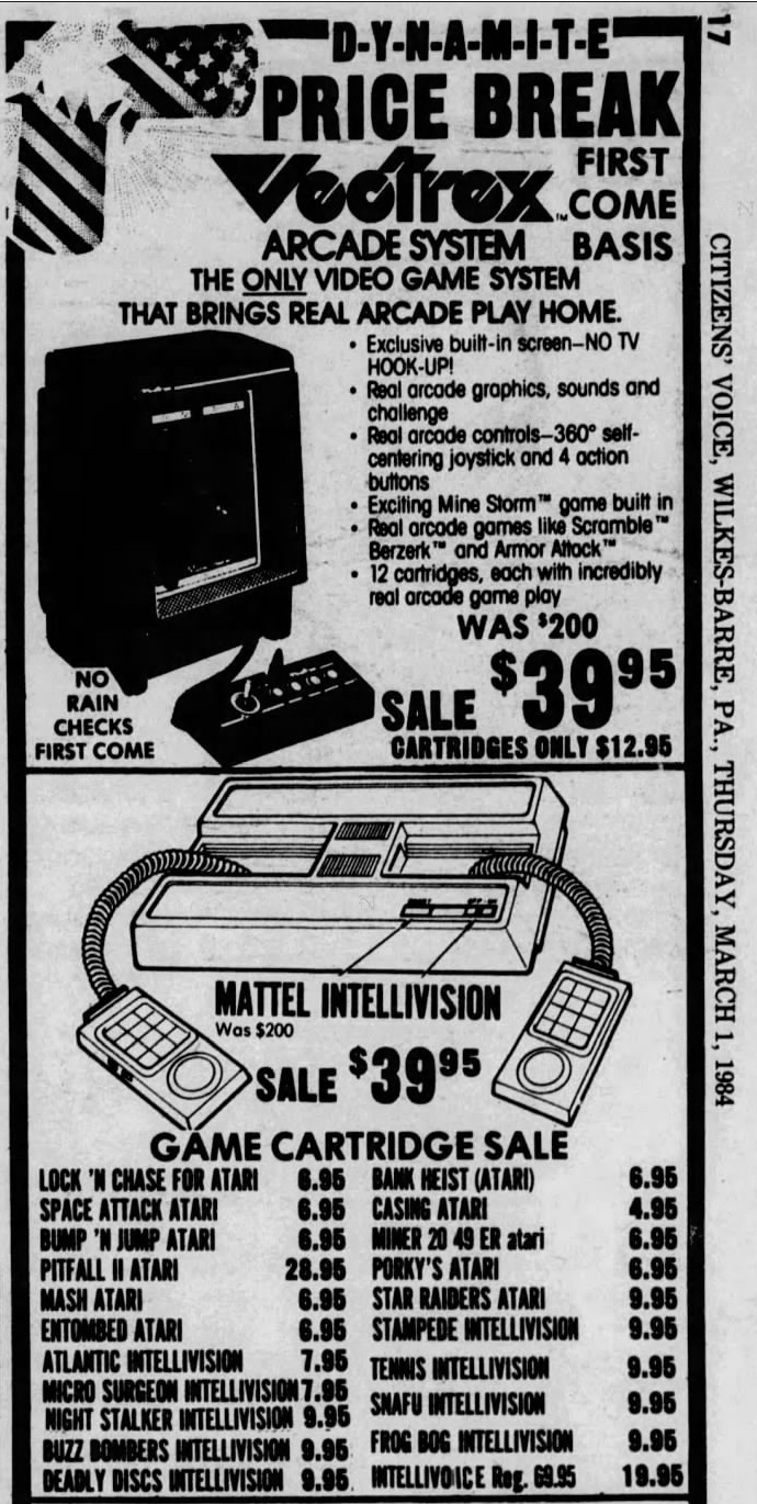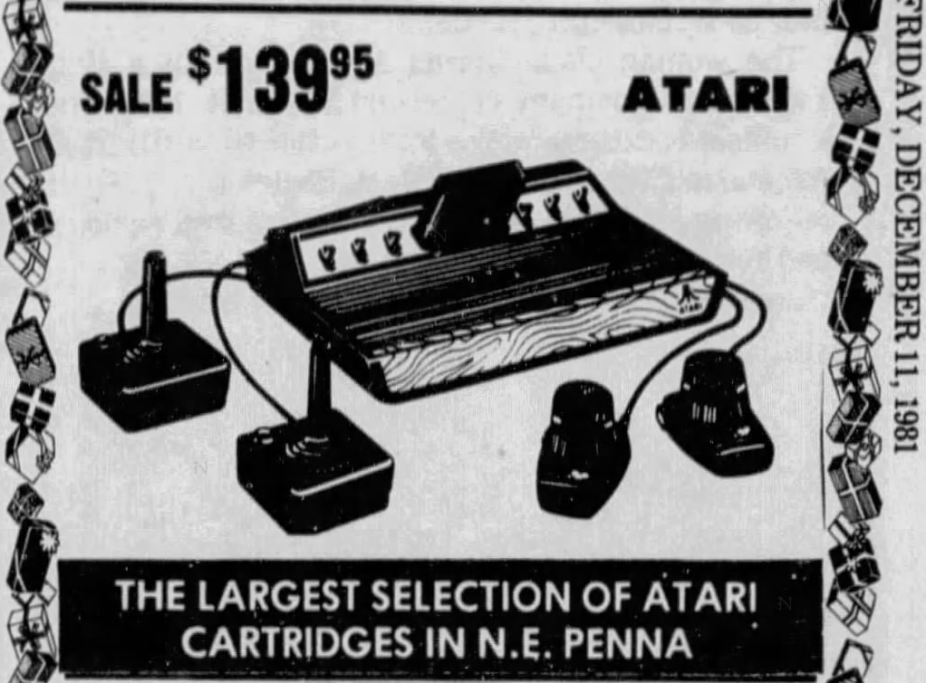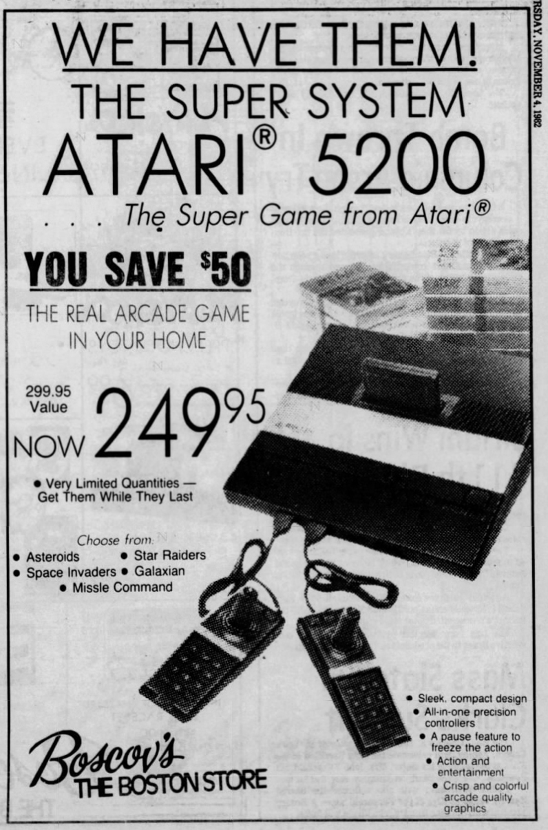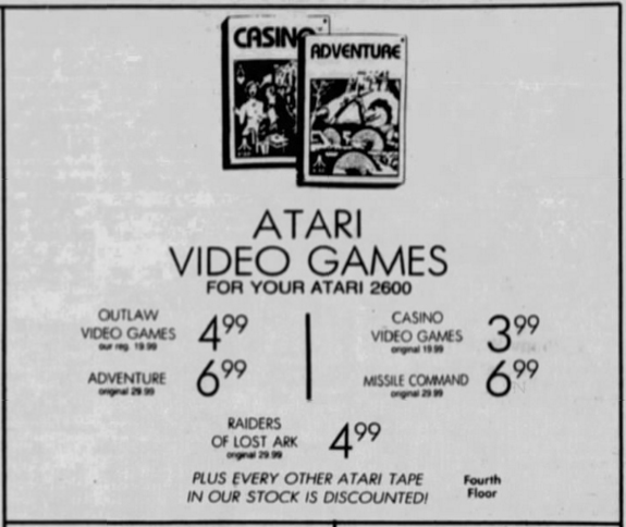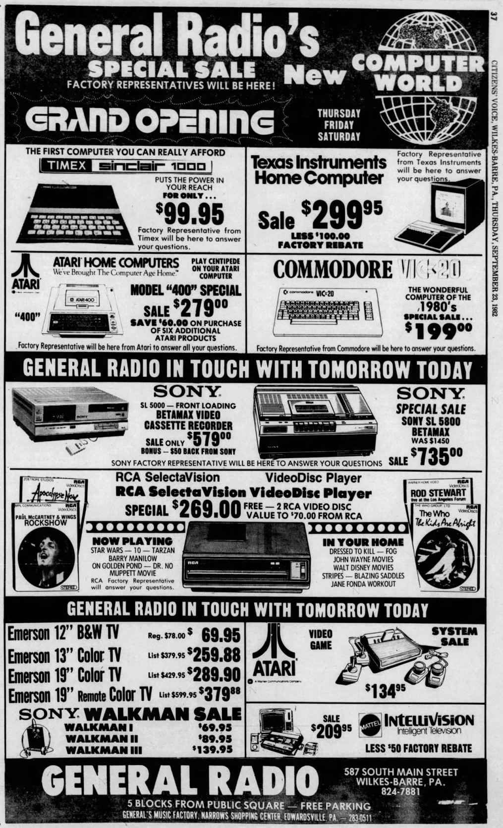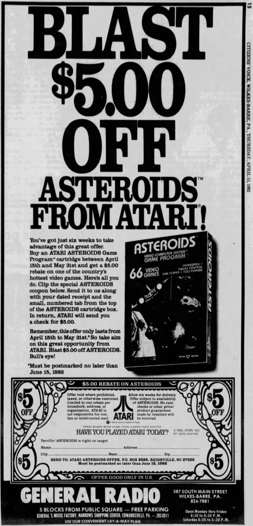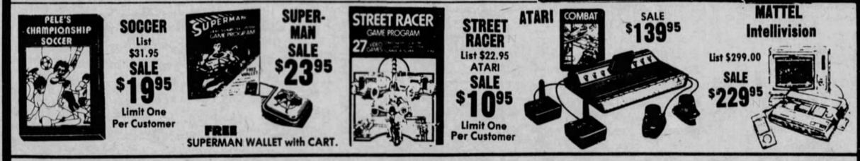 Thanks to the online archive Newspapers.com, an increasing number of newspaper archives that were previously only available on microfilm in select libraries are being scanned and digitized and made available online. The site recently added 1 of 2 local newspapers in my area, The Citizens' Voice, and I recently completed collecting every ad featuring Atari's systems and games from it. I've chosen all the Atari ads that ran between 1980 and 1984 from the 2 stores in my area that were *the* places to find the latest games, and who offered the largest selection of games - Boscov's and General Radio. Boscov's is a chain department store, and the location near me, in Wilkes-Barre, PA, was originally known as The Boston Store until it was purchased by Al Boscov. General Radio was an appliance store for large items like refrigerators, washers/dryers, and TVs, and was located a few blocks away on the same street as Boscov's. Both were quite aggressive in their advertising, and Boscov's in particular promoted Atari high score competitions in their stores and even sponsored a parade celebrating the release of Atari's VCS Pac-Man, and a visit from Pac-Man himself! These ads also serve to help determine more accurate release dates for games, as well as reveal the immediate effects of the market's crash as is unfolded over the last 18 months of Atari, Inc.'s existence.