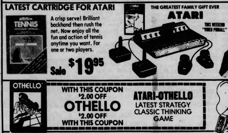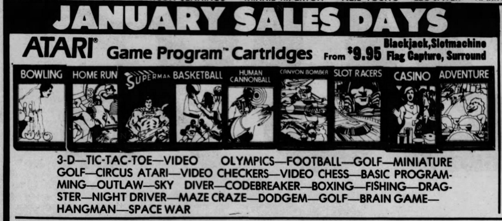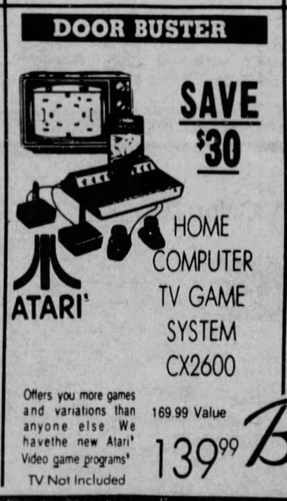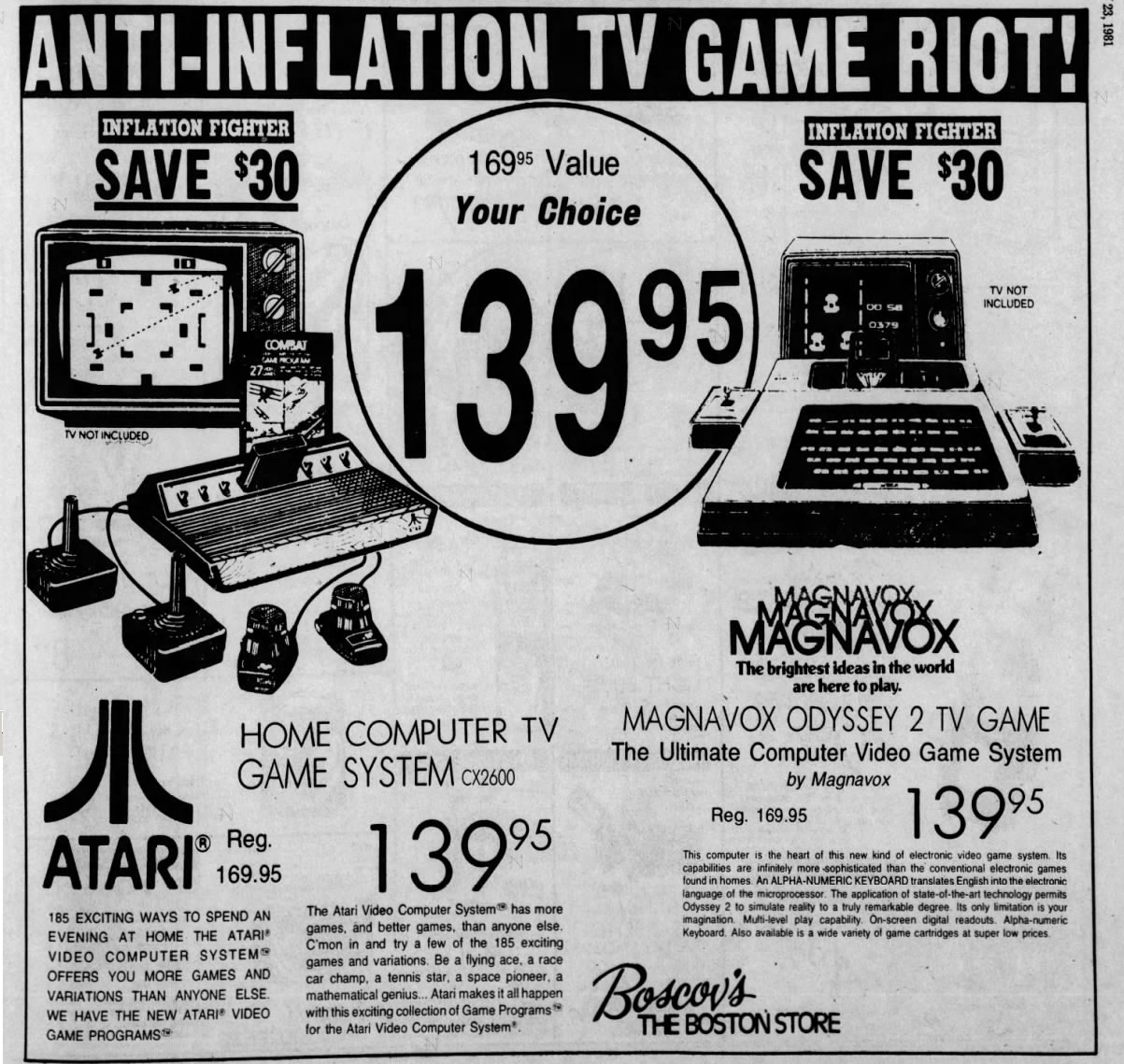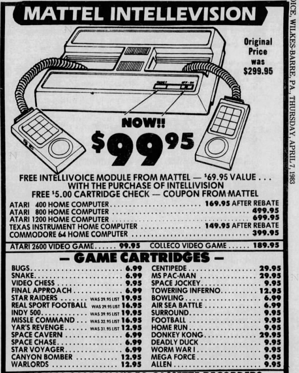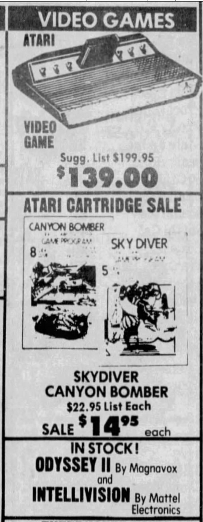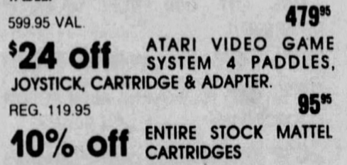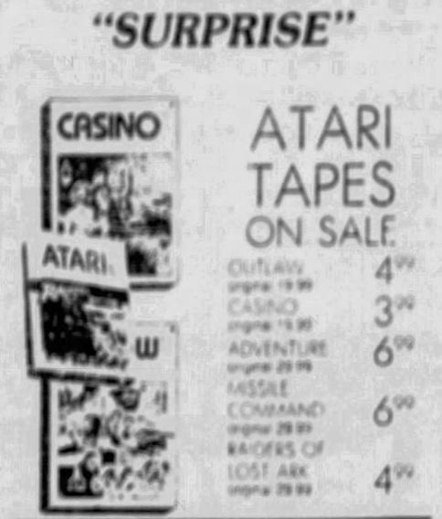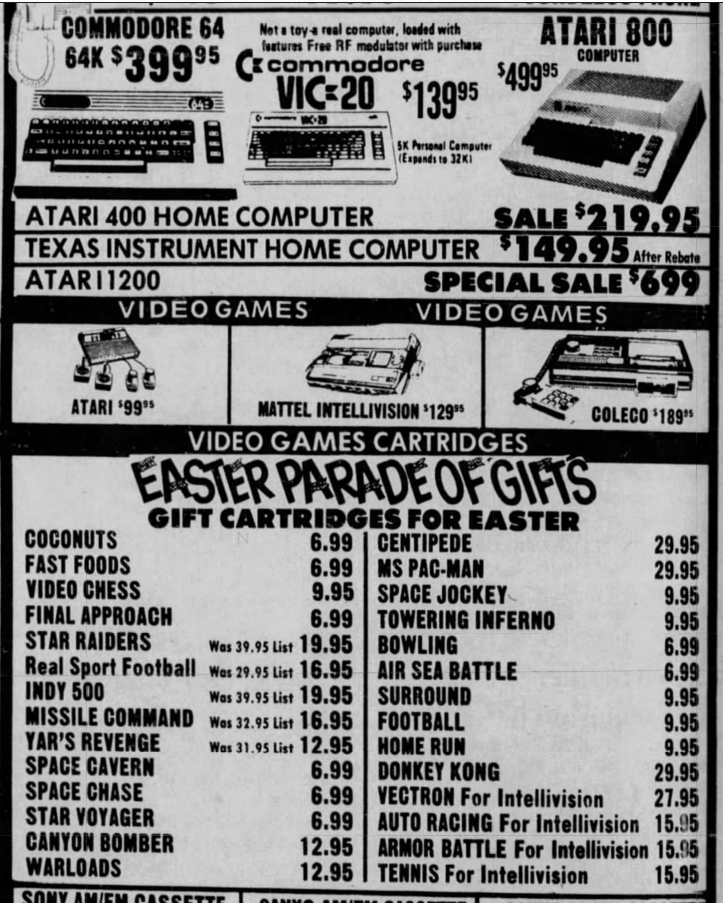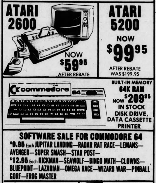 Thanks to the online archive Newspapers.com, an increasing number of newspaper archives that were previously only available on microfilm in select libraries are being scanned and digitized and made available online. The site recently added 1 of 2 local newspapers in my area, The Citizens' Voice, and I recently completed collecting every ad featuring Atari's systems and games from it. I've chosen all the Atari ads that ran between 1980 and 1984 from the 2 stores in my area that were *the* places to find the latest games, and who offered the largest selection of games - Boscov's and General Radio. Boscov's is a chain department store, and the location near me, in Wilkes-Barre, PA, was originally known as The Boston Store until it was purchased by Al Boscov. General Radio was an appliance store for large items like refrigerators, washers/dryers, and TVs, and was located a few blocks away on the same street as Boscov's. Both were quite aggressive in their advertising, and Boscov's in particular promoted Atari high score competitions in their stores and even sponsored a parade celebrating the release of Atari's VCS Pac-Man, and a visit from Pac-Man himself! These ads also serve to help determine more accurate release dates for games, as well as reveal the immediate effects of the market's crash as is unfolded over the last 18 months of Atari, Inc.'s existence.