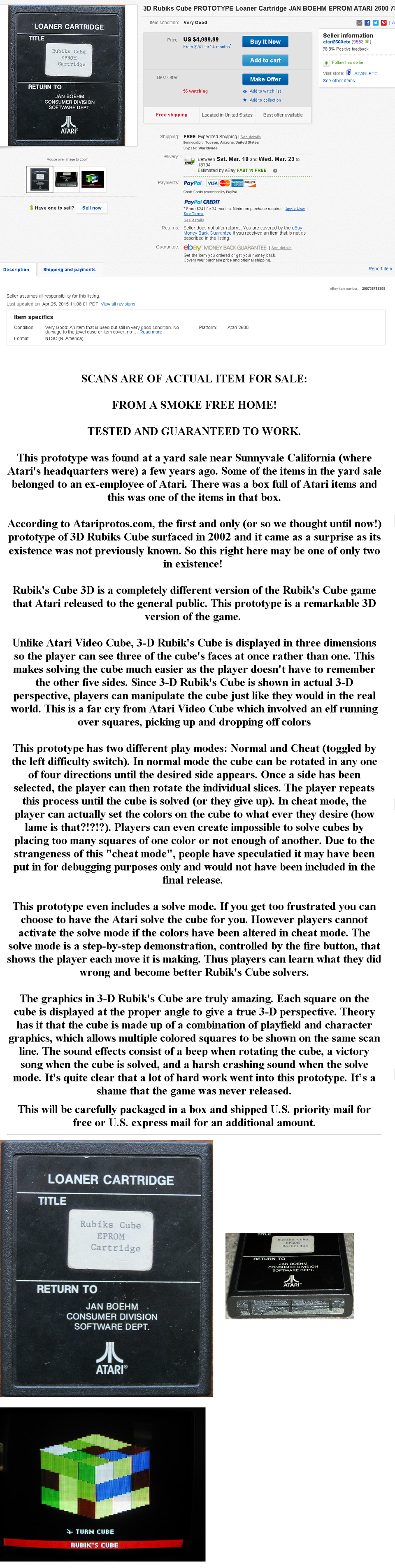 “I need urgent money to pay a couple fat bills, so I'm (auctioning off a cart) I own the unique prototype of this game and arranged a special License Agreement with the company who owns the rights of the Rubik's Cube game, so I made with Atari Age a limited edition of 250 copies for this game. This is done in a totally legal manner. Note that I may consider selling privately the prototype as well, but please don't come with questions like "how much ?". Just send me your offers and then I'll think about it.” (i.e. send me some ridiculous offers and I’ll go with the highest one)