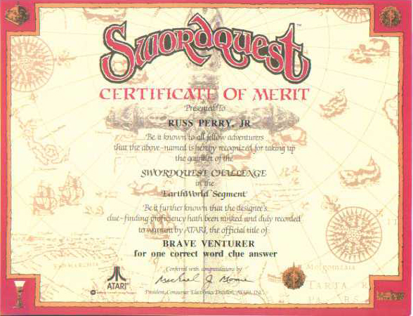 We hope you like your certificate and will display it with justifiable pride for a job well done in the ATARI SWORDQUEST CHALLENGE.