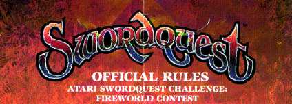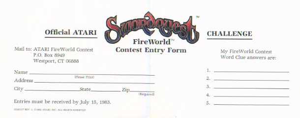 Challenge open to any U.S. resident except employees of Atari, its advertising and promotional agencies, the judging firm, and their immediate families. Only one entry per person in each separate SWORDQUEST CHALLENGE Contest Segment. (This is the FireWorld Contest segment.) Duplicate entries will be eliminated by computer and multiple Certificates of Merit will not be issued.