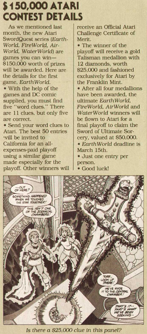| Then came Swordquest. Gerry Conway and I came up again and huddled with a couple of Atari’s engineers. The company had this general idea for a series of four interconnected games under the banner 'Swordquest', with a grand prize they’d promote to help sell it. A sword was to be buried somewhere in the United States, and the person who found it – working from clues that were to be imbedded in the games themselves – would get a