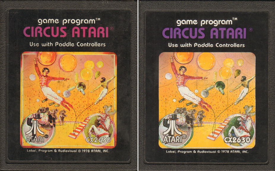 ► Circus Atari – Some labels feature slightly different artwork from what's on the box and manual. Note the border around the artwork (picture #1), which is the same as what's on the box. A variation exists without the border (picture #2).