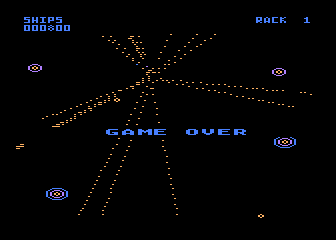 Anthony Weber:The flag ship graphic was something that I added to connect Galactic Chase to Star Island. It took me almost seven months of nights and weekends to develop S.I., and only about three for G.C., even with the false start of trying graphics for the aliens rather than modified character sets.