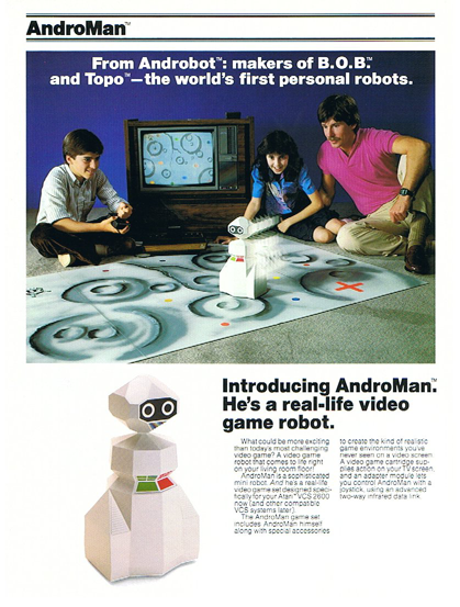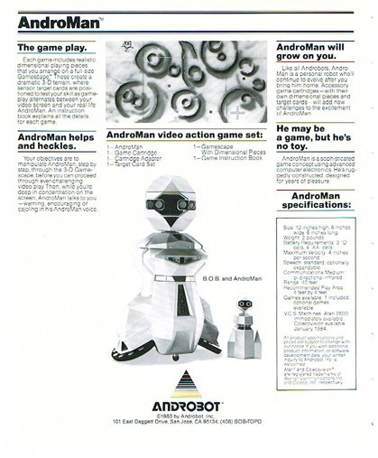 Q: It’s a real shame that AndroMan never saw release. It sounded like a great product that was close (?) to being finished, especially in light of Nintendo’s early success of launching their NES system with a simplified version of what basically was AndroMan – R.O.B. I’m especially surprised that the project wasn’t purchased and released by someone else.