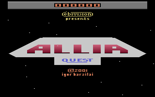 Allia Quest is Igor Barzilai's second solo Atari VCS game (the other being Merlin's Walls), and Ebivision's 6th and last. Once again, Ebivision showed how they really maximized using the console's original 4K ROM size limitation. The game features a nice title screen with a scrolling starfield background. The gameplay is similar to Threshold and Rescue Terra I. There's only 1 game variation. You're faced with 8 different types of enemies, each coming in a wave of 20. The enemies consist of different shapes, each featuring multiple colors that change with each level of gameplay. When you shoot an enemy, it disappears in a little animated flourish. Coupled with the now dual-layered parallax-scrolling starfield, these graphical touches give the game a very polished and professional look.
