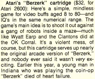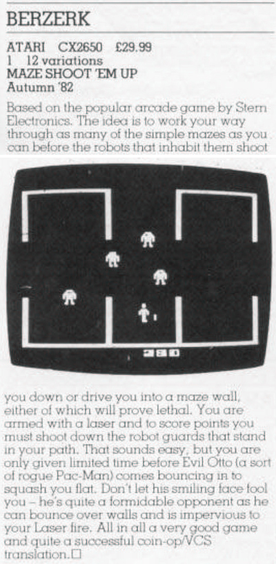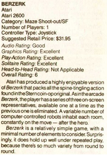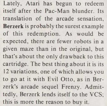 Since I've owned a Berzerk machine for almost 30 years now, I haven't really played this cart in ages but decided to take another look. Since they say hindsight is everything, I was curious as to how the VCS version really compares to the actual arcade game after all these years. I'm happy to report that I was pleasantly surprised here.
