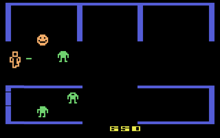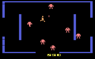 The enemy robots are nowhere near as 'stupid' as they are in the arcade game. In the VCS version, they actively avoid each other instead of wiping themselves out all the time and, more interestingly, they never poke their heads above the walls so you can pick them off. In the arcade game, if you're on the right side of the screen preparing to exit the room and there's a stray robot on the left side, he'll usually walk up the screen and stick his head above the wall so you can pick