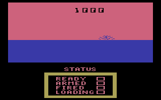 This is a solid sea battle style game. The point of view is through the glass of a periscope. Once again, the controls are tight, and handle pretty good. The Select button will cycle through game variations. You can choose between guided or fixed torpedoes and the number of torpedoes you start with can be 30, 60, or 90. You control the crosshairs of the targeting sight. When you press fire, the crosshairs appear, when you release the fire button your torpedoes tear through the water towards the enemy. Blow up the ships and you score points. Some ships are fast, others are slow. Some will sink with one correctly placed shot and some take multiple shots to destroy. You have a status section at the bottom of the screen that displays information showing when you are Ready, Armed, Fired and Loading. Holding the fire button down will cycle between your score and how many torpedoes you have left. Once you are depleted of your torpedoes, "00" will be displayed and you will hear a loud tone. That is when the game comes to an end. At this point even though you can control your crosshairs, you are simply waiting for the next cruiser to finish you off. The game will also end if you are blown out of the water, displayed by a beautiful explosion, and then it's, "You sank my battleship!" Good game play, sound is good, graphics are good and has a decent replay value.