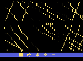 FireWorld is basically more of the same, only without most of the graphical treatments from EarthWorld. Gone is the amazing title screen, replaced by an attract mode that cycles through all the doorways and skill tests. The 4-color character you controlled in EarthWorld is now 1-color (black), making him look less like a man and more like a robot... or maybe he's been sunburned to a crisp from being in FireWorld too long. Walking to another doorway still offers the same 1st-person POV effect, but instead of random sounds, you get a single tone. The dark, rich colors of EarthWorld have been replaced by light, overly-bright colors, making some of the skill tests rather hard to see. It seems programmer Tod Frye's garish color choices with Pac-Man spilled over onto FireWorld.