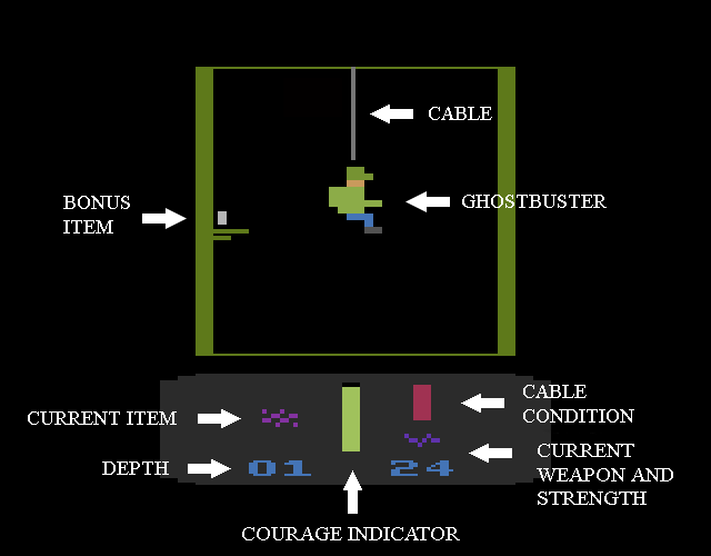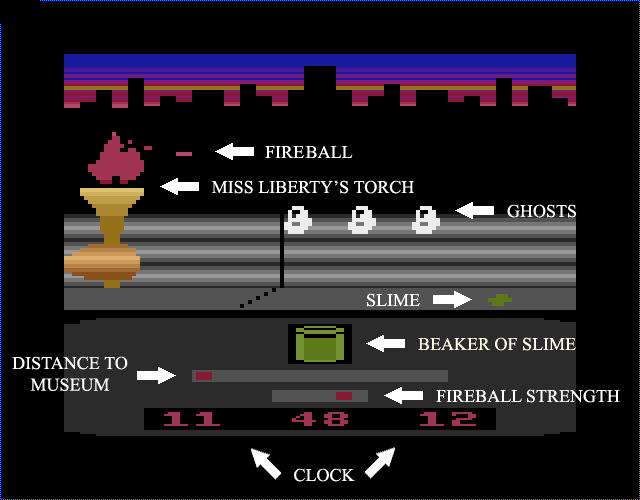 The game is copyright 1990 by Activision, but wasn't released until 1992 (by Salu), and was only released overseas. 2 versions exist, both with different start-up tunes. The manual was based off of the C-64 version (LINK), and as a result contains several errors. For example, it mentions using the space bar to toggle between your 3 weapons (Proton Beam, PKR Bomb, and PKR Shield), but you actually have to use the SELECT switch. It also mentions that on the 2nd part (Broadway), when a ghost is hit, it dissolves into globs of slime which stay until a new wave of ghosts appear, and The Ghostbusters will march out into the street to mop them up; the slime actually appears whether or not you hit a ghost, and you have to put the fireball over the slime (and press the FIRE button) to collect it. The manual mentions "toggling the joystick" to make The Ghostbusters move left and right, but they never appear in the 2nd part. The C-64 version also has a 3rd part (The Museum) that was omitted from the VCS version.
