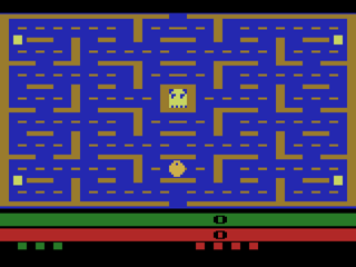 The result of that ill-fated choice was clear to all to see. VCS Pac-Man now has an eye and only faces left or right, plus he's constantly 'jawing' whether he's moving or not. He literally looks and acts like he'd been lobotomized... which isn't far from the truth. Also, fruit was condensed into a single "multi-vitamin" (and only worth 100 points), dots ballooned into large "wafers", energizers became "power pills", etc. The monsters also became similarly-colored flickering ghosts, making them very hard to see, and they're only worth 20, 40, 80, and 160 points. The ghost moniker was probably Atari's Marketing department's effort of trying to explain away the terrible flickering (a year later, Namco started calling them ghosts as well. See this article for more information.). Their eyes also constantly spin around, as though they're already zonked out on pills themselves before the game even starts. The maze looks more like Atari's Gotcha, or one of those cheap plastic maze toys, and is about as fun as walking through a long, winding queue line, or being a vendor at a stadium. The tunnels are gone, replaced with exits on the top and bottom that, when entered, cause you to disappear from the screen for a second or two before reappearing on the other side. Collision-detection is brutally unforgiving. Gone is the generous overlap offered in the arcade version; so much as brush up against a ghost here, and you become one yourself. Eating wafers or power pills, however, now require you to completely pass over them in order to eat them, and it's quite possible to nearly cover a power pill and yet be killed by a ghost just around the corner from you. The garish sounds (the "gobble" sound f/x is the same from Street Racer) and colors only added to the nightmare. In other words, it looks, sounds, and plays like it was programmed by someone who never played the original.