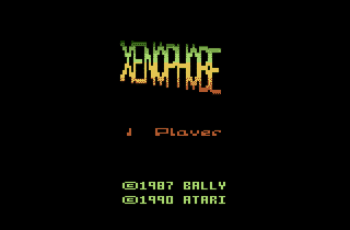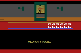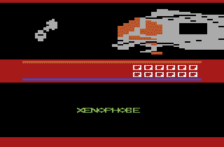 This is an excellent port of the arcade game, given the superior graphics of the original and the limitations of the VCS (even with a 16K ROM). There are 8 different stations you must travel to and clear all the xenophobes from. As you move through each station, you can pick up various objects for points or health, and better weapons or grenades. The onscreen copyright is 1990 but the game wasn't available until early 1991 and only directly from Atari. It's unknown who worked on it.