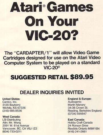 Made by Vidco International. Very similar to the Repro Game Kit by Home Vision (a copy of a copier?). The cartridge you want to copy plugs into one end, and a special blank cartridge called a Copy Cart goes into the other. 3 AA batteries power it (the Repro Cart uses a 9v battery). According to a January 1984 article in Video Games, it took 9 months to develop this copier. Due to memory limitations, not every cartridge can be copied, but the unit is fairly reliable. Dishaster was packaged with the unit, along with 1 Copy Cart. The listed entry applies to the complete set (which is usually referred to as Copy Cart, as that's the only name on the box). Originally listed in 1983 at $59.95, and later advertised for $49.95. A sealed copy sold on eBay in 2010 for $3,500.