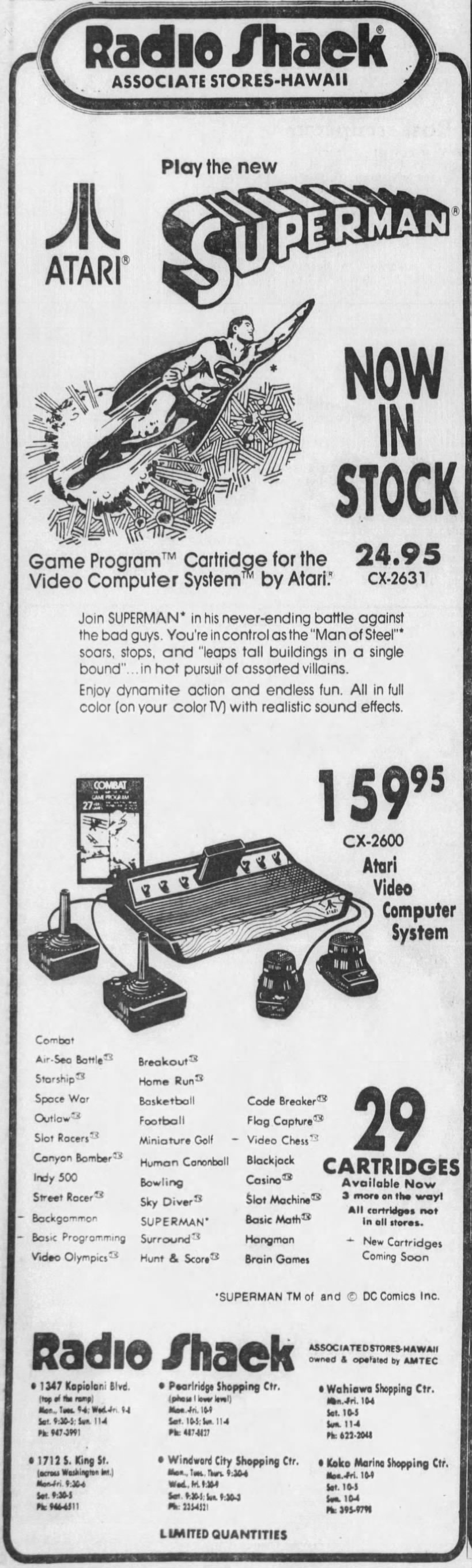 The earliest advertising found thus far are these ads from August 1st, 1977. The first is from Longs drug stores that appeared in The Times newspaper from San Mateo, CA. The VCS was listed for $170 ($169.88) with carts for $18 ($17.88). The second is from the San Diego Union newspaper.