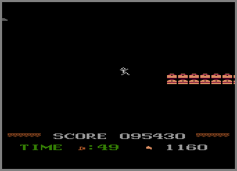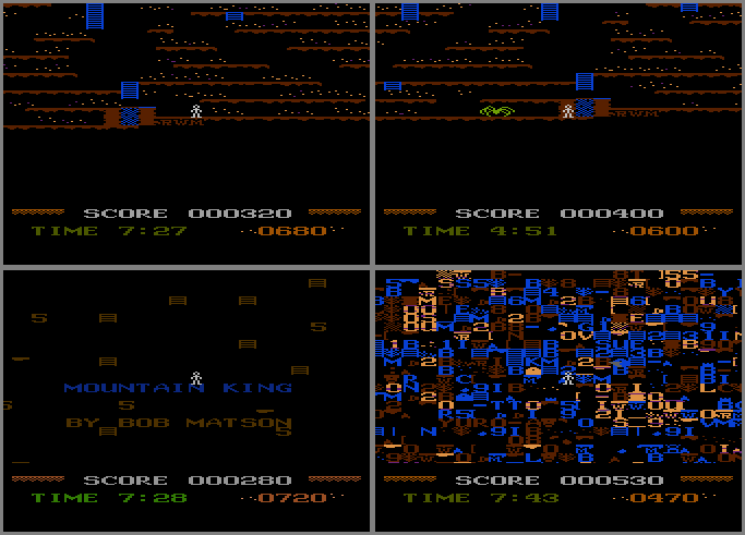 • EASTER EGG: When starting, let the opening music "demo" play completely though. Start the game and go down to the spider’s lair. Start by standing over the “M” initial (picture #1), and jump LEFT onto the thin blue line. Stand near the very right edge of this (just before falling off) and move DOWN. You will drop down a little bit (up to the top of your legs). If you then walk to the left of the blue center, you’ll fall down the rock wall (picture #2). At this point you can exit the lair either by going left or by climbing up the blue center (note that the spider can still get at you in the left rock area), but you’ll want to go over to the right rock wall, at which point you’ll drop down a bit. Walk either left or right and you’ll start falling and eventually land on top of huge letters that comprise the message: “MOUNTAIN KING BY BOB MATSON” (picture #3). If you don’t wait for the demo to play all the way through, this message won’t be there when you first start falling through the bottom, although you’ll find it in the sprite mountain. If you walk off these letters, you’ll start falling again and after about 40 seconds you’ll land on top of a huge mountain of sprite graphics (picture #4). Touching any yellow chests or fire graphics is deadly, and occasionally certain yellow letters are as well. In certain areas you’ll also be able to grab diamonds, get the flame spirit, and even increase (or decrease) your time and score! Unlike the 8-bit computer version, there’s no huge wall of treasure chests at the bottom of the first sprite mountain, just a thin line of them with a huge gap that you can pass through (provided you fall through in the right area – picture #5). When you fall through the bottom, you’ll encounter a few, small sprite mountains, and eventually you’ll land back on the real mountain (with the same odd issues the computer pirate versions have). Steve Marcovici was the first to (publicly) deduce that the spider’s lair held a secret, via an old usenet posting dated February 6th, 1984.