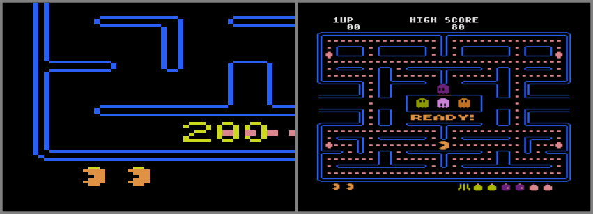 • There are some differences between the 5200 version and the 400/800 version. Besides the title screen, the 5200 version has all the intermissions and a higher sound f/x for eating dots, plus a sound f/x for earning an extra Pac-Man (at 10k). The 5200 version also plays faster.