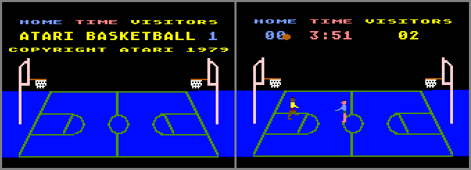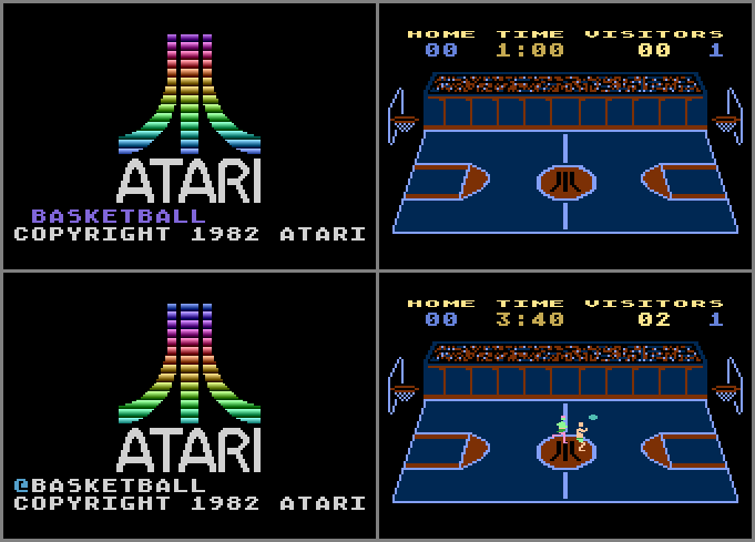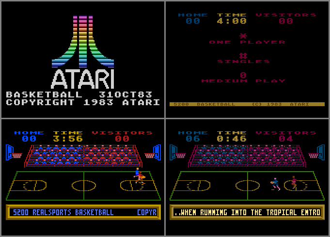 • At least 5 prototype versions exist, all of which are quite different from the 400/800 version done by Al Miller (pictures #1 and #2), but they’re all labeled as simply Basketball. They also share the same “scoreboard”. The earliest known version, dated 3-10-82 (pictures #3 and #4) looks like a remake of the original with better graphics, but it’s only a demo (with 2 1-minute quarters). The next version, dated 11-5-82 (pictures #5 and #6) is a playable demo with different sounds effects. The later 1983 prototype versions, dated 10-13-83, 10-31-83 (pictures #7 - #10), and 12-16-83 are an even better remake, with many extra features. Also, all the messages that are displayed during a game are a bit different from the 11-5-82 version. One of the main differences with the latest version (12-16-83) is that the message box at the bottom will turn different colors based on who’s leading and by how much. If it’s tied or within a few points, it will be orange. As the home side increases its lead, it will change to pink and finally purple; as the visitor side increases its lead, it will change to light green and finally green (if you score 100 points, the hundredth’s place will be ignored as far as box color, so it will look at the score as being “00”).