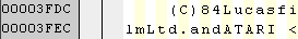 • HIDDEN MESSAGE: “(C)84LucasfilmLtd.andATARI” can be found at the end of the compiled code listing (see picture). {Scott Stilphen}