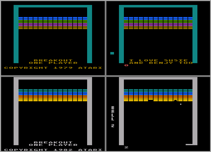 The 5200 version (pictures #3 and #4) is actually a modified version of the 400/800 version (pictures #1 and #2). Besides having a larger playfield area, colors, and copyright date, the arcade-like sound effects of the 400/800 version have been replaced. Also, the blocks melt away when hit, instead of simply disappearing.