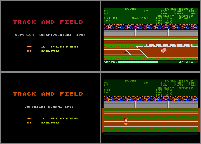 • At least 3 prototype versions exist. The title screen on the earliest-known version, dated 4-18-84, shows copyrights for both Centuri and Konami (picture #1), abbreviates “meter” as “met” (picture #2), and also contains a bug that makes it impossible to win any events. A later version, dated 4-30-84, has this bug fixed. In the latest version, dated 5-10-84 (which is identical to the 400/800 version released), the Centuri copyright was removed (picture #3) and “meter” is abbreviated as “mtr” (picture #4).