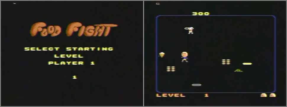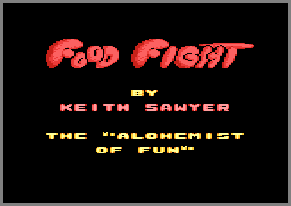 • EASTER EGG: Play a game up to at least level 23, after which select level 23 on the level select screen, and then hold the PAUSE button on the console while moving the joystick UP, DOWN, RIGHT, LEFT, UP, DOWN, RIGHT, and LEFT. The message ‘FOOD FIGHT BY KEITH SAWYER THE “ALCHEMIST OF FUN”’ will appear (picture #1). {Dan Boris}