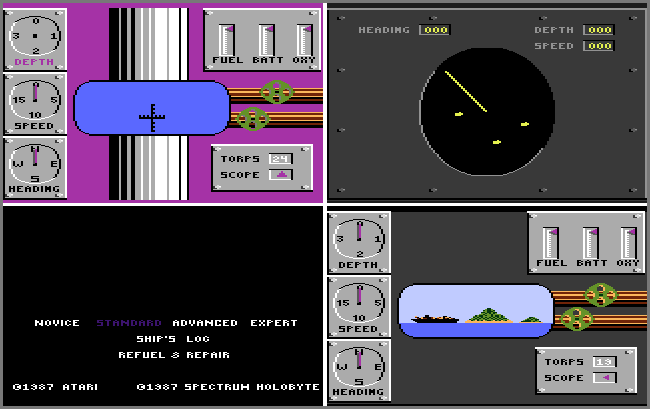 • At least 7 different prototype versions are known to exist. The 2 earliest, dated 5/23/87 and 6/11/87 (pictures #1 and #2), are nearly exact, with the exception that the gauges on the periscope screen can be selected in the later one. The 6/23/87 version has improved periscope and radar screens (pictures #3 and #4). The 7/27/87 version has a slightly changed periscope screen with gauges that now can be adjusted, and the radar screen is more functional (pictures #5 and #6). A title screen and ship log screen were added in the 11/87 version, along with animated periscope graphics (pictures #7 and #8), although the tube was removed. Later known versions, dated 12/87 and 1/88, have minor differences.