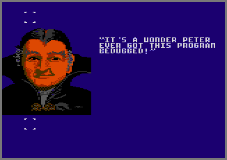 • HIDDEN MESSAGE: All the game’s text can be found in the code with a hex editor. The phrase, "IT’S A WONDER PETER EVER GOT THIS PROGRAM BEDUGGED!" (referring to programmer Peter Adams) is coded at the beginning of Grandpa Munster’s sayings. According to Don Hodges, it's not possible to trigger this message to appear unless you hack the game's code (picture #1). {Ward Shrake}