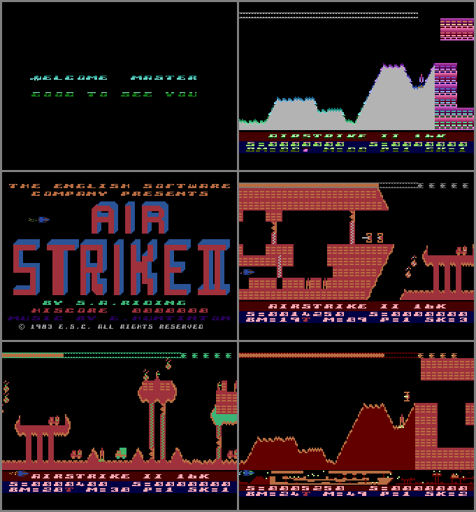 • BUG: In both the 16K and 32K versions, you can place the fighter below the playing area (pictures #5 and #6). In the 16K version, there are 2 areas in the game where you can enter down in the area just before the “AIRSTRIKE II 16K” text and safely stay there until the next possible chance to move back up, thereby allowing you to bypass some sections. This isn’t possible in the 32K version because you’ll interact with part of the radar display. {Scott Stilphen}
