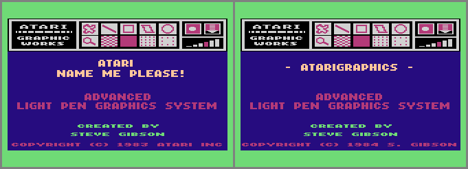 • A prototype version exists with a copyright date of 1983 (picture #1); the released version has a 1984 date (picture #2). Also, the title is simply “ATARI NAME ME PLEASE!” and the cart is noted as being the light pen version – perhaps another version exists that used the Touch Tablet or another input device?