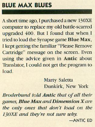 • BUG: A letter in the December 1985 issue of Antic magazine (page 8, picture #3) notes the game isn't compatible with the 130XE. Attempts to load it will result in the message "Please Remove Cartridge". Broderbund replied to say both Blue Max and Dimension X won't work, and they didn't know why.